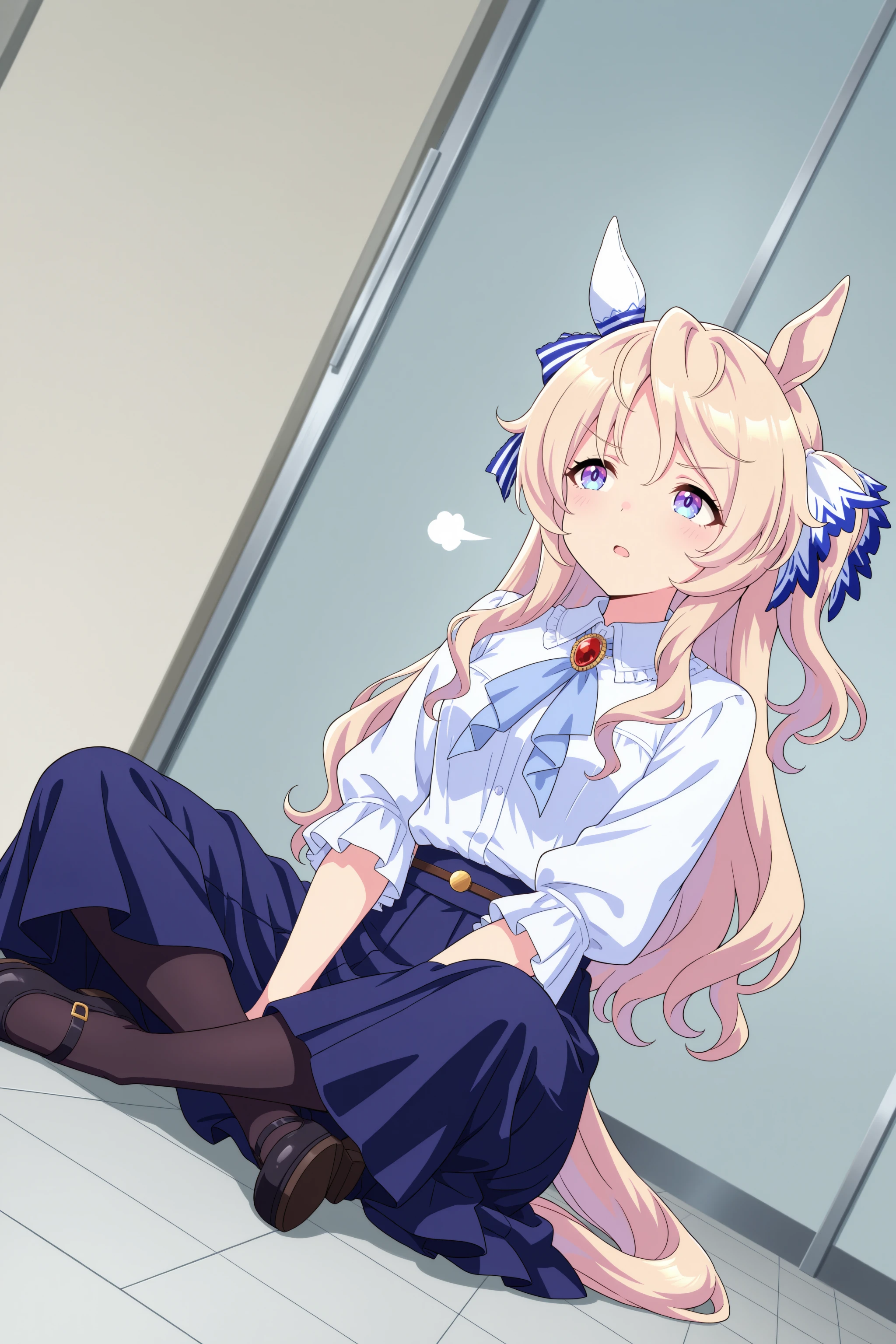 but for now, as a charm... umamusume, animal ears, horse ears, horse girl, blonde hair, wavy hair, long hair, purple eyes, ear ornament, hair bow, single ear cover, small breasts,
