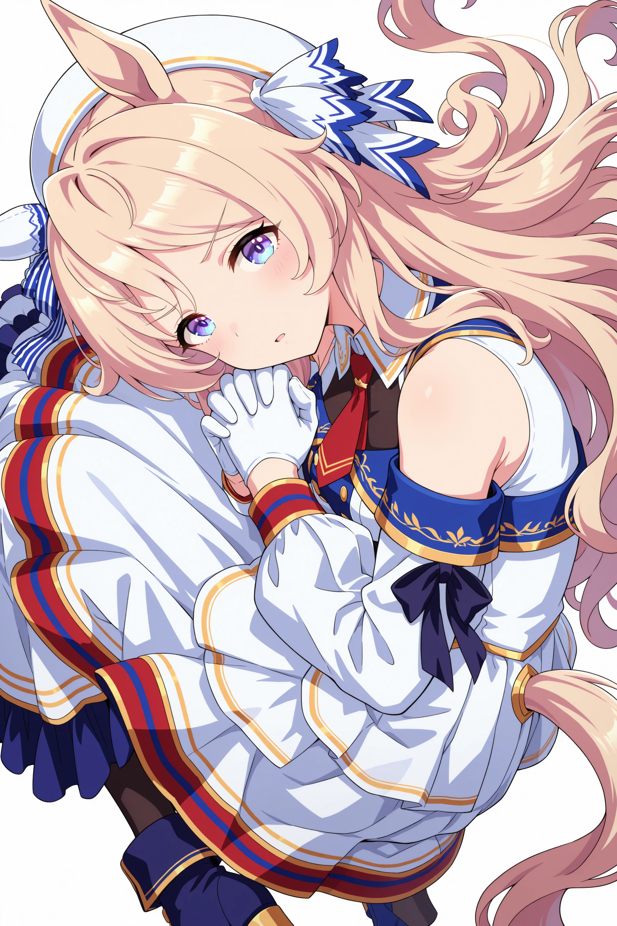 勝負服 … beret, white headwear, white gloves, bare shoulders,bow, detached sleeves, white dress, layered dress, off shoulder necktie,ribbon, long dress, gold trim, detached collar,