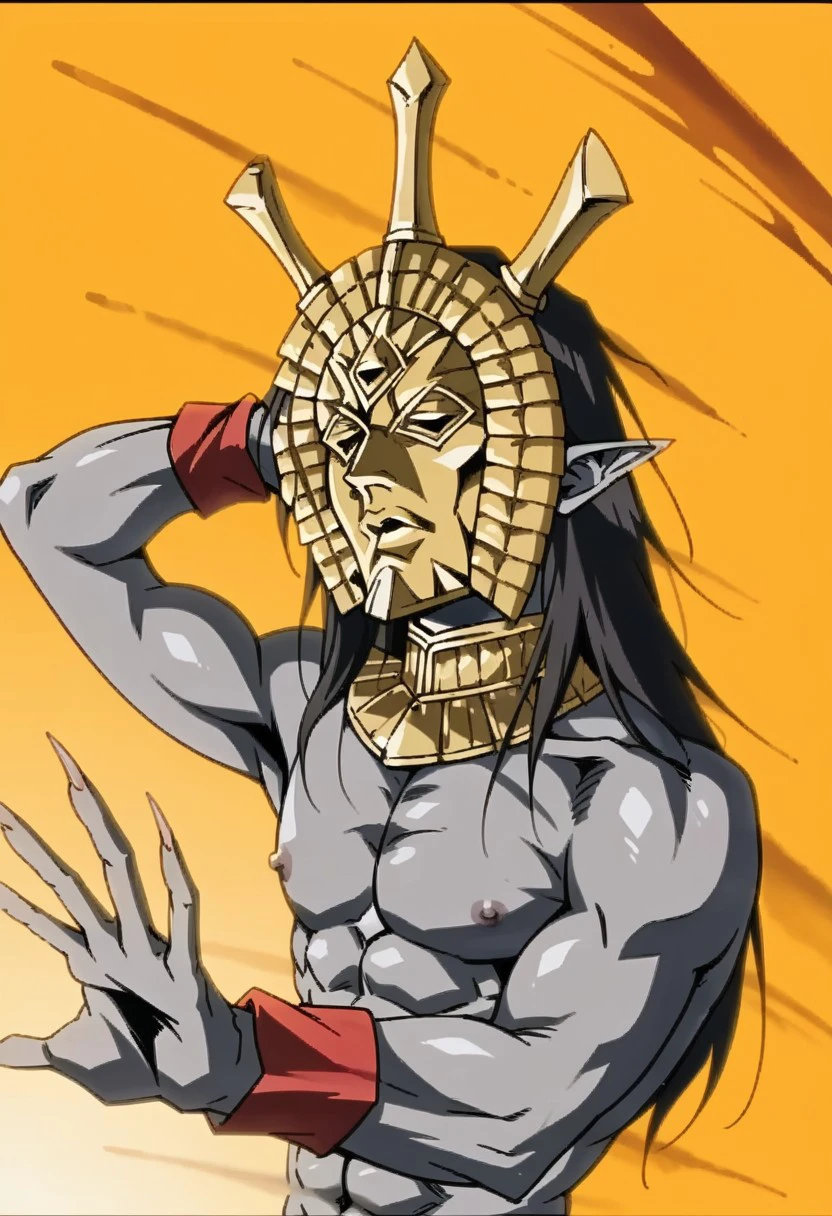 Tags: DagothUr_TES3, grey skin, colored skin, gold mask, mask, third eye, gorget, gold gorget, ??????? male, muscular, abs, belt, loincloth, bracer, long fingers, long fingernails, sharp fingernails, ankle wrap, barefoot,