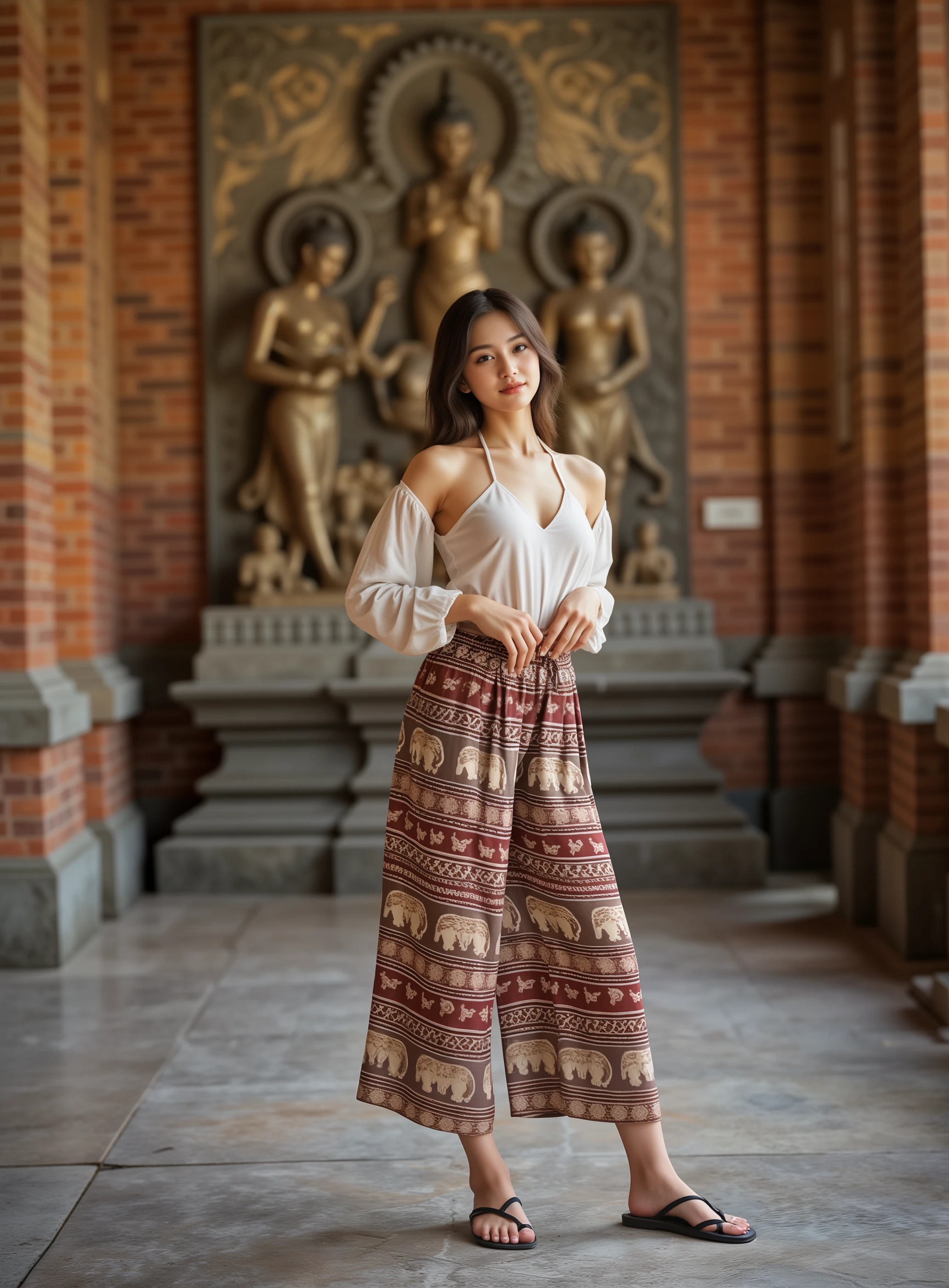 changpant, elephant patterned pants, a girl in a deep V-neck dress, walking barefoot along a deserted, moonlit beach with the ocean waves softly lapping at her legs