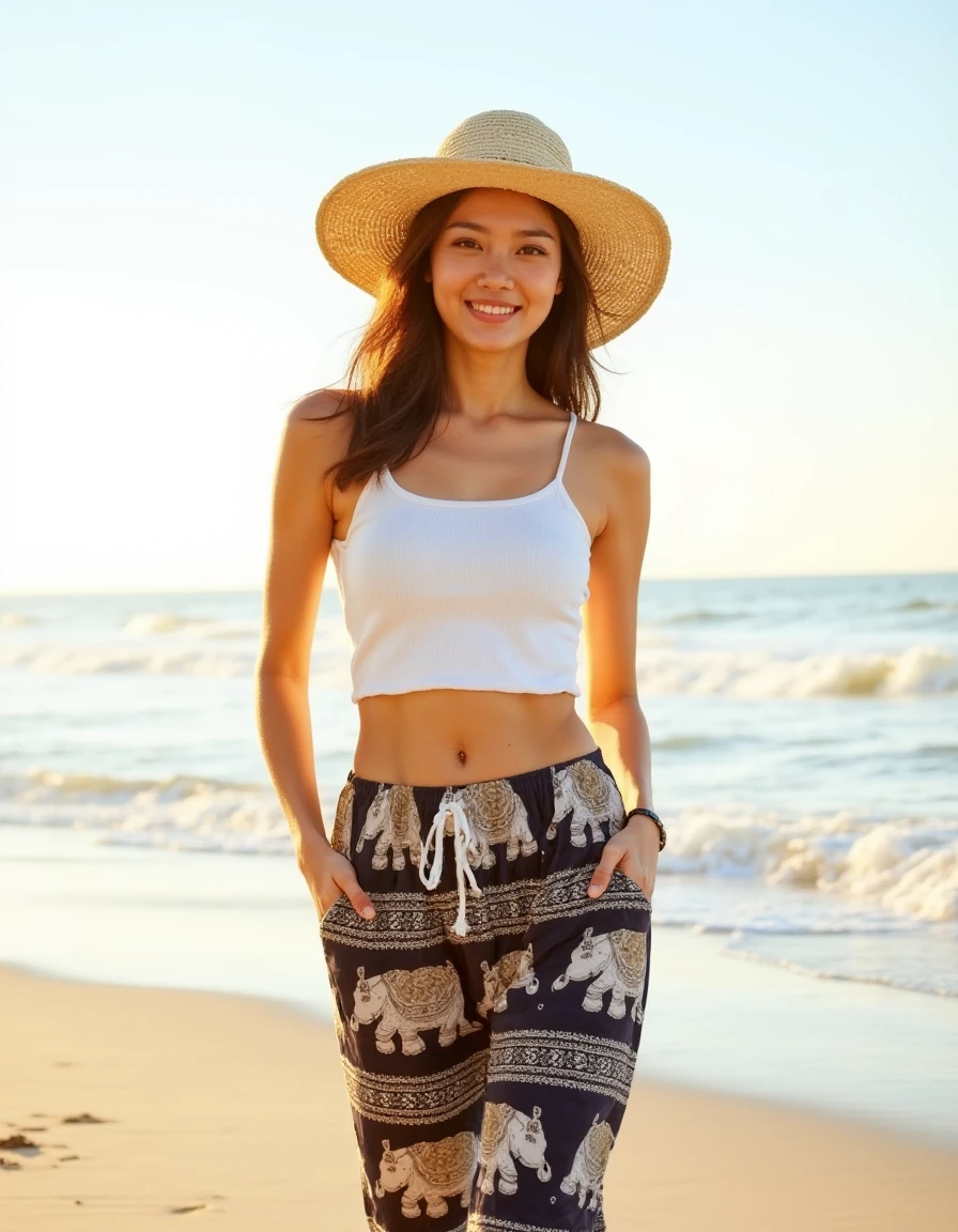 changpant, elephant patterned pants, a 25-year-old woman with long pink hair in a strappy bikini top, posing confidently on a secluded beach at twilight, the waves gently caressing her feet