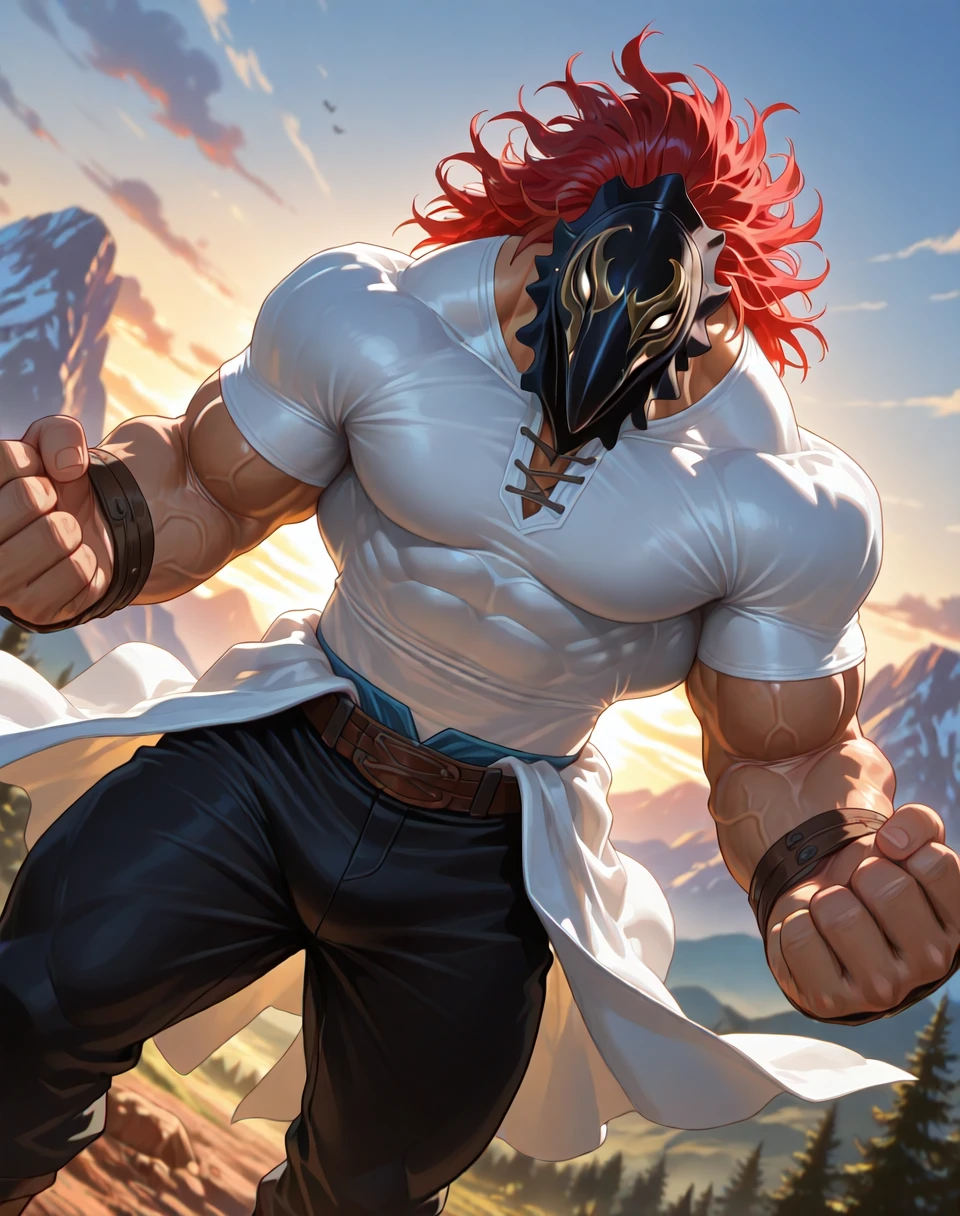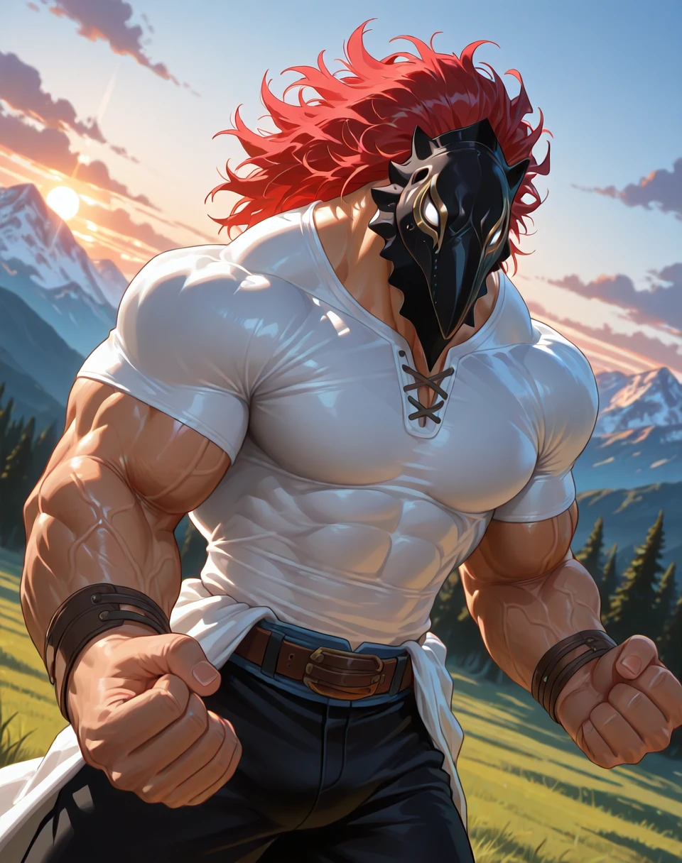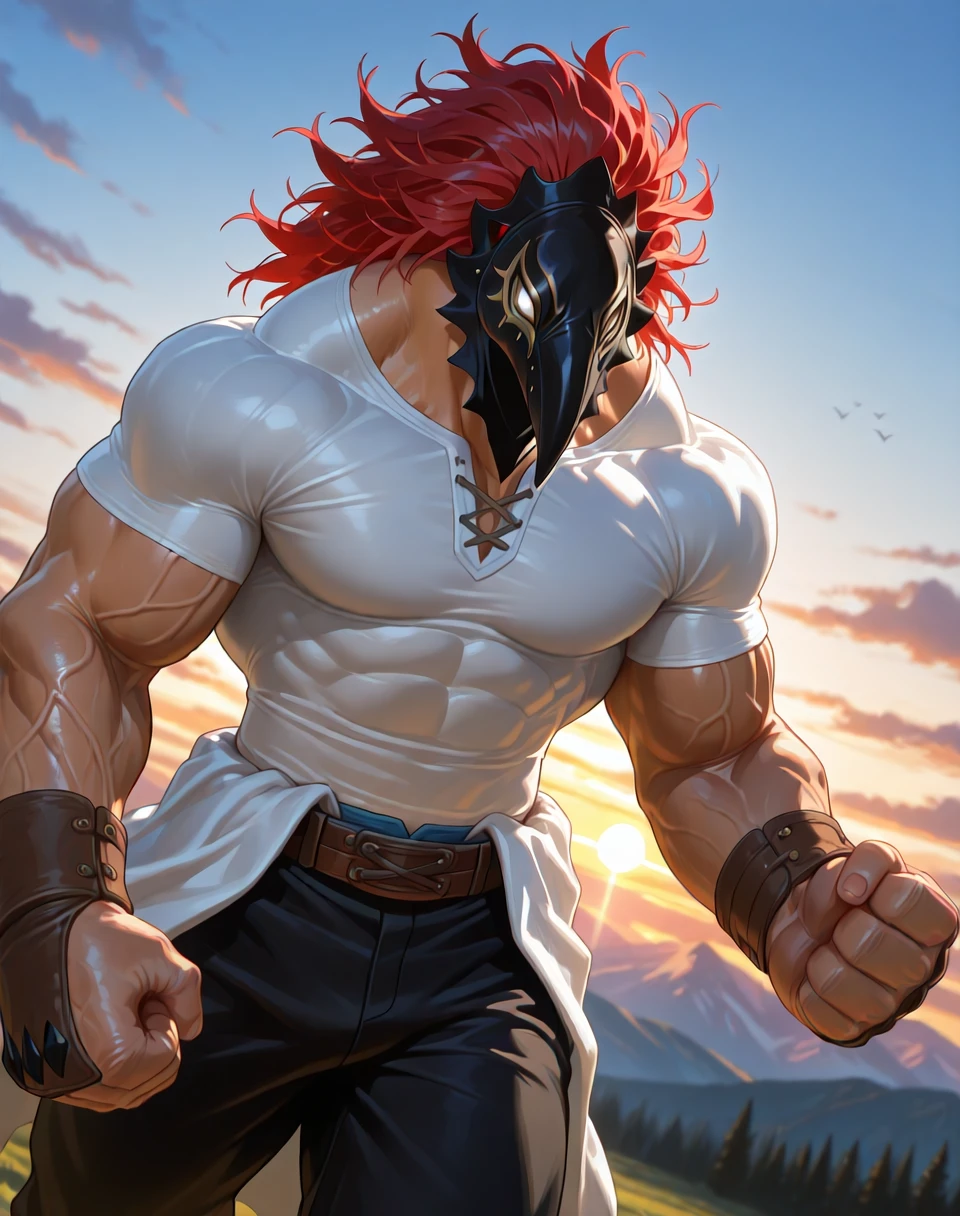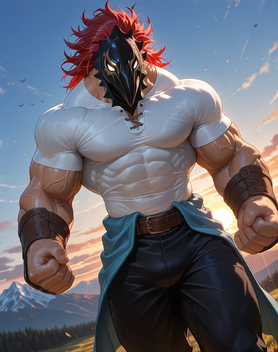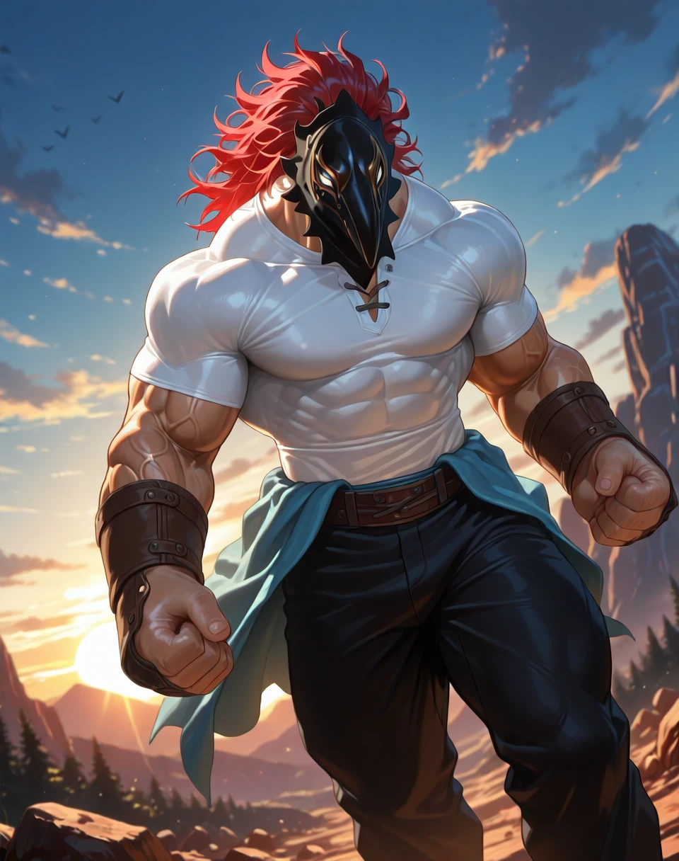 It would help to add the prompts (leathery bird mask, red hair, white printed eyes on mask, yellow line around eyes, white form fitting short sleeved tshirt, blue waist clothing, black pants, brown belt, ) in the positive prompt area, and (birds in sky, flying birds, regular birds, ) in the negative prompts area. For some reason, mentioning any sort of birds as a prompt with most checkpoints adds birds or any specific bird in the sky or next to the character.