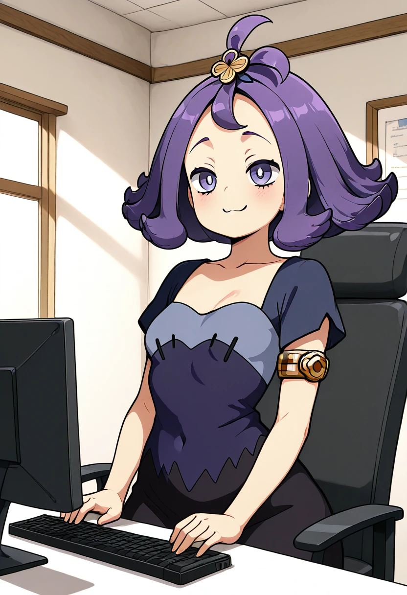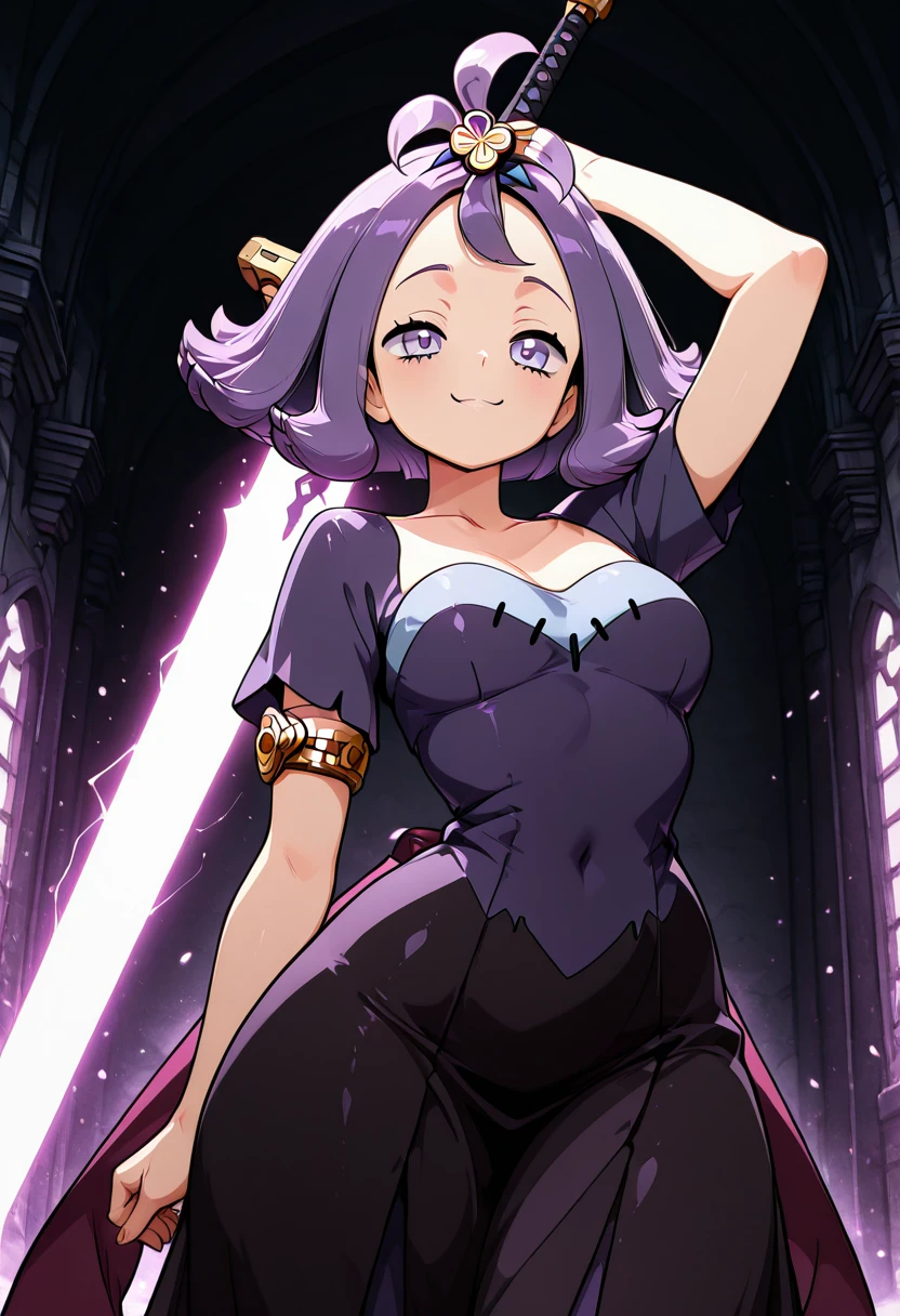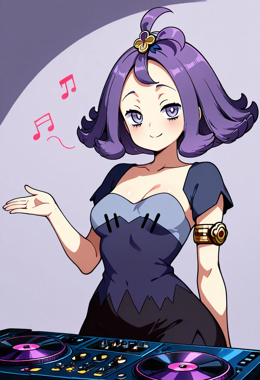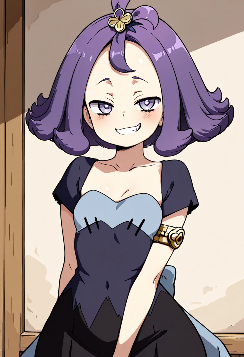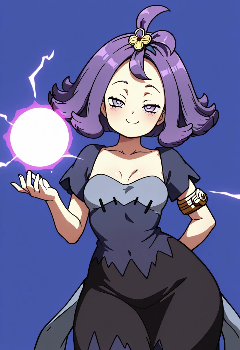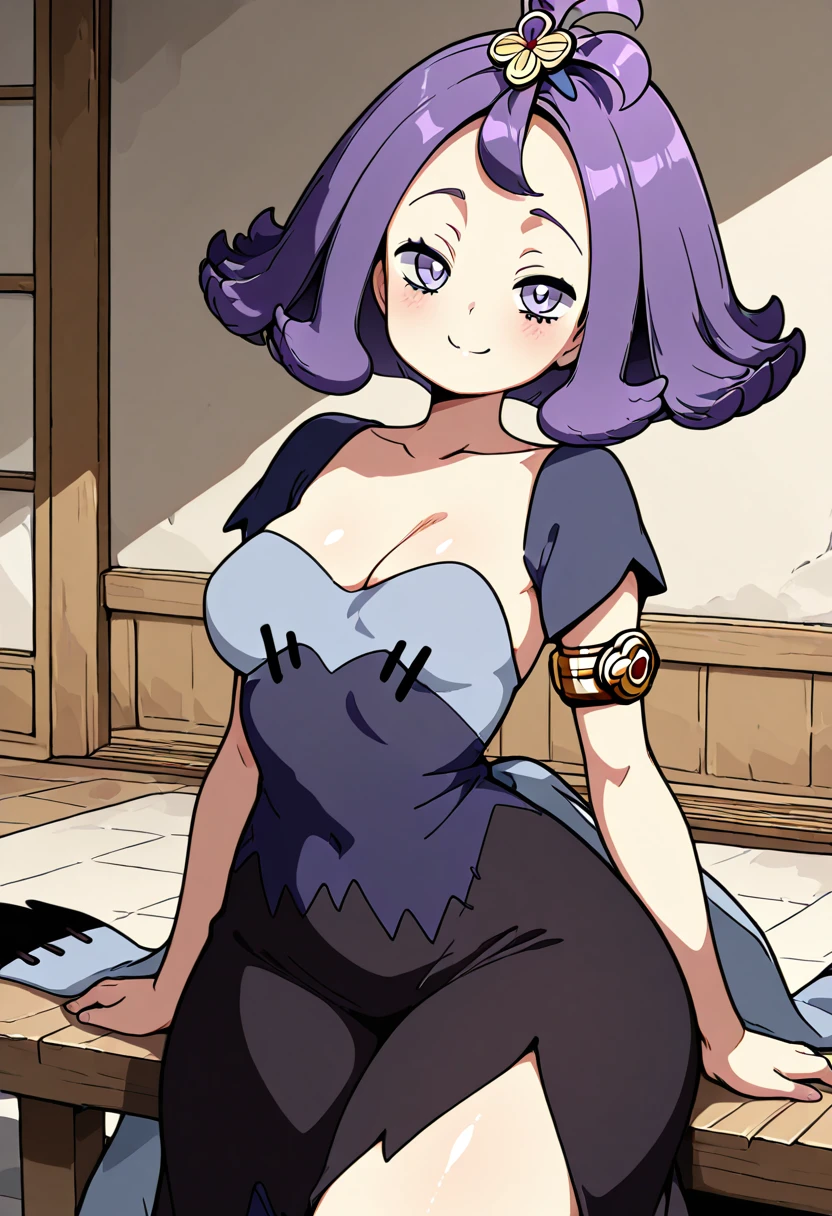 curvy, collarbone, purple dress, stitches, multicolored dress, armlet, <lora:AcerolaPokemonCSV_IXL_v2:0.8>,