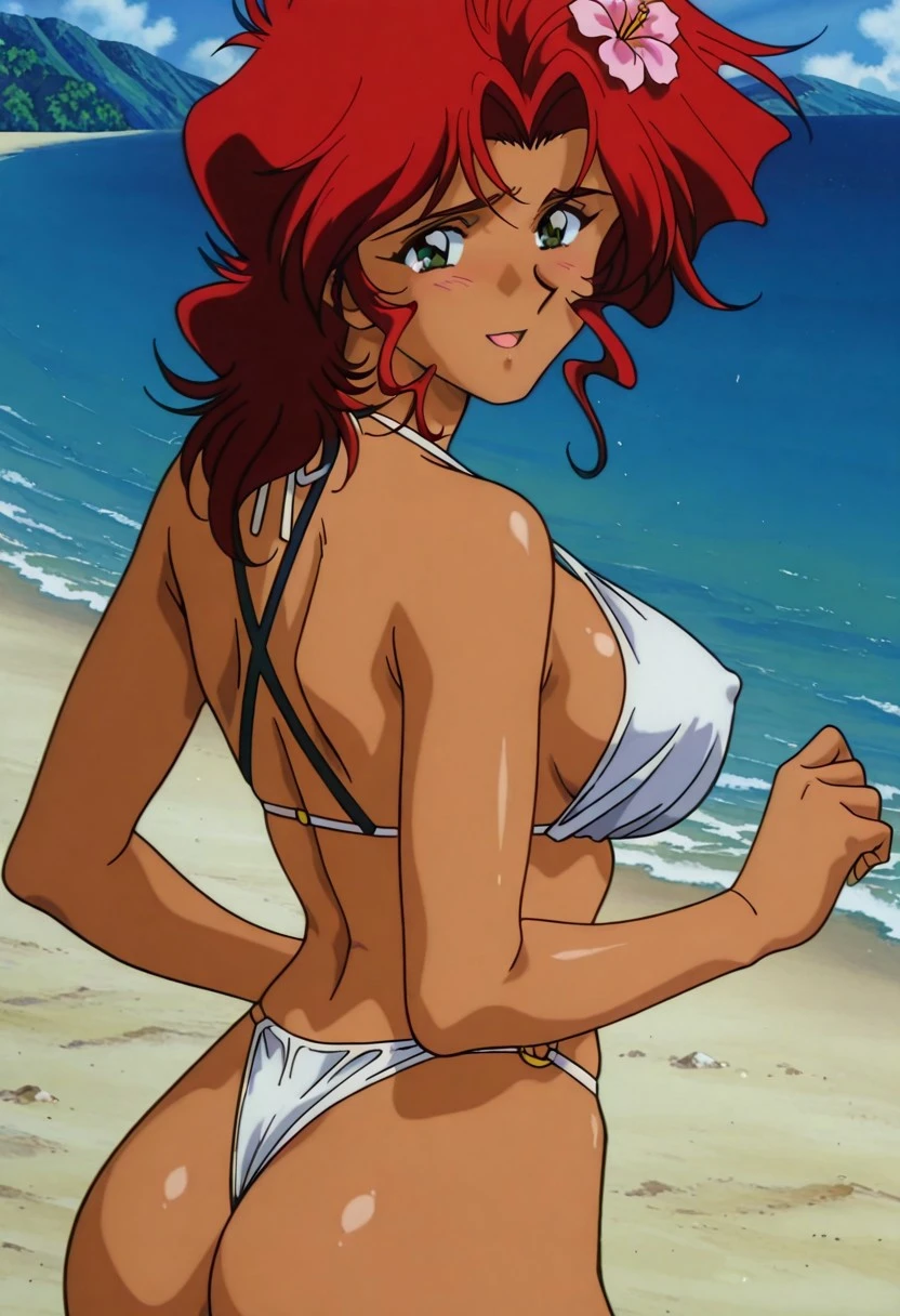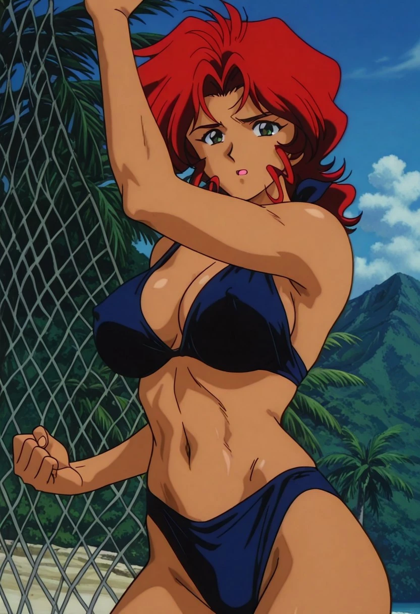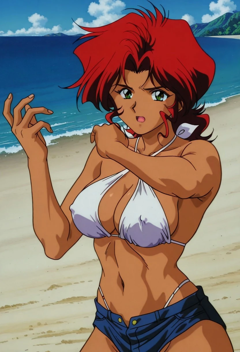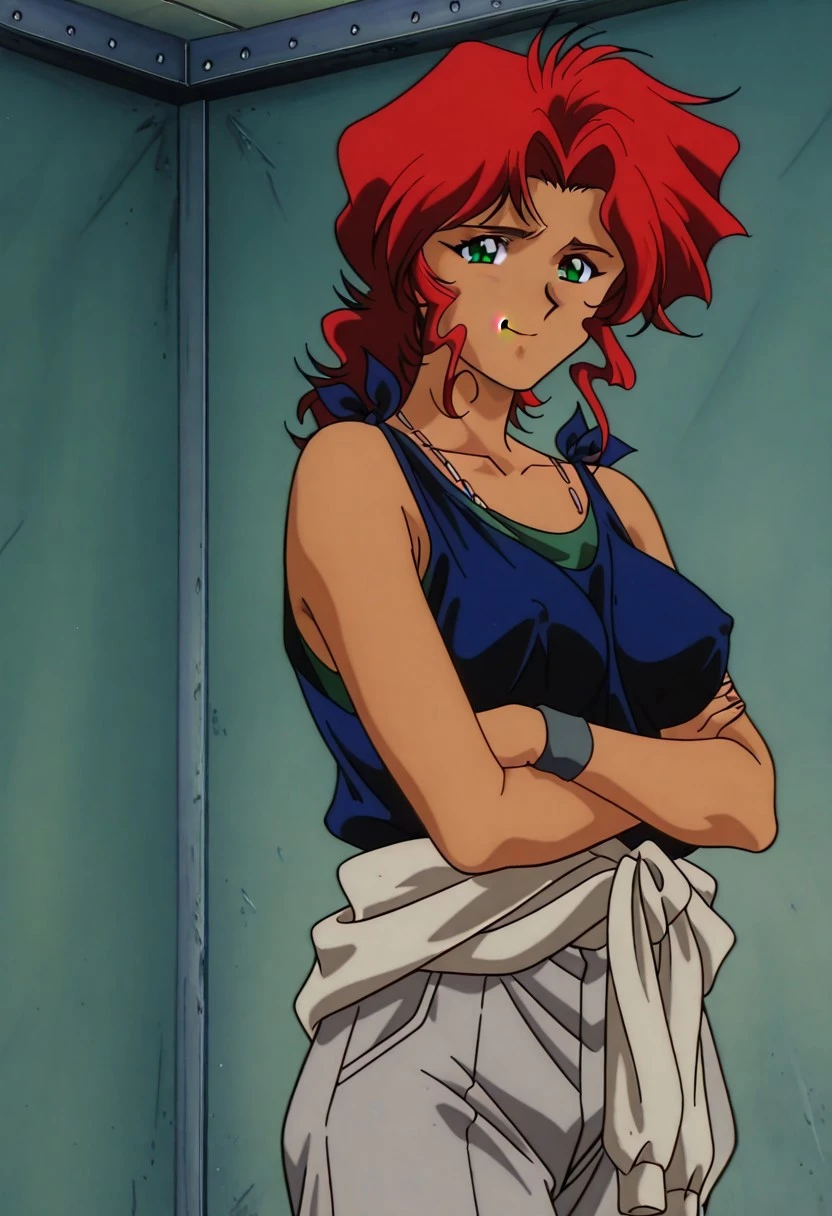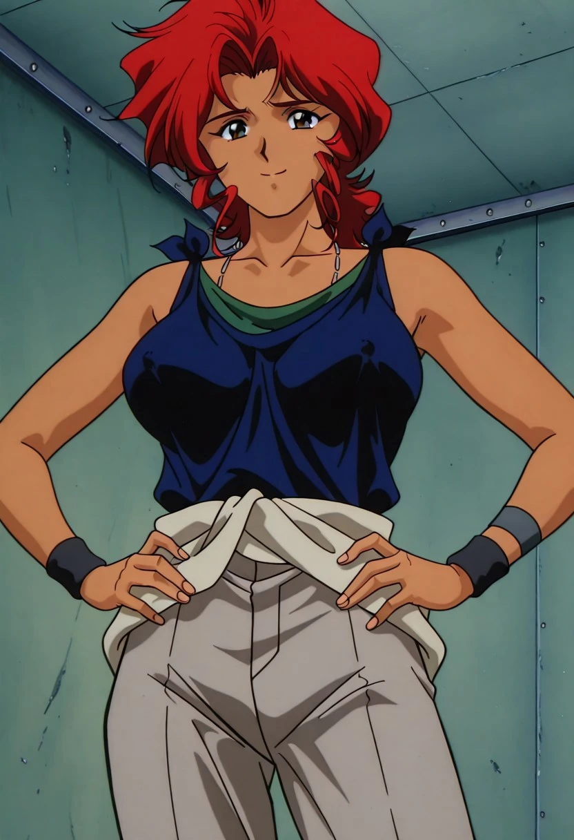 KJoshua, 1girl, red hair, retro artstyle, boots, jewelry, tank top, pants, necklace, dark-skinned female, dark skin, brown footwear, 1990s \(style\), wristband, clothes around waist, sleeveless, shirt, medium hair, breasts, grey pants, green eyes, sleeveless shirt,