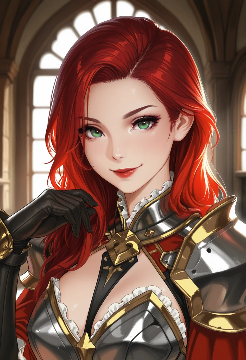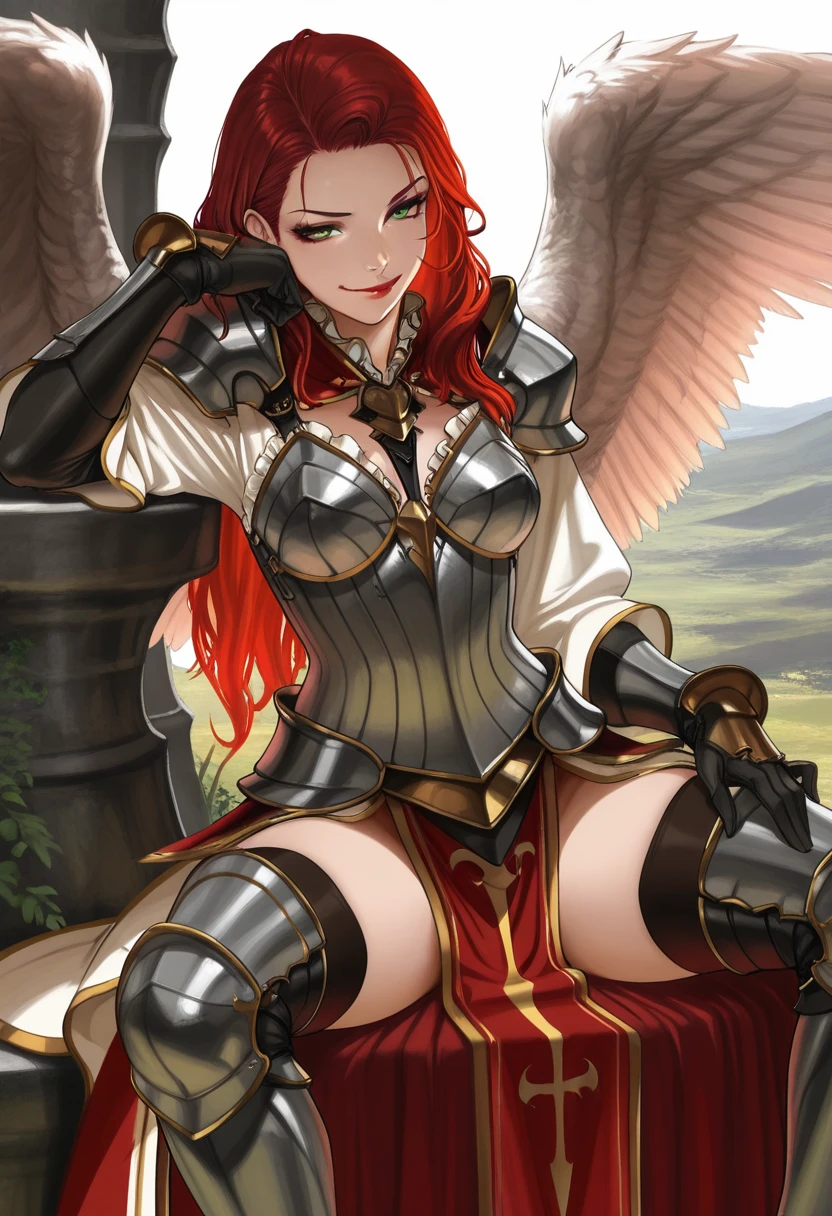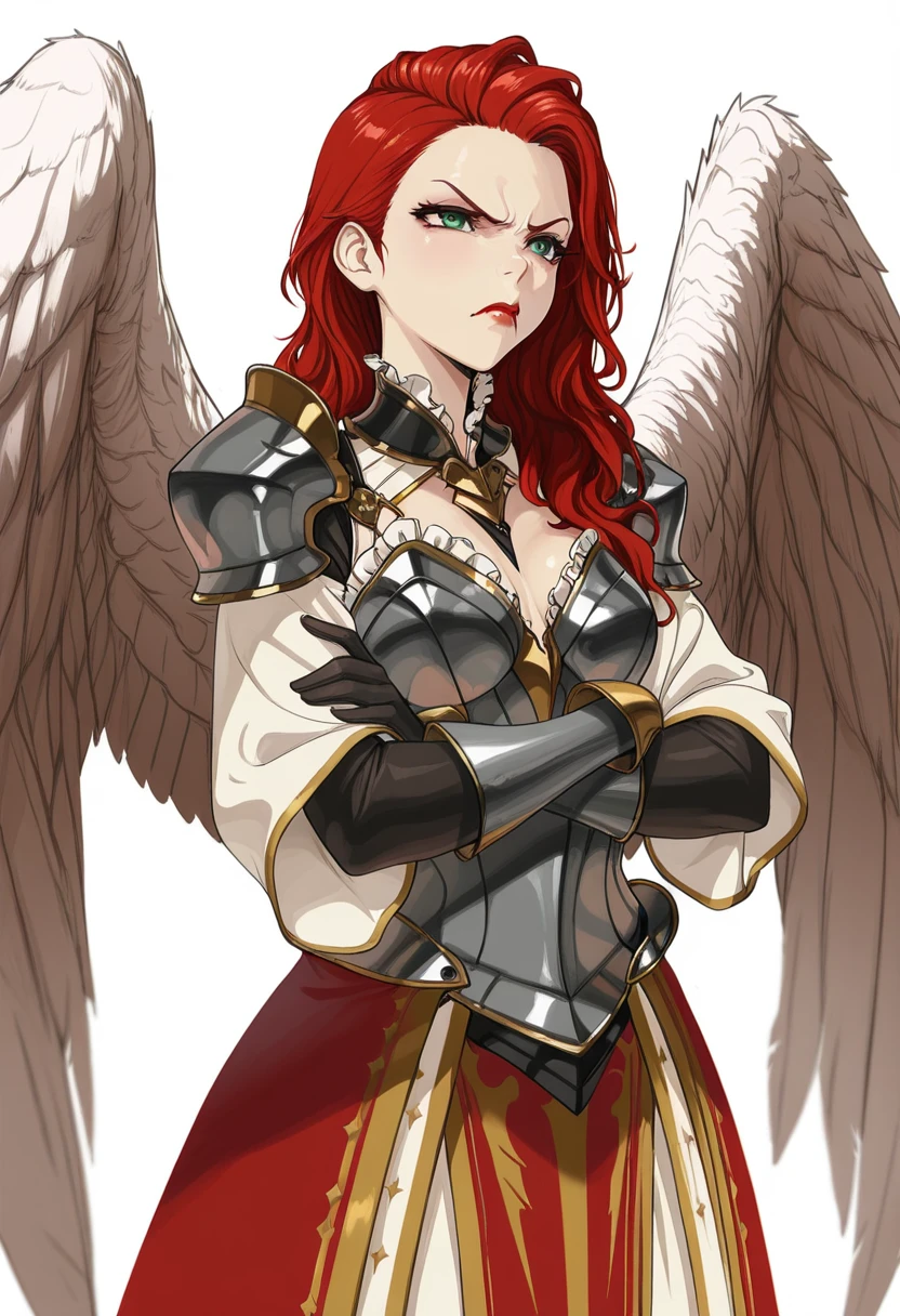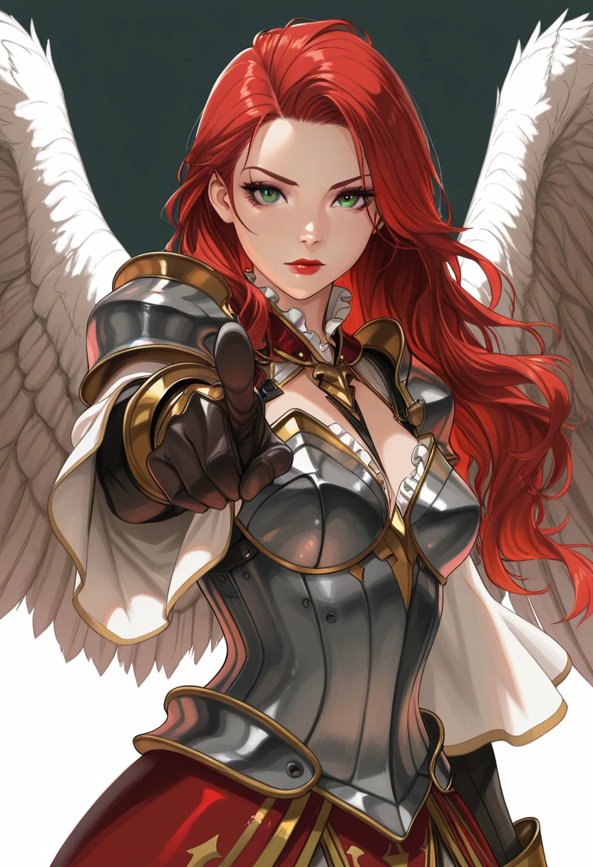 long hair, red hair, green eyes, red lips, wings, angel wings, feathered wings,