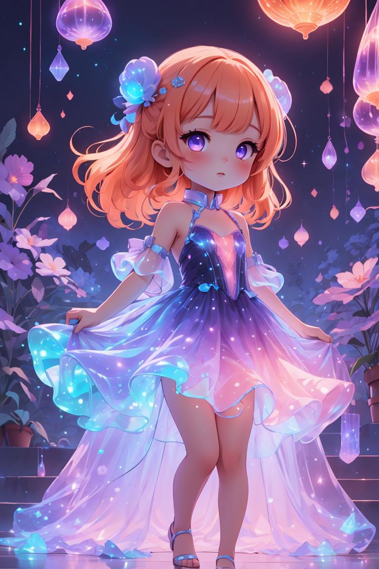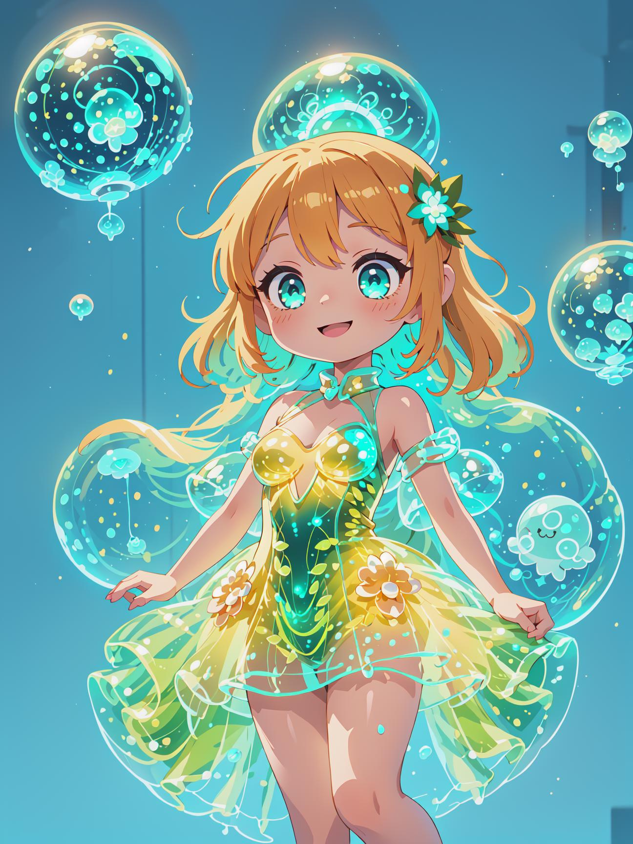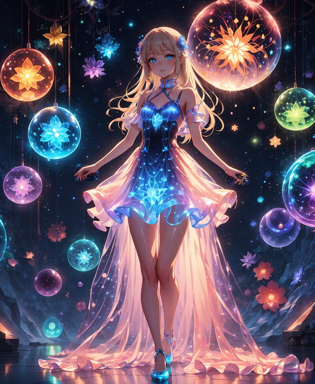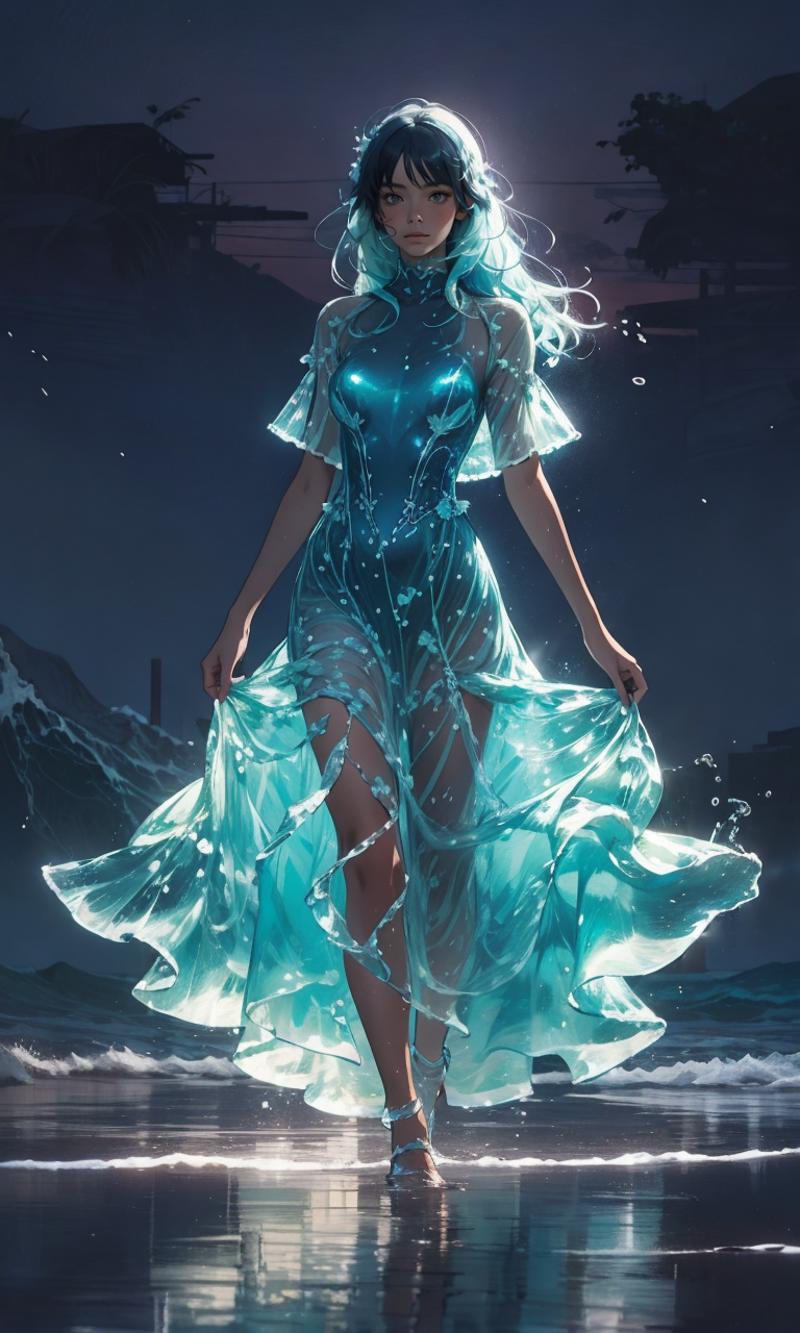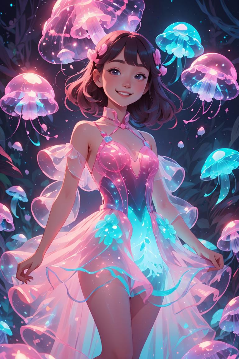 This LoRA produces outfits with a bioluminescent glow and a scyphozoan appeal. Due to bioluminescence requiring a low-light environment this LoRA has a tendency to overfit toward dark backgrounds but lowering the weight and strengthening contrary tags can help.