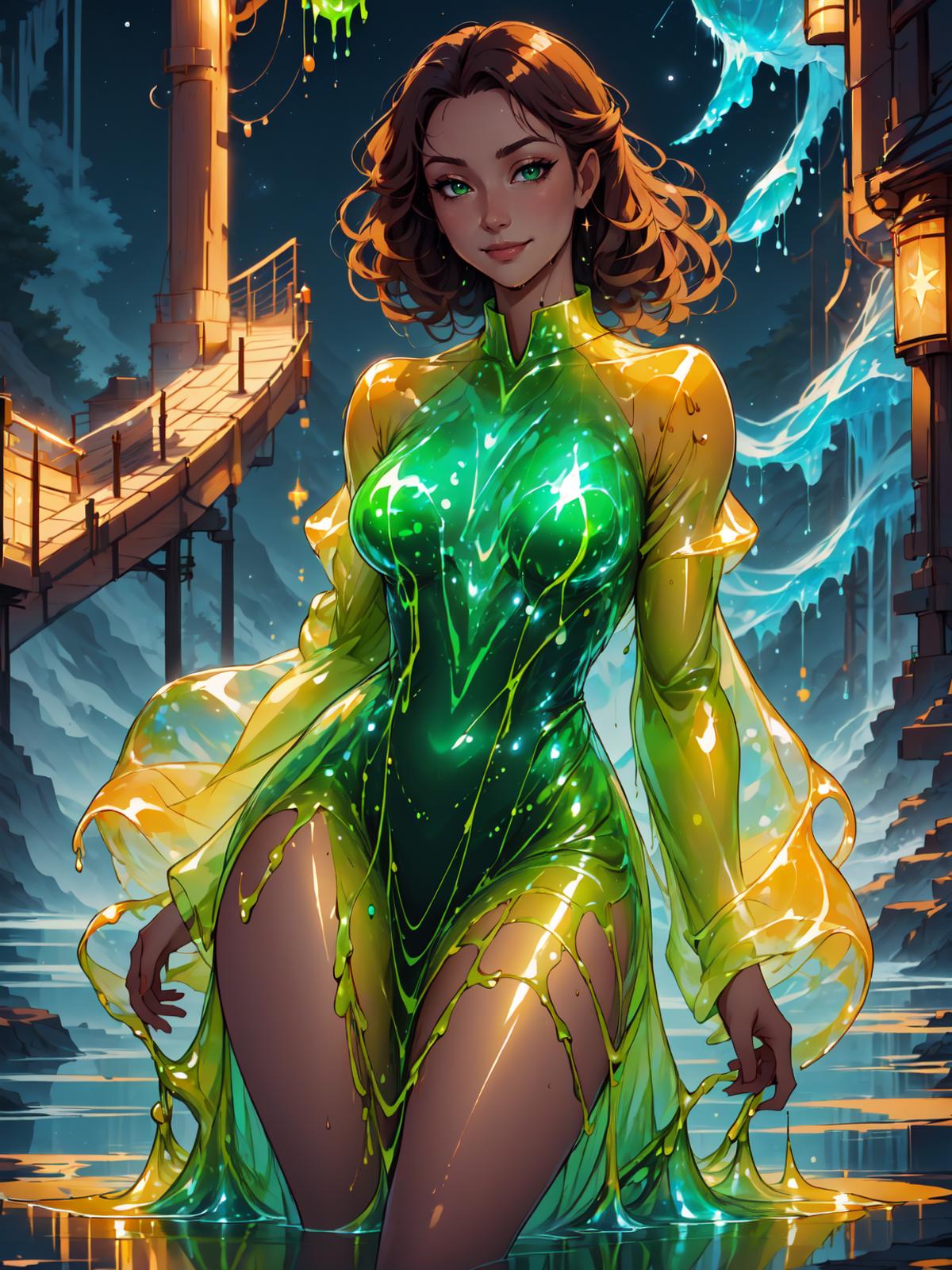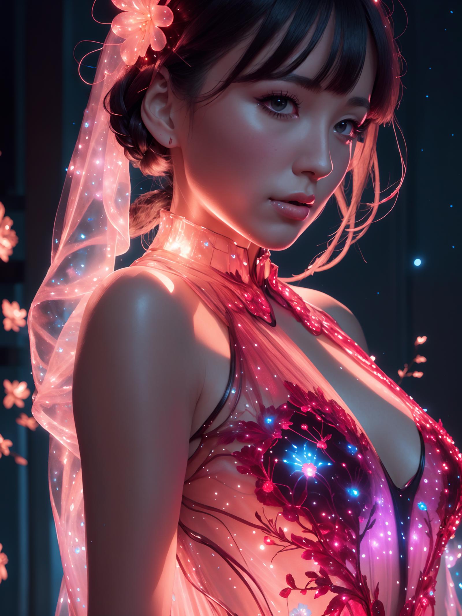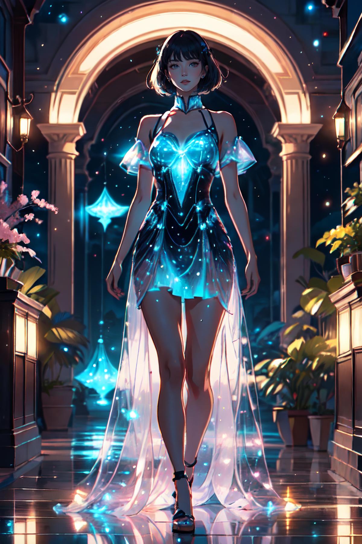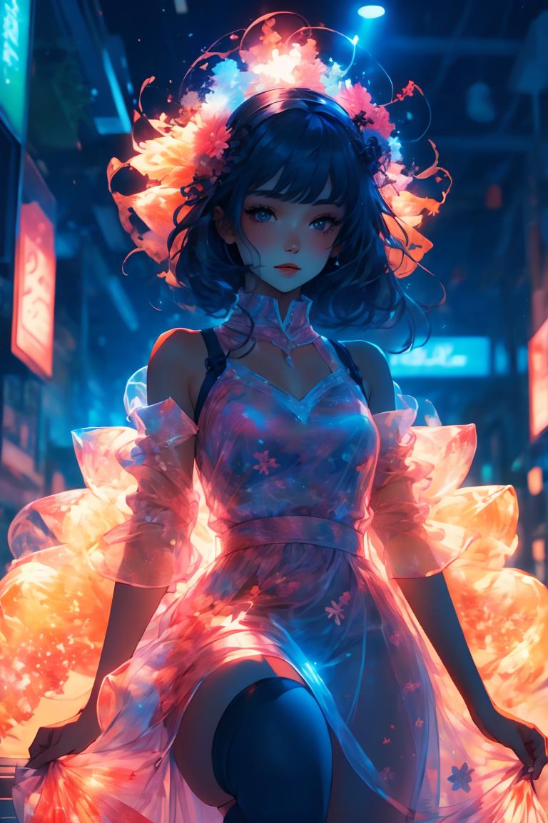 This LoRA produces outfits with a bioluminescent glow and a scyphozoan appeal. Due to bioluminescence requiring a low-light environment this LoRA has a tendency to overfit toward dark backgrounds but lowering the weight and strengthening contrary tags can help.