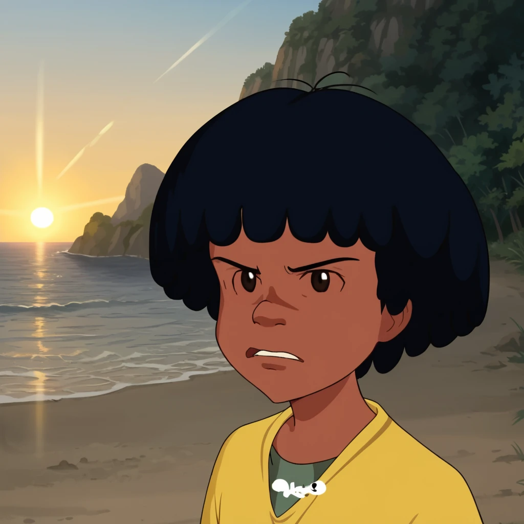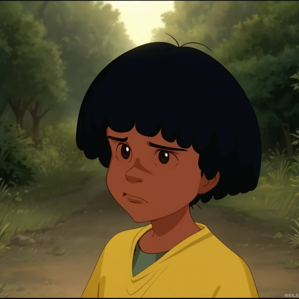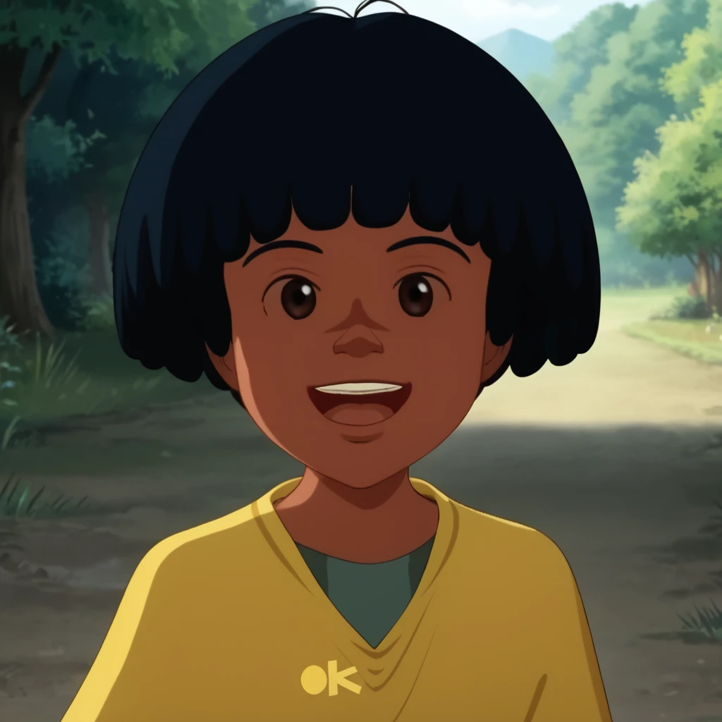 bowl cut, black hair, yellow poncho, black eyes, dark skin, dark-skinned male, poncho, short hair, sandals