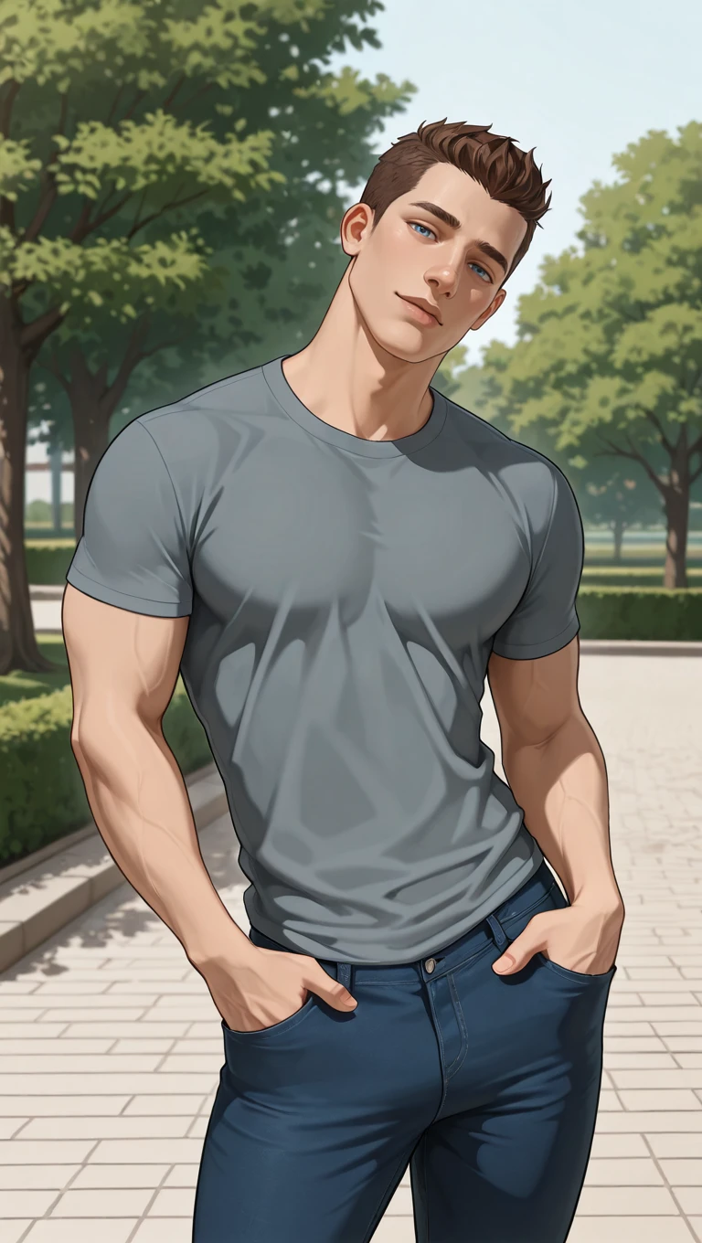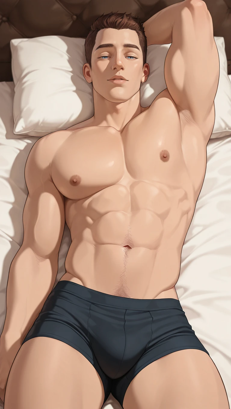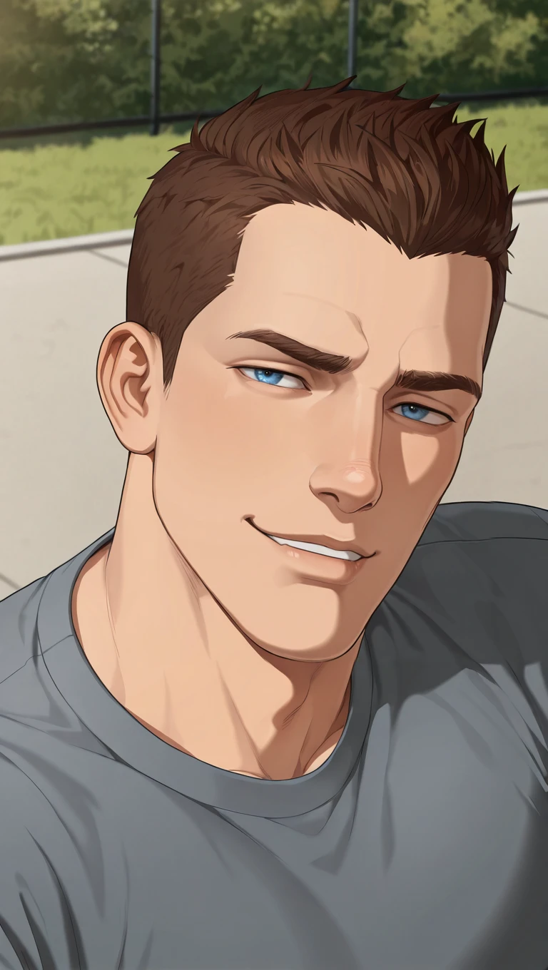 markm, 1boy, adult male, bara, brown hair, very short hair, blue eyes