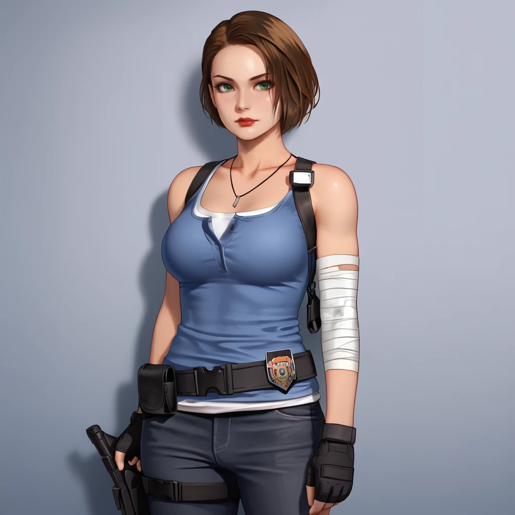 JillValentineResidentEvil3Remake, 1girl, fingerless gloves, jill valentine, brown hair, short hair, tank top, pants, bandages, large breasts, holster, jewelry, green eyes, belt, necklace, blood, denim, lips, black gloves, bare shoulders, cowboy shot