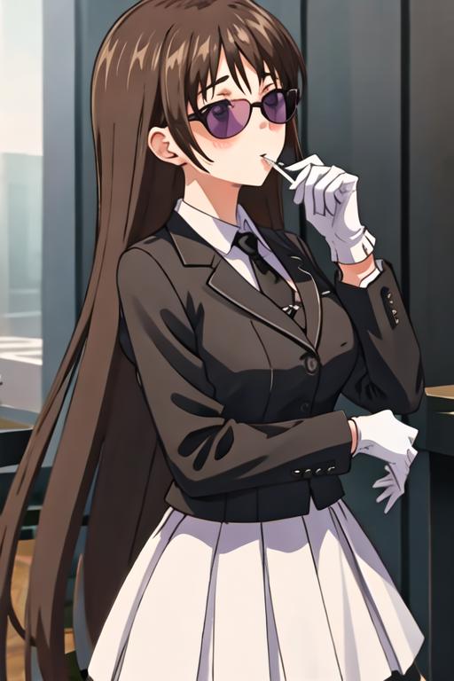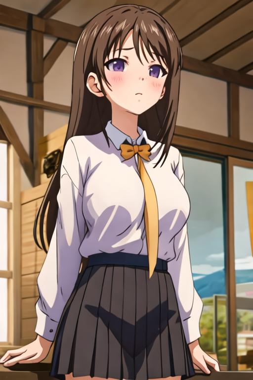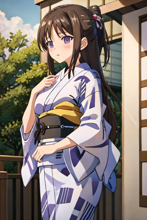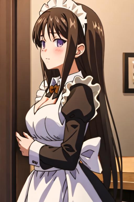 The trigger word is marina_akizuki_onichichi, and the recommended tags are best quality, masterpiece, highres, solo, {marina_akizuki_onichichi:1.15}, brown_hair, blush, long_hair, purple_eyes, breasts, large_breasts.