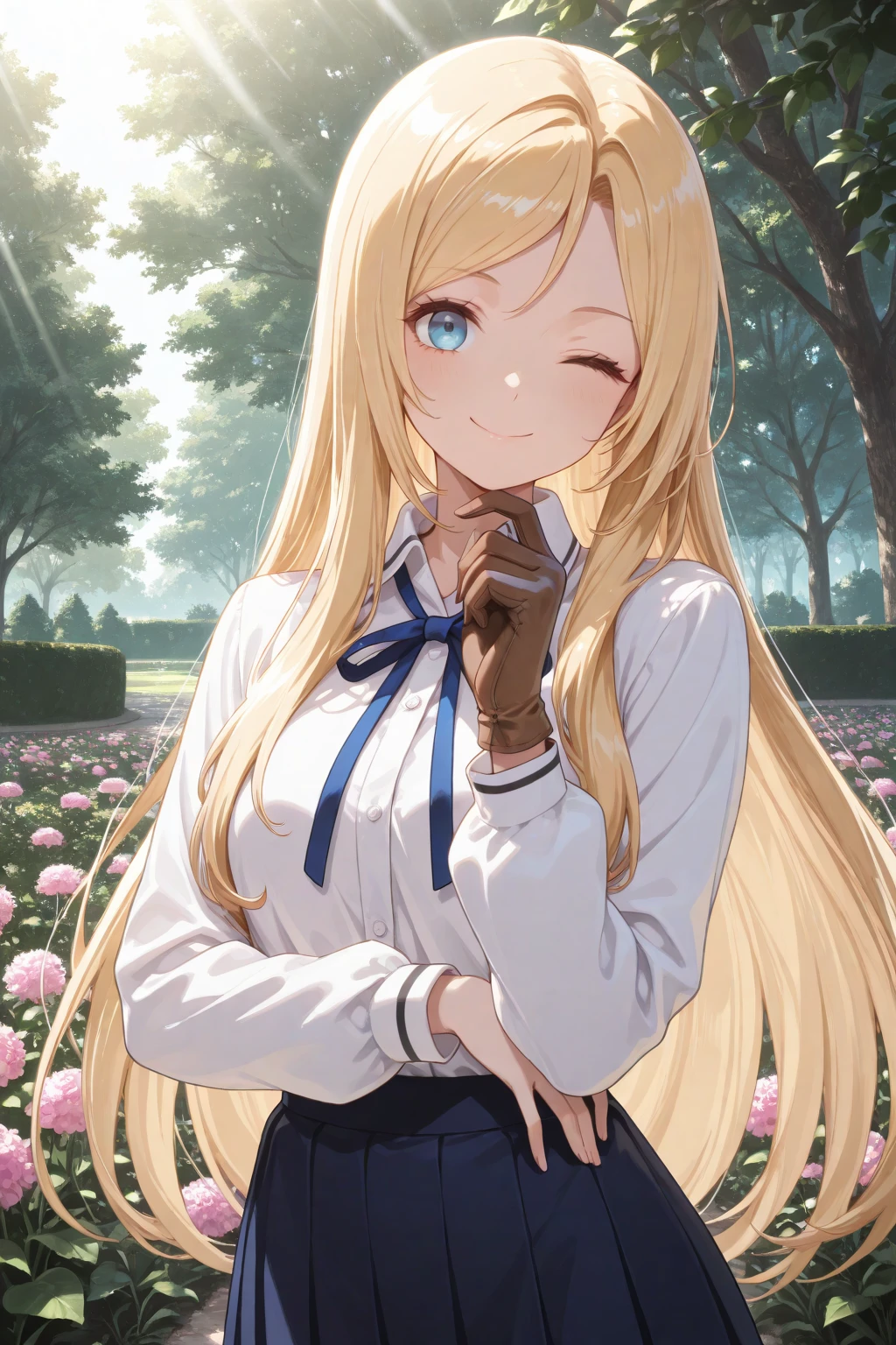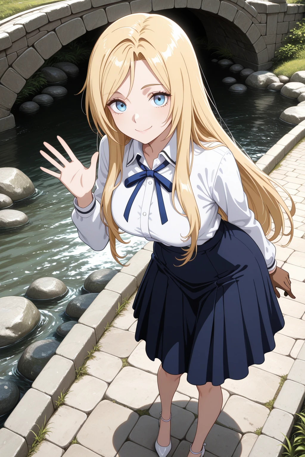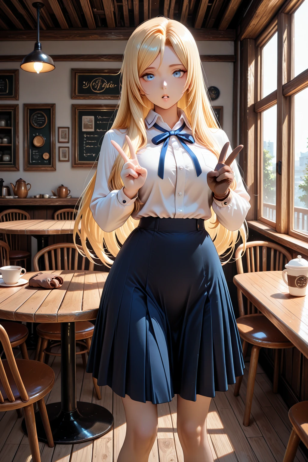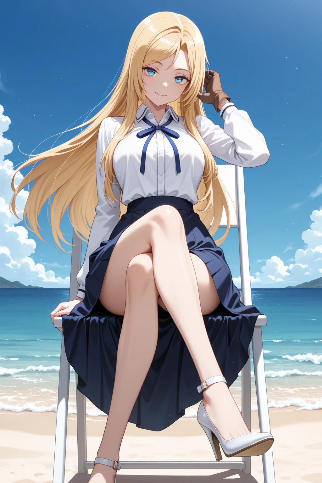 トリガーワード:N_Toriko, blonde hair, long hair, swept bangs, blue eyes, white shirt, collared shirt, long sleeves, blue neck ribbon, shirt tucked in, blue skirt, flared skirt, knee-length skirt追加:white high heels追加:brown glove, single glove, left hand glove