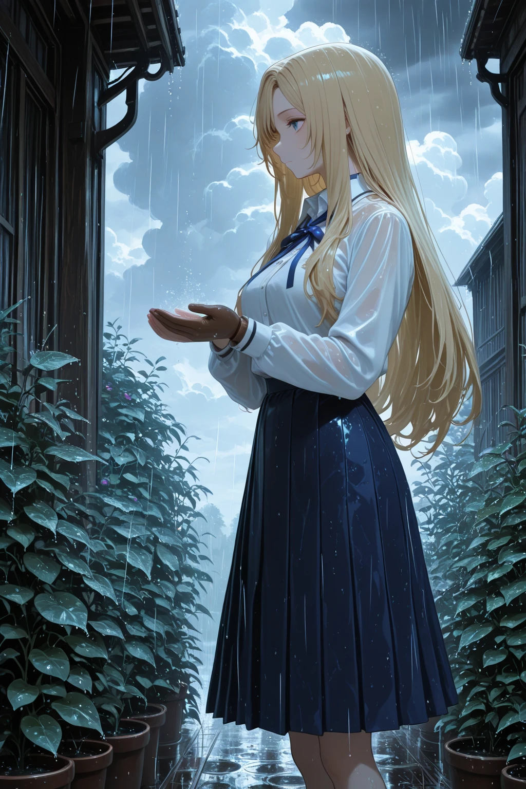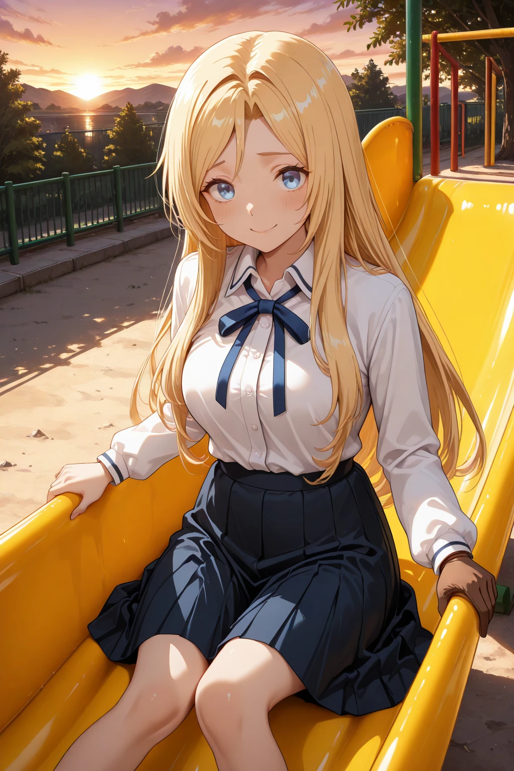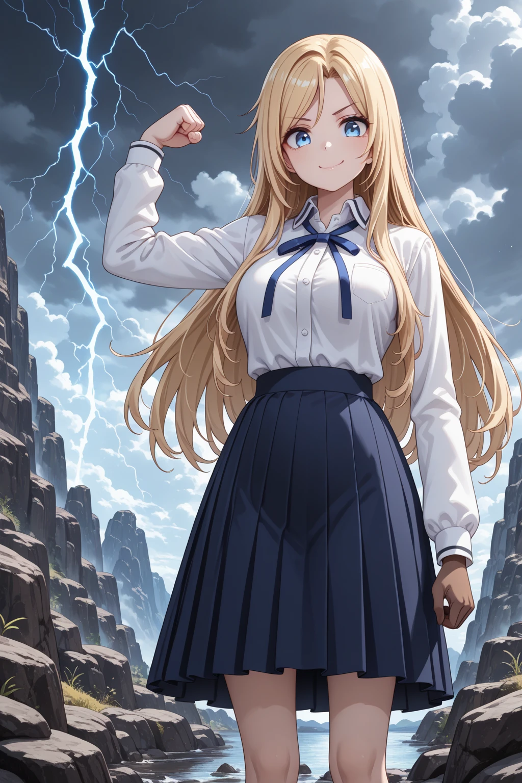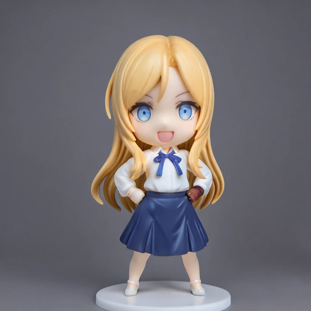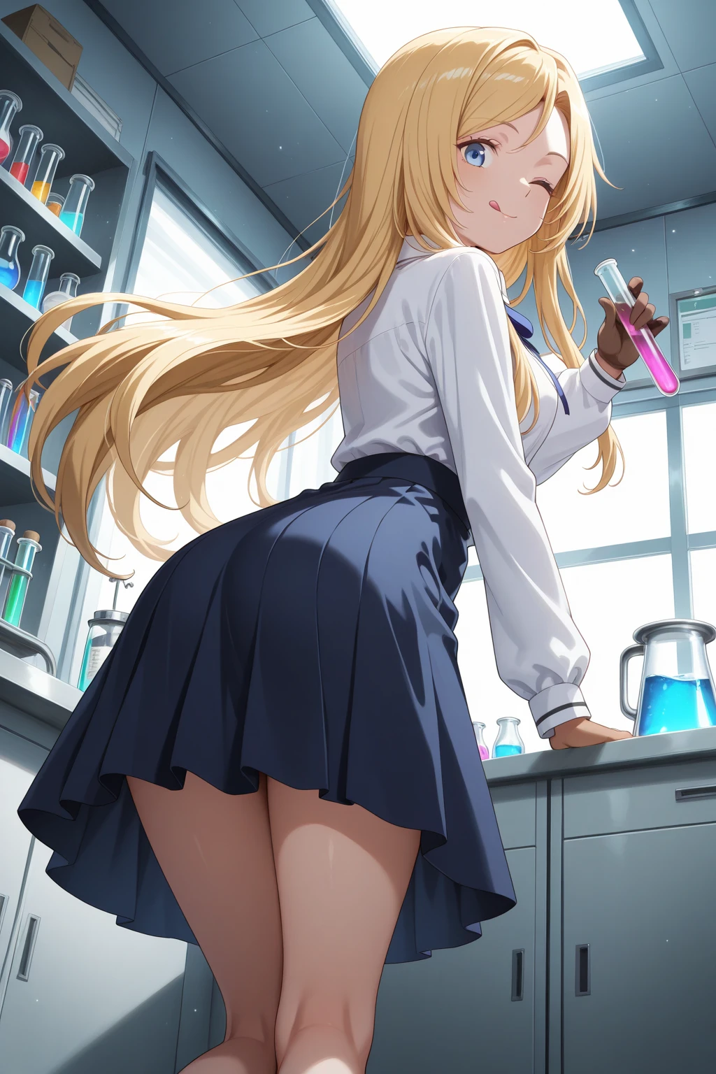 トリガーワード:N_Toriko, blonde hair, long hair, swept bangs, blue eyes, white shirt, collared shirt, long sleeves, blue neck ribbon, shirt tucked in, blue skirt, flared skirt, knee-length skirt追加:white high heels追加:brown glove, single glove, left hand glove