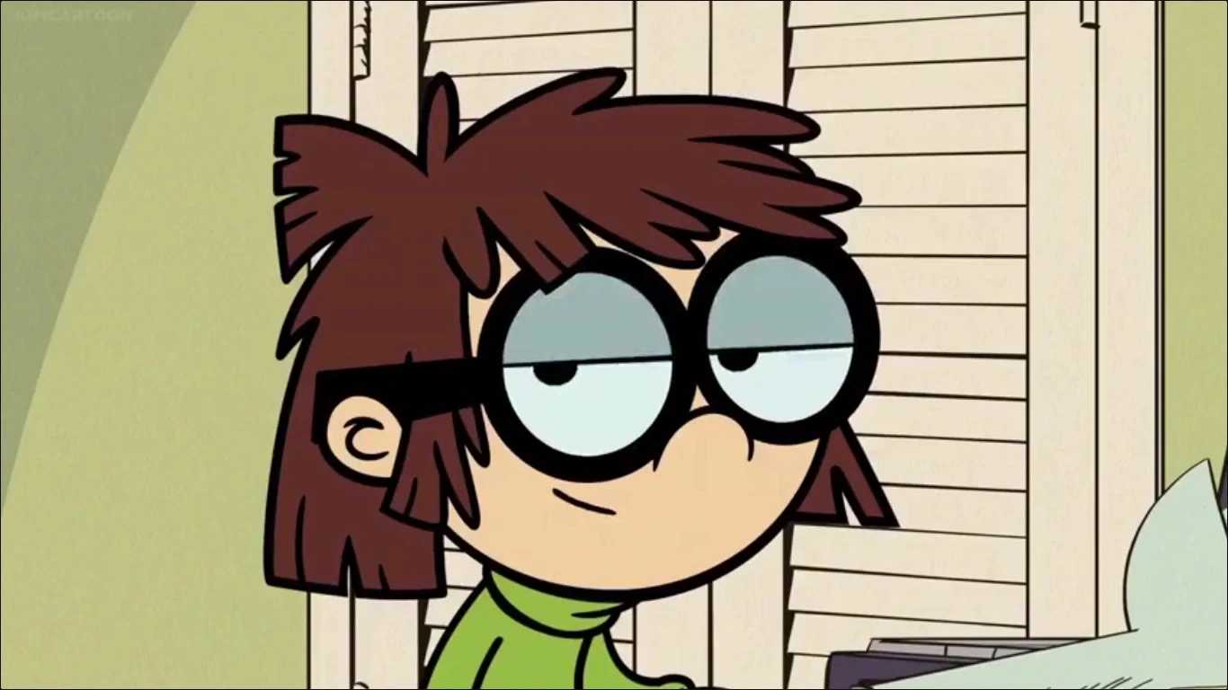 Lisa Loud, girl, small breasts, short hair, thick glasses, black glasses, round nose, thick thighs, bright green sweater, light brown pants