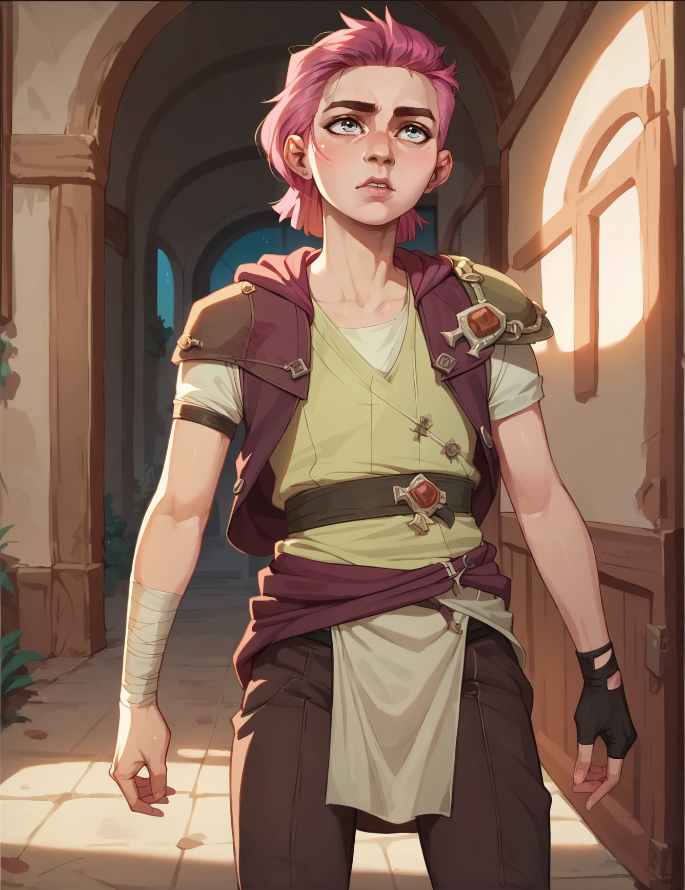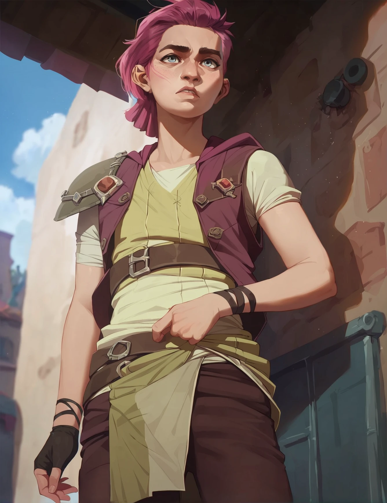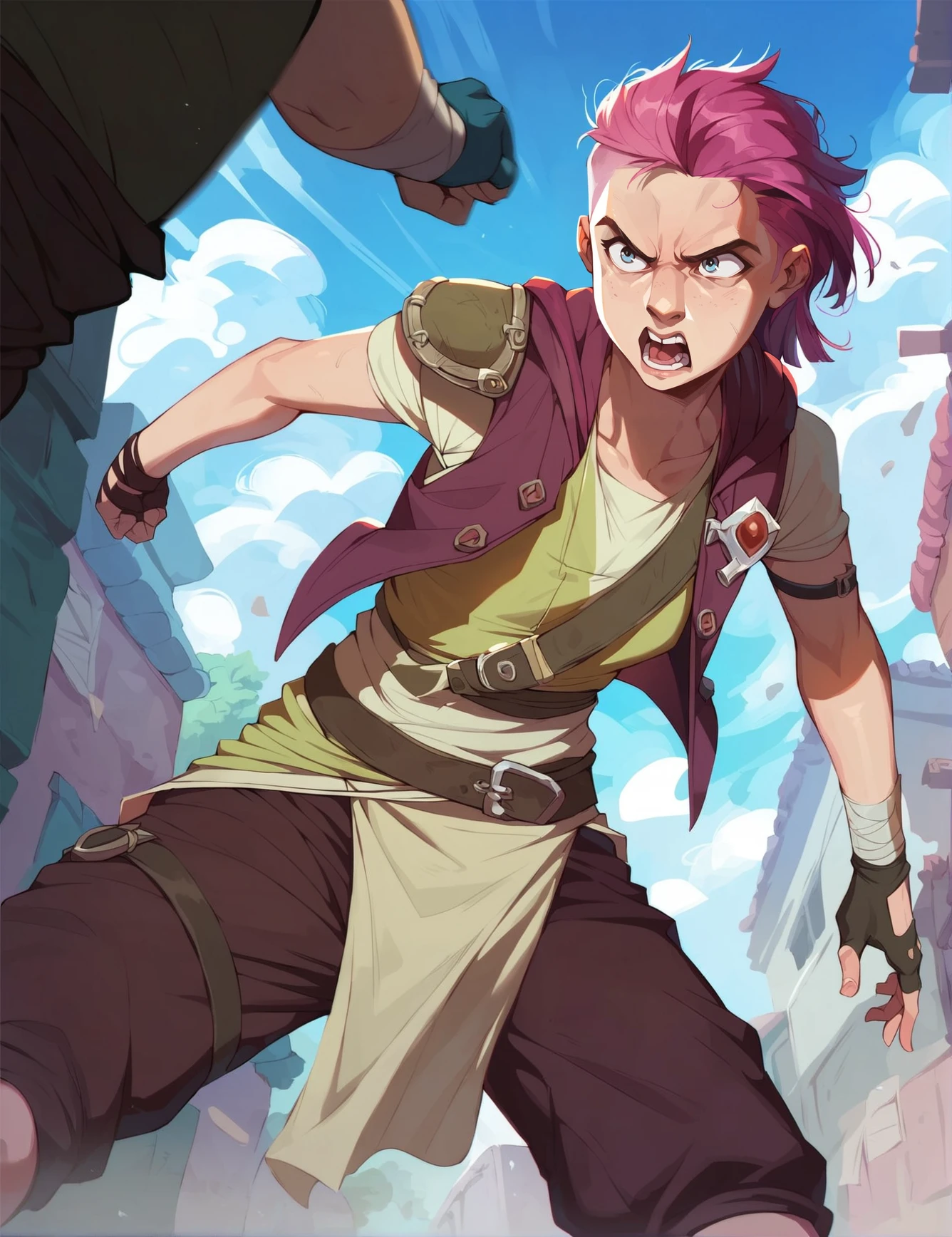 Recommend prompt: "1girl, v1, pink hair,grey-blue eyes", "lilac hooded tank top, shoulder pad, yellow t-shirt, glove, armband,loincloth, brown pants,".