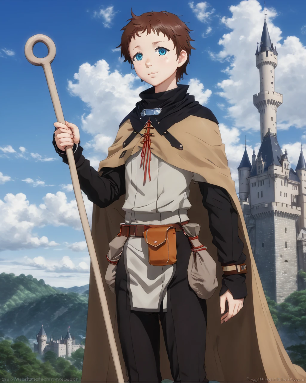 Ninya, brown hair, short messy brunette, teal eyes, adventurer's outfit, staff, cloak, boots, pouches, tomboy, anime