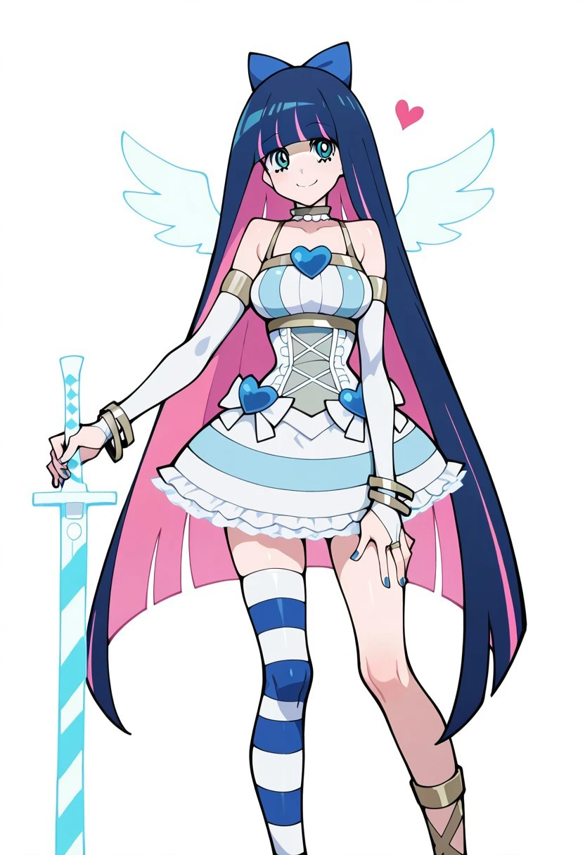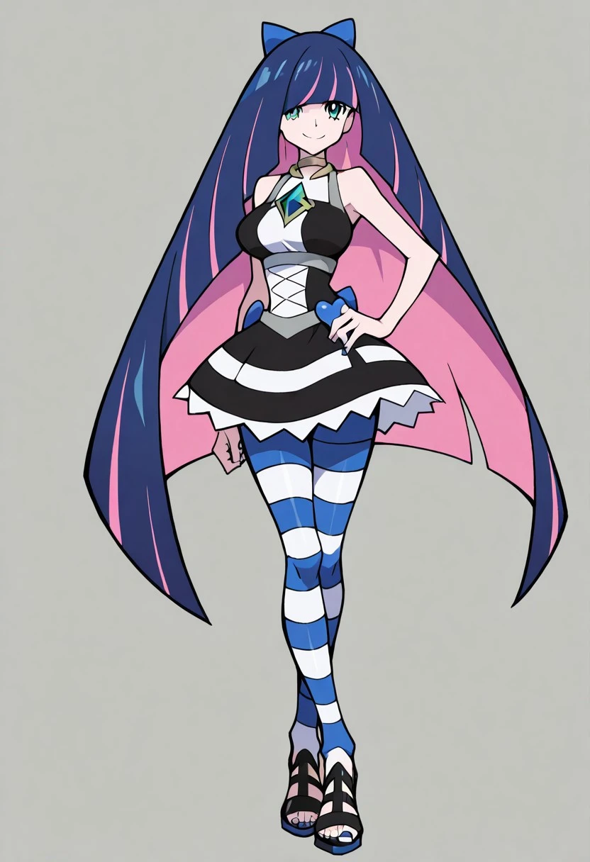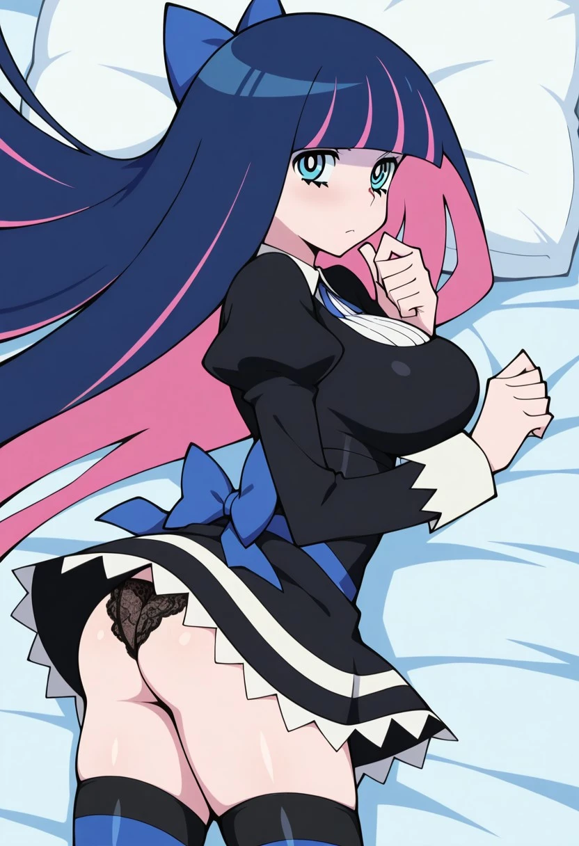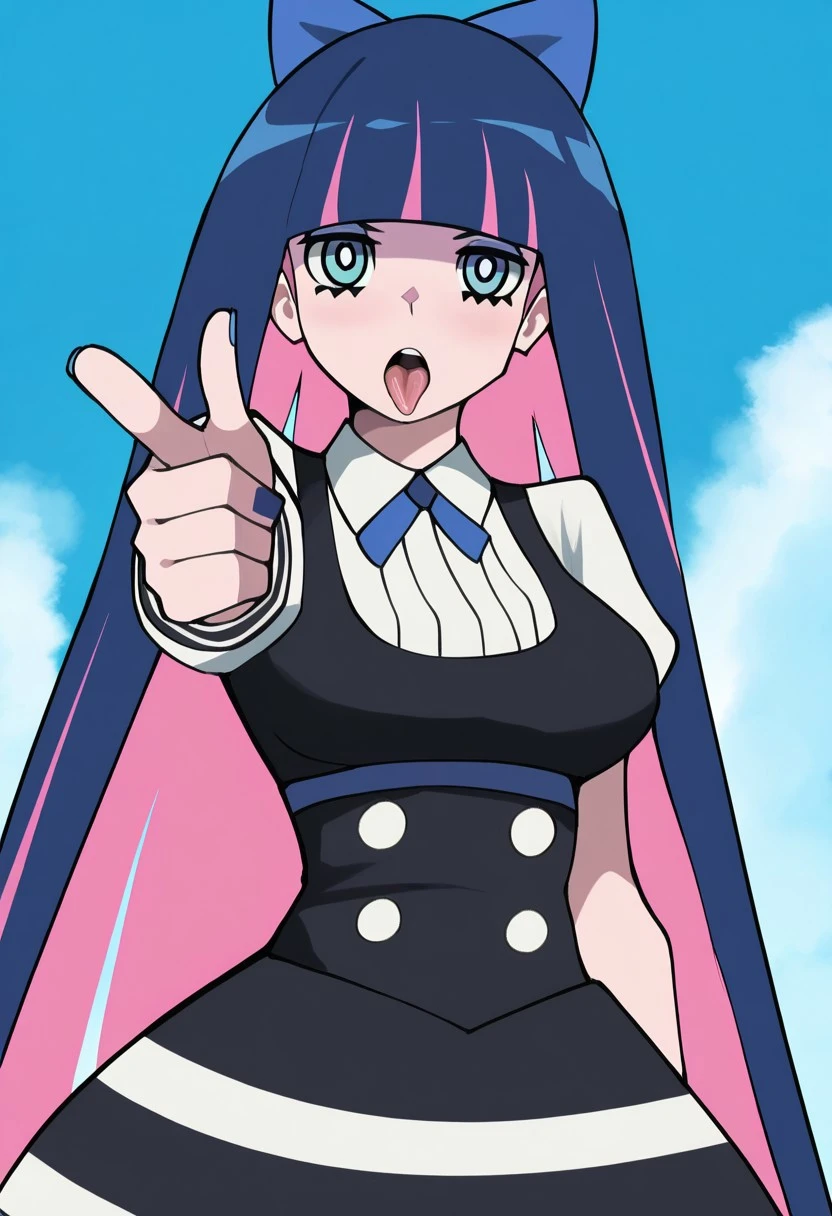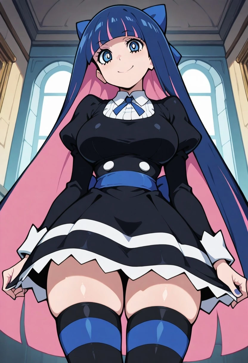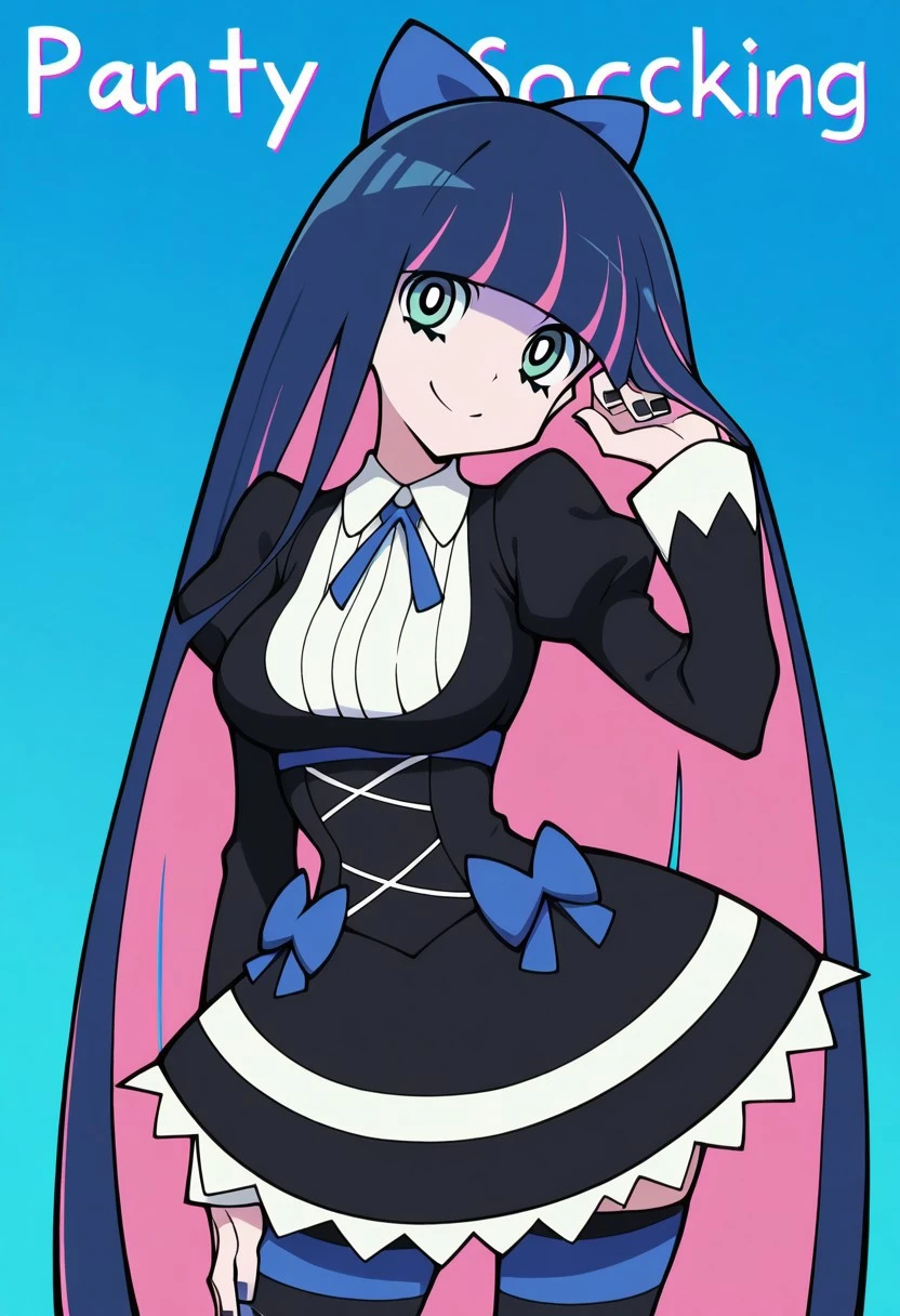 patStocking, stocking anarchy, blue eyes, blue hair, colored inner hair, hair bow, long hair, multicolored hair, pink hair, two-tone hair, bangs, blunt bangs, striped thighhighs, black dress, puffy sleeves, long sleeves, collared shirt, white shirt,