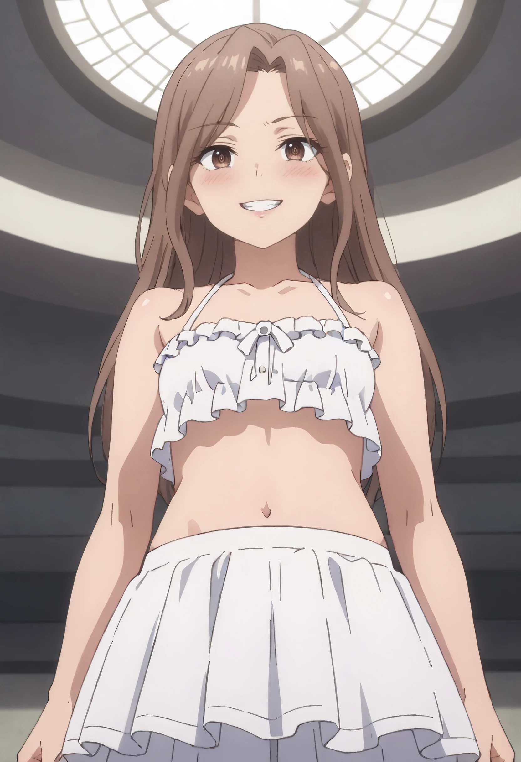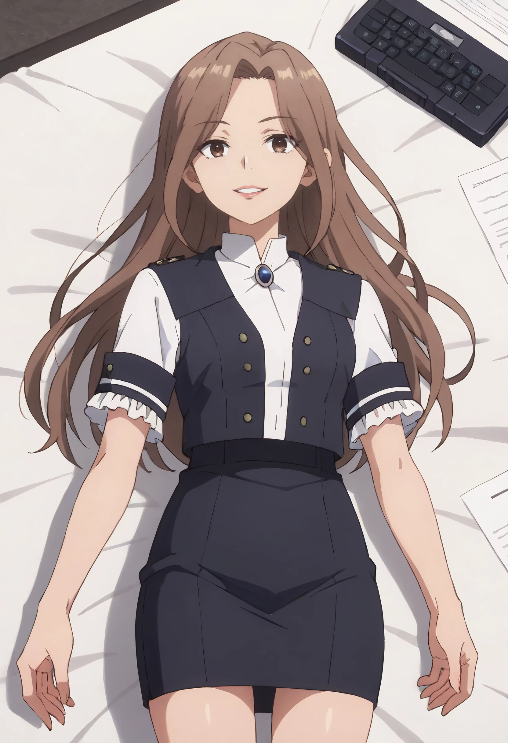 GirGuide, brown hair, long hair, brown eyes, bangs, parted bangs, eyebrows visible through hair,