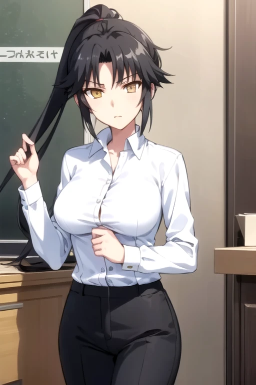 YayoiYagami, 1girl, solo, very long hair, large breasts, white shirt, black hair, long sleeves, yellow eyes, ponytail, black pants, dress shirt,