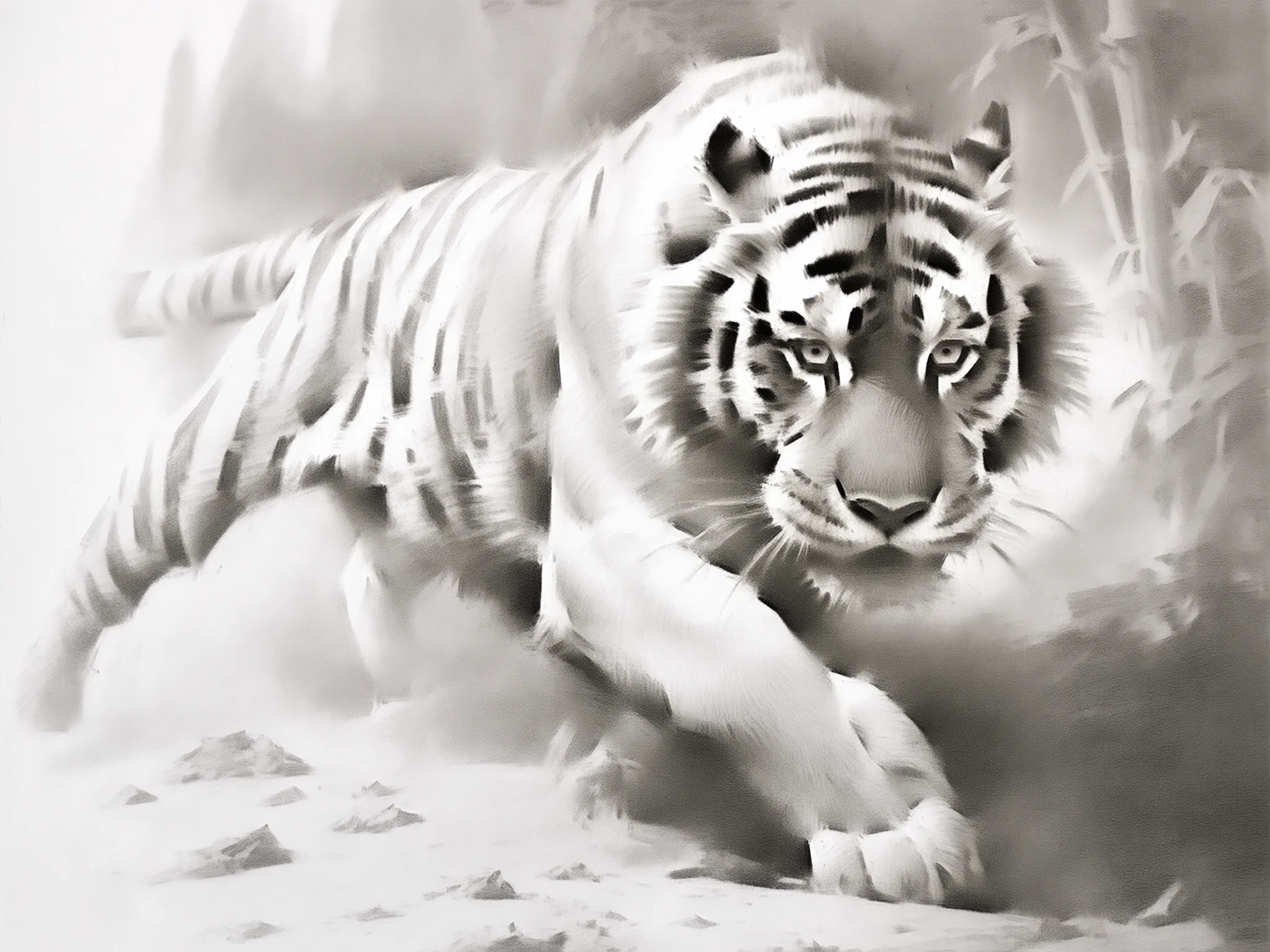 Charcoal drawing technique, sketch-style charcoal artwork, emphasizing wild dynamism and muscular tension. The central subject is a prowling Bengal tiger, with a blurred background of moonlit Brahman thickets. Cold light pours from the upper right, carving sharp chiaroscuro transitions on the predator’s body. Tiger stripes are rendered with bold charcoal strokes using the side of the stick, while softer charcoal blends gradual grays for the belly fur. Muscle groups are cross-hatched for volume, and deepened charcoal powder layers define tensed tendons on the shoulders and hind legs. Pupils are sharpened with extreme black-white contrast—a highlight struck in the iris with an eraser tip, and fangs emphasized via negative spacing to amplify cold gleam. The tiger crouches in attack posture; disturbed dirt under claws is dotted with broken charcoal marks, and the tail’s curvature is drawn with continuous arcs. Background bamboo uses dry-brushing for depth, with occasional sharp lines cutting through the haze. The atmosphere pulses with the danger of primal jungles, every stroke roaring with the predator’s lethal elegance.