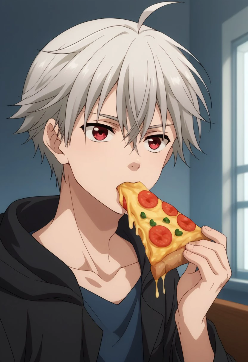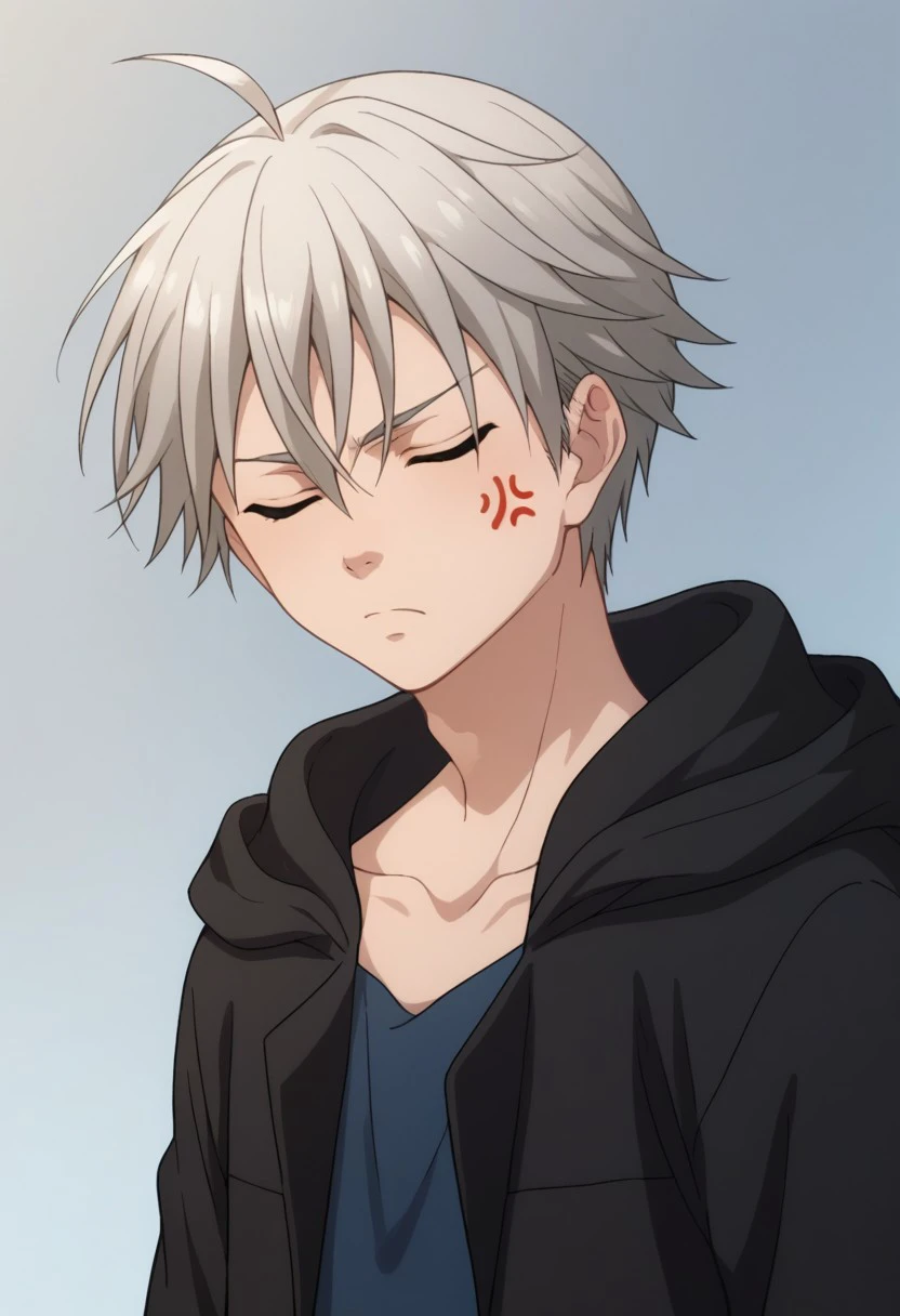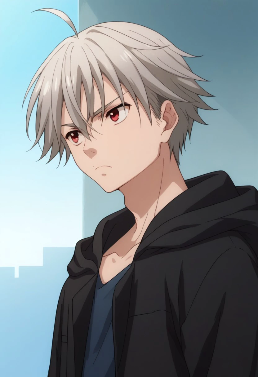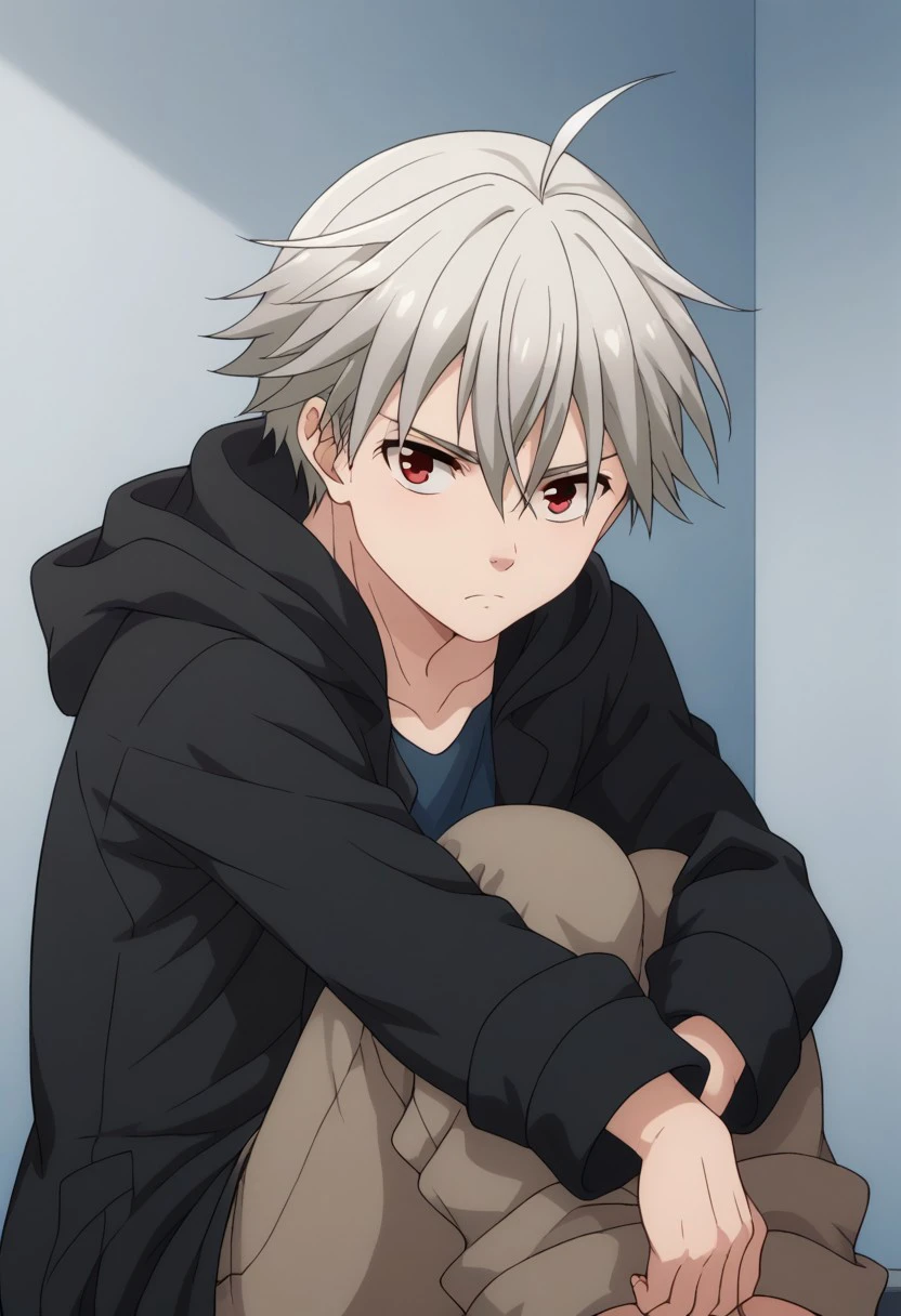yoshio, 1boy, male focus, barefoot, red eyes, hood, hoodie, ahoge, grey hair, black hoodie, brown pants, shirt, blue shirt, open hoodie, open clothes