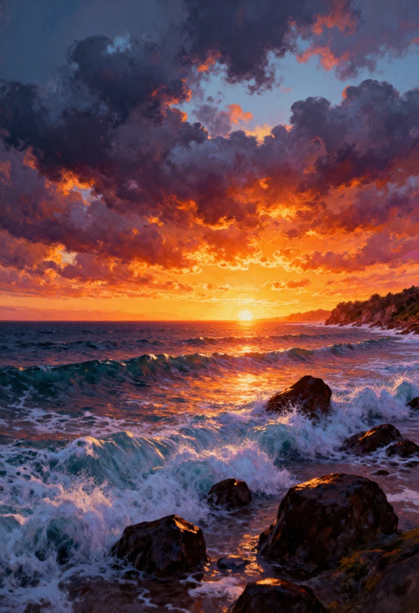 Ideal for landscapes, seascapes, emotional storytelling, romantic scenes, and any artwork requiring a warm, immersive sunset atmosphere with painterly aesthetics.