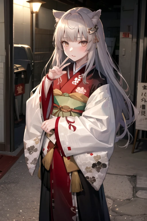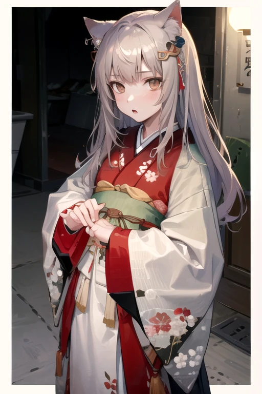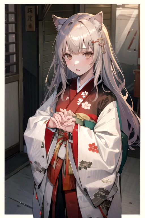 KakuyaNG, 1girl, solo, long hair, hair ornament, long sleeves, animal ears, brown eyes, yellow eyes, grey hair, japanese clothes, cat ears, wide sleeves, kimono, sleeves past wrists, sash, fox ears, obi, floral print, red kimono, print kimono,