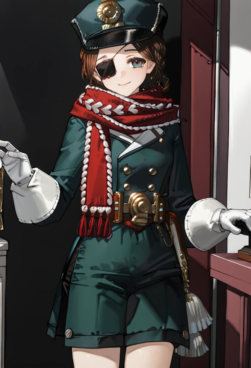 ema1999, 1girl, solo, short hair, brown hair, braid, heterochromia, eyepatch, military uniform, green jacket, peaked cap, red scarf, buttons, long sleeves, belt, brown belt, belt buckle, pouch, belt pouch, brown bag, white gloves, green shorts, green socks, white shoe, fringe trim