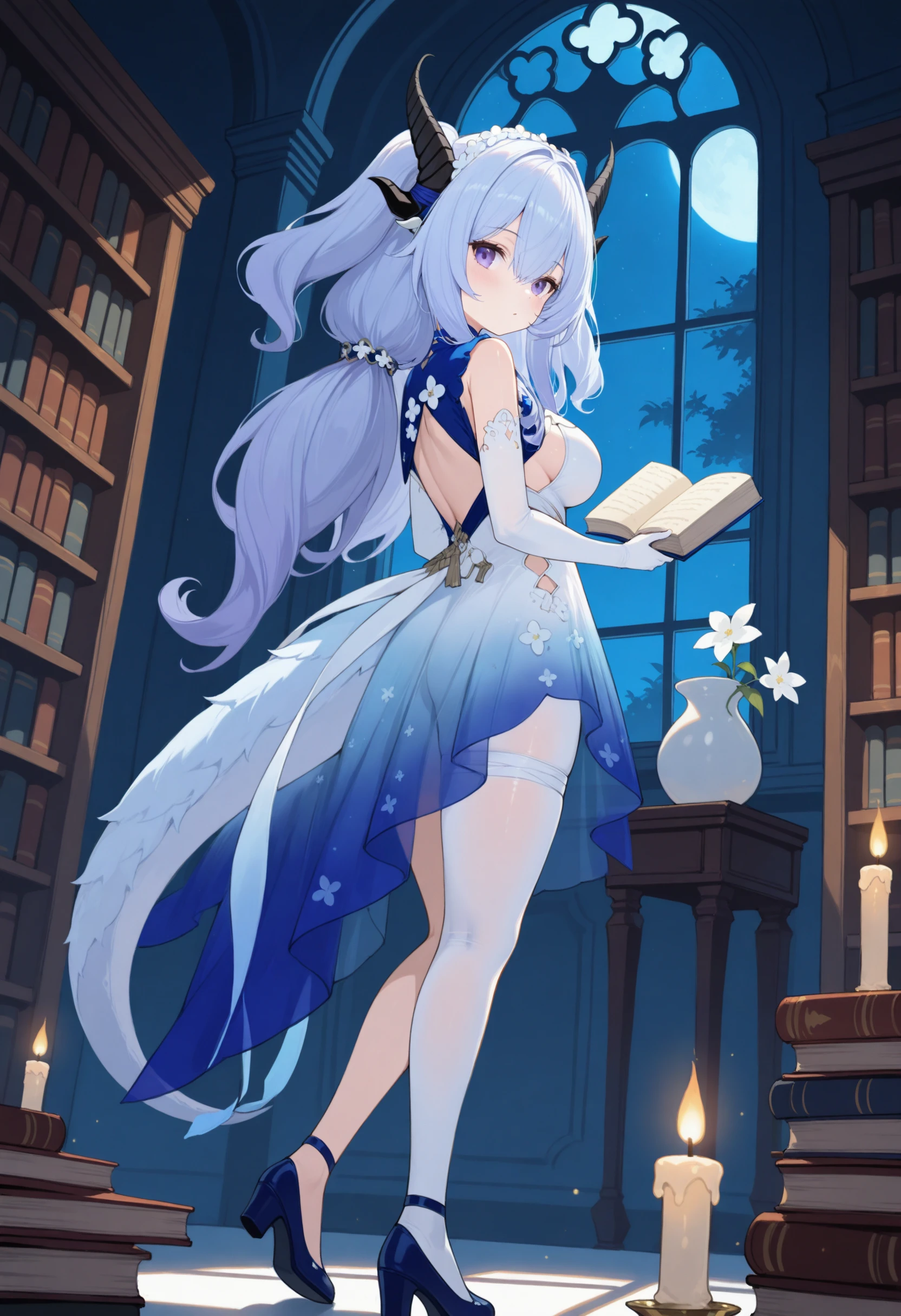 abby, 1girl, solo, low twintails, low-tied long hair, wavy hair, hair between eyes, light blue hair, blue hairband, purple eyes, white flower headband, dragon horns, white and blue dress, golden pendant in collar, white backless bodysuit , see-through dress, single white thighhighs, asymmetrical legwear, single bandaged leg, blue collar, white elbow gloves, floral print, gradient skirt, keyhole cutout, flat chest, dragon girls, dragon tailDescription