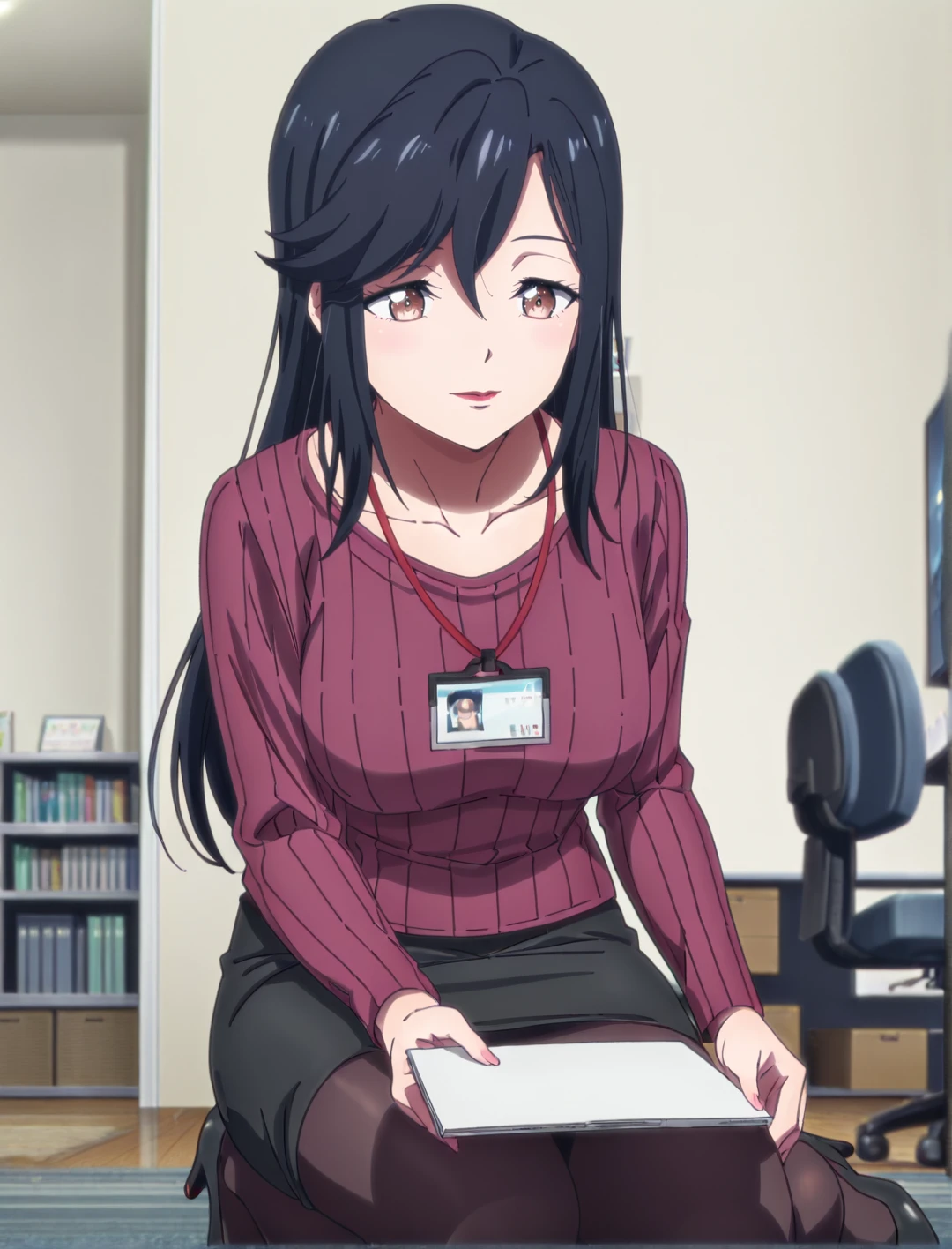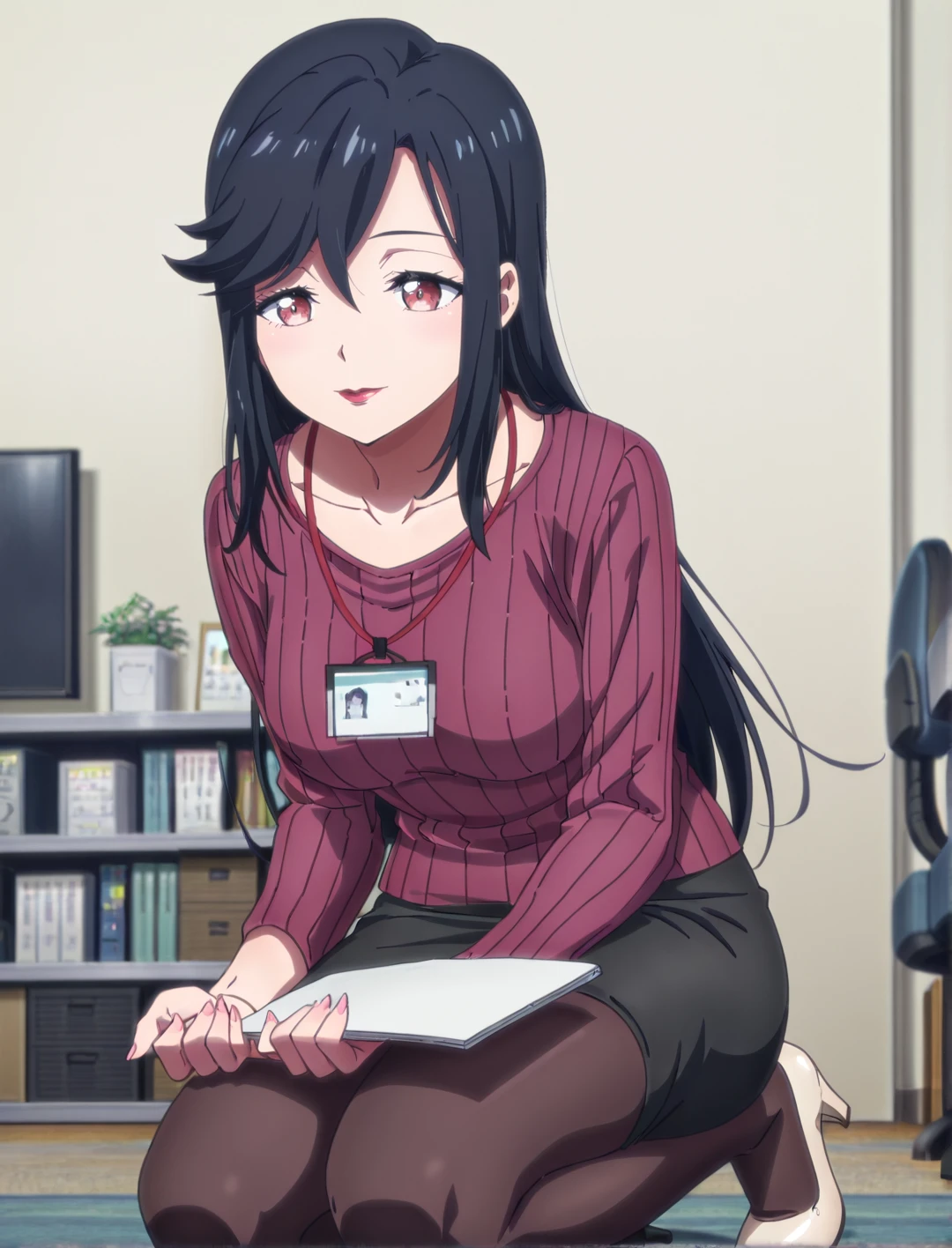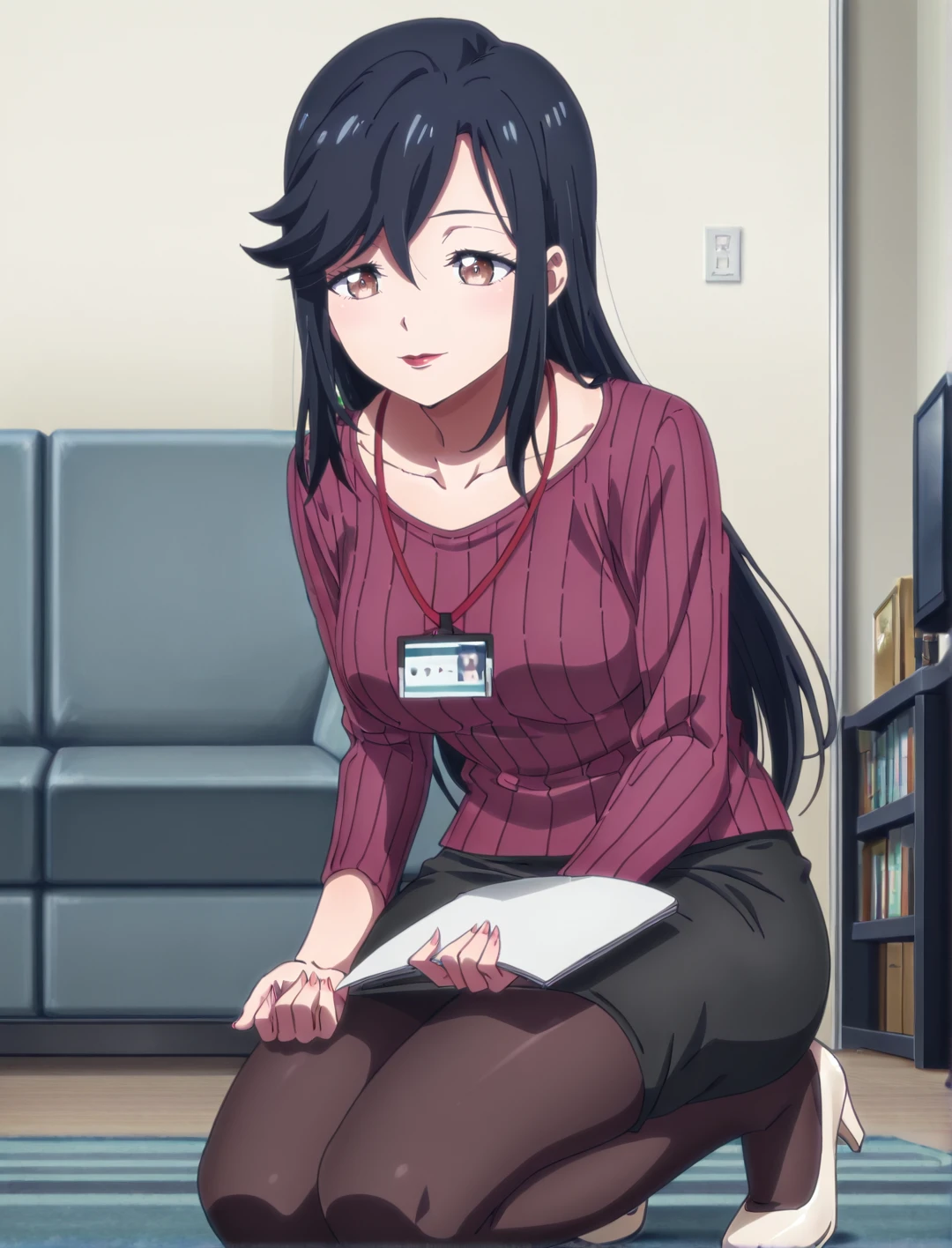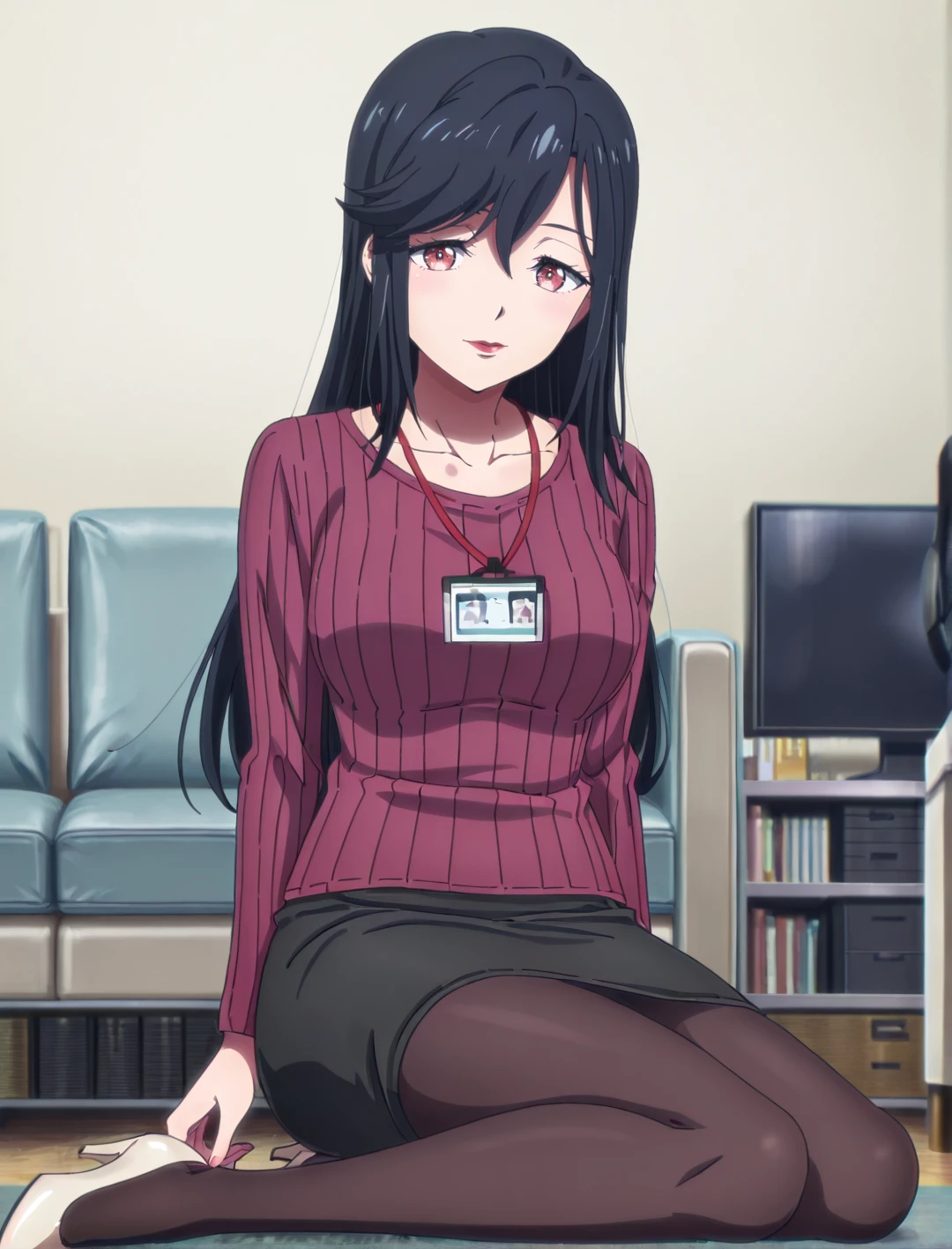 saori ohtori (zom100), 1girl, solo, long hair, black hair, red eyes, red lipstick, collarbone, red sweater, id card, pencil skirt, black skirt, brown pantyhose, high heels, cream color footwear