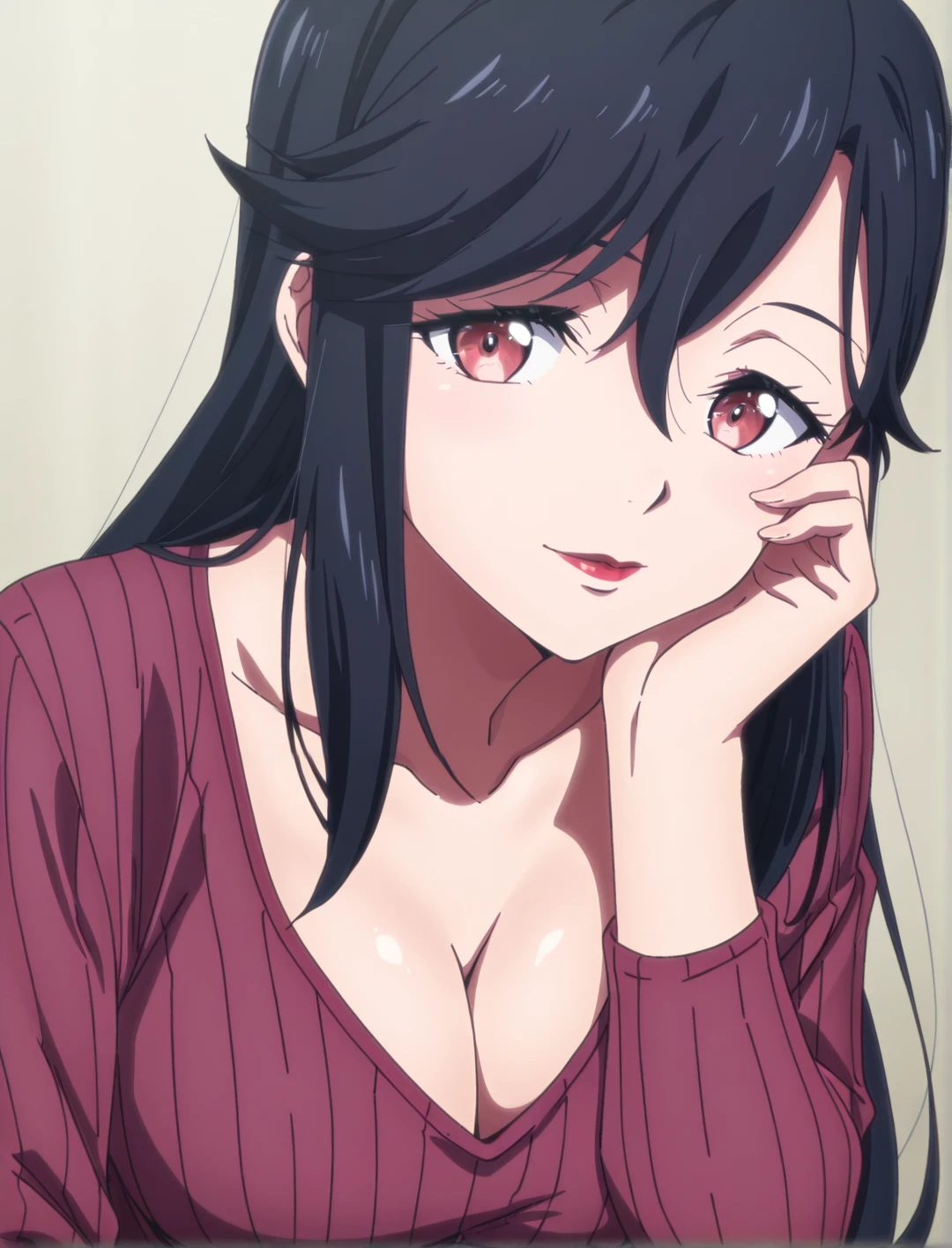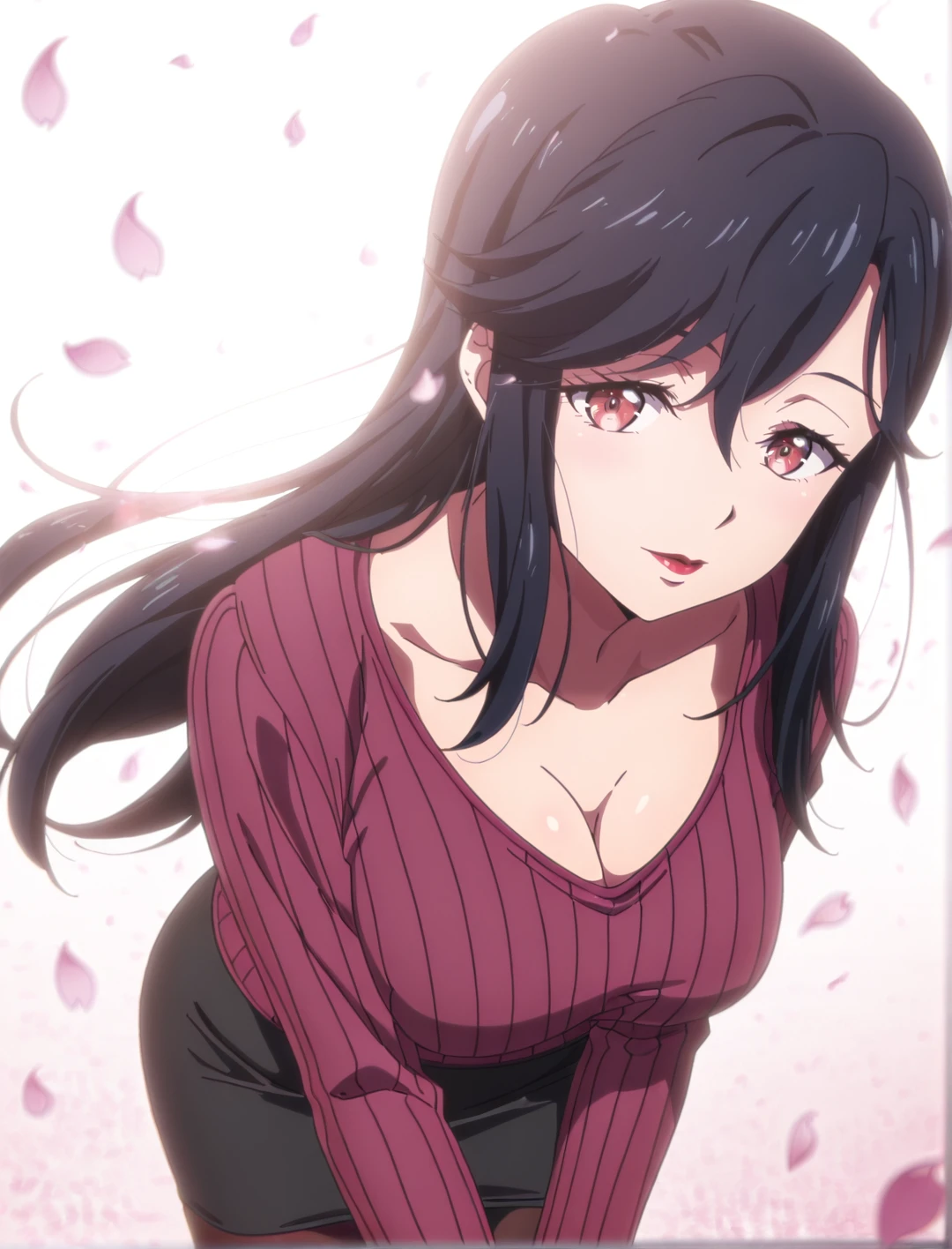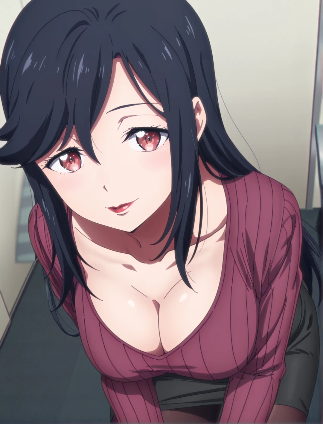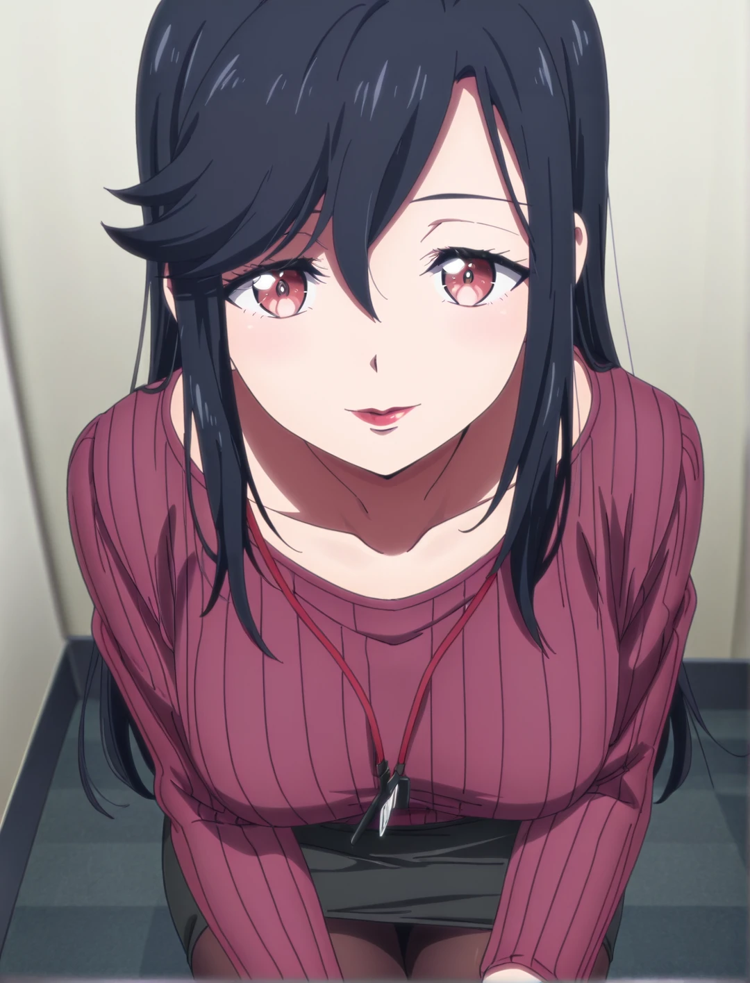 saori ohtori (zom100), 1girl, solo, long hair, black hair, red eyes, red lipstick, collarbone, red sweater, id card, pencil skirt, black skirt, brown pantyhose, high heels, cream color footwear