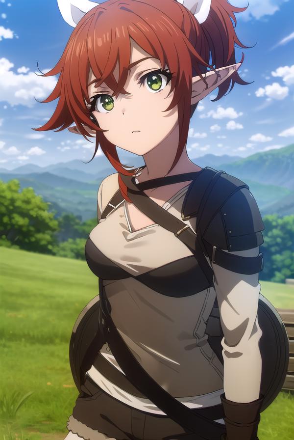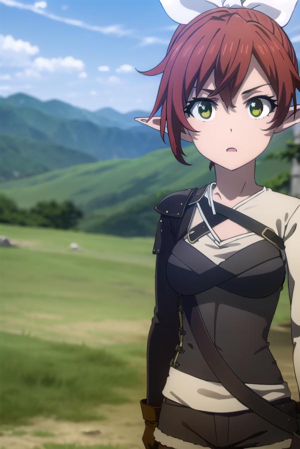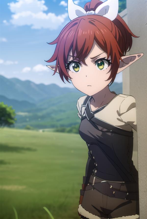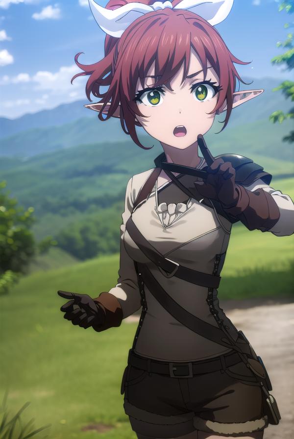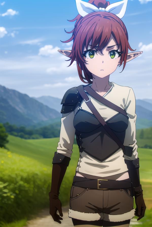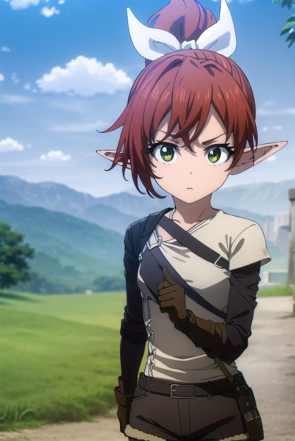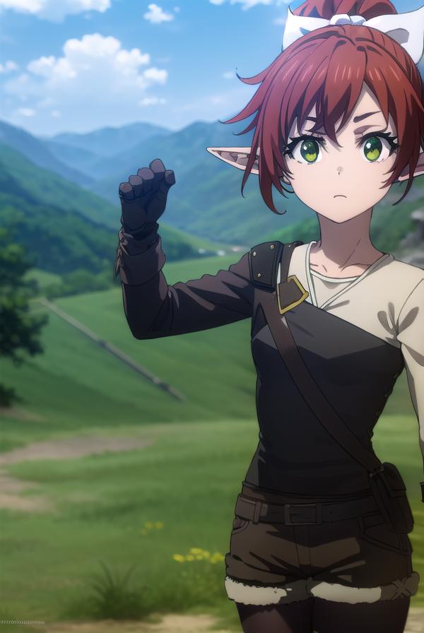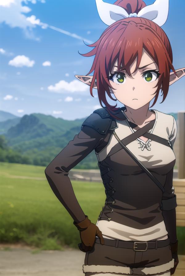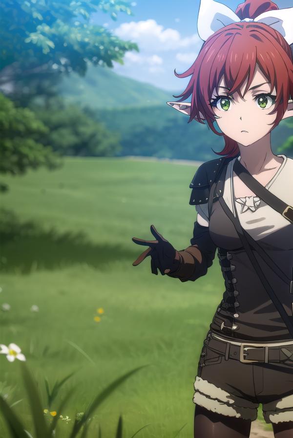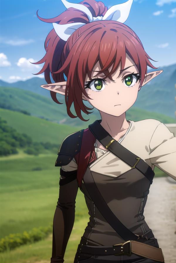 rhea fighter, (green eyes:1.5), hair ribbon, ponytail, red hair, pointy ears, elf, white bow, white ribbon, ribbon,