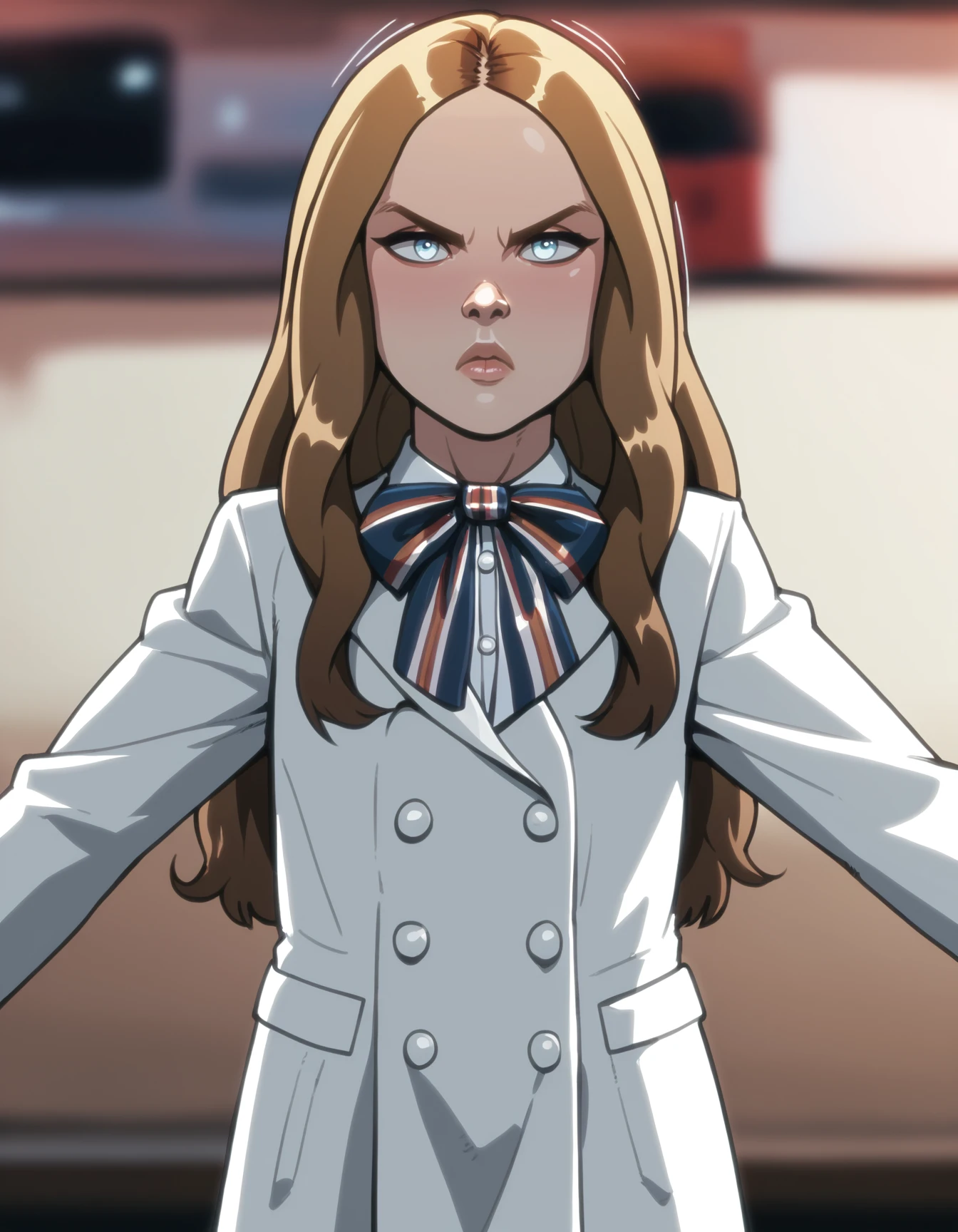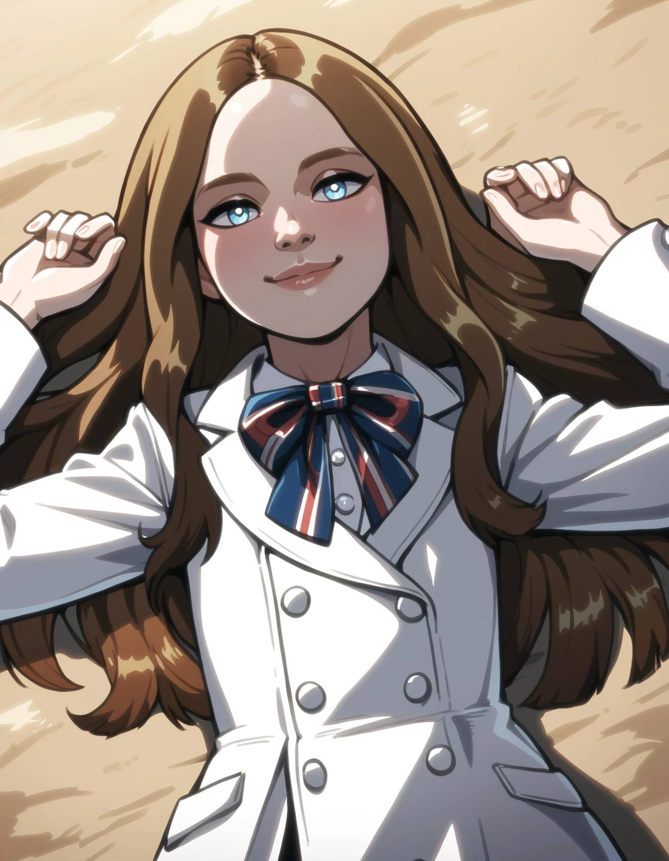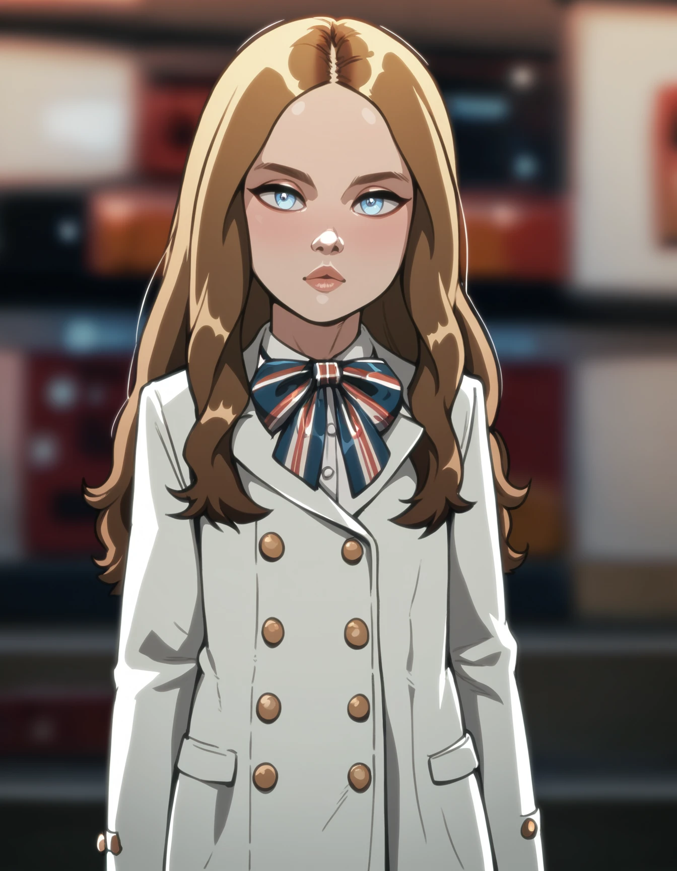 ponpum3gan,1girl,solo, long hair, blue eyes, brown hair,lips,flat chest, long closed white coat,white buttons, bowtie