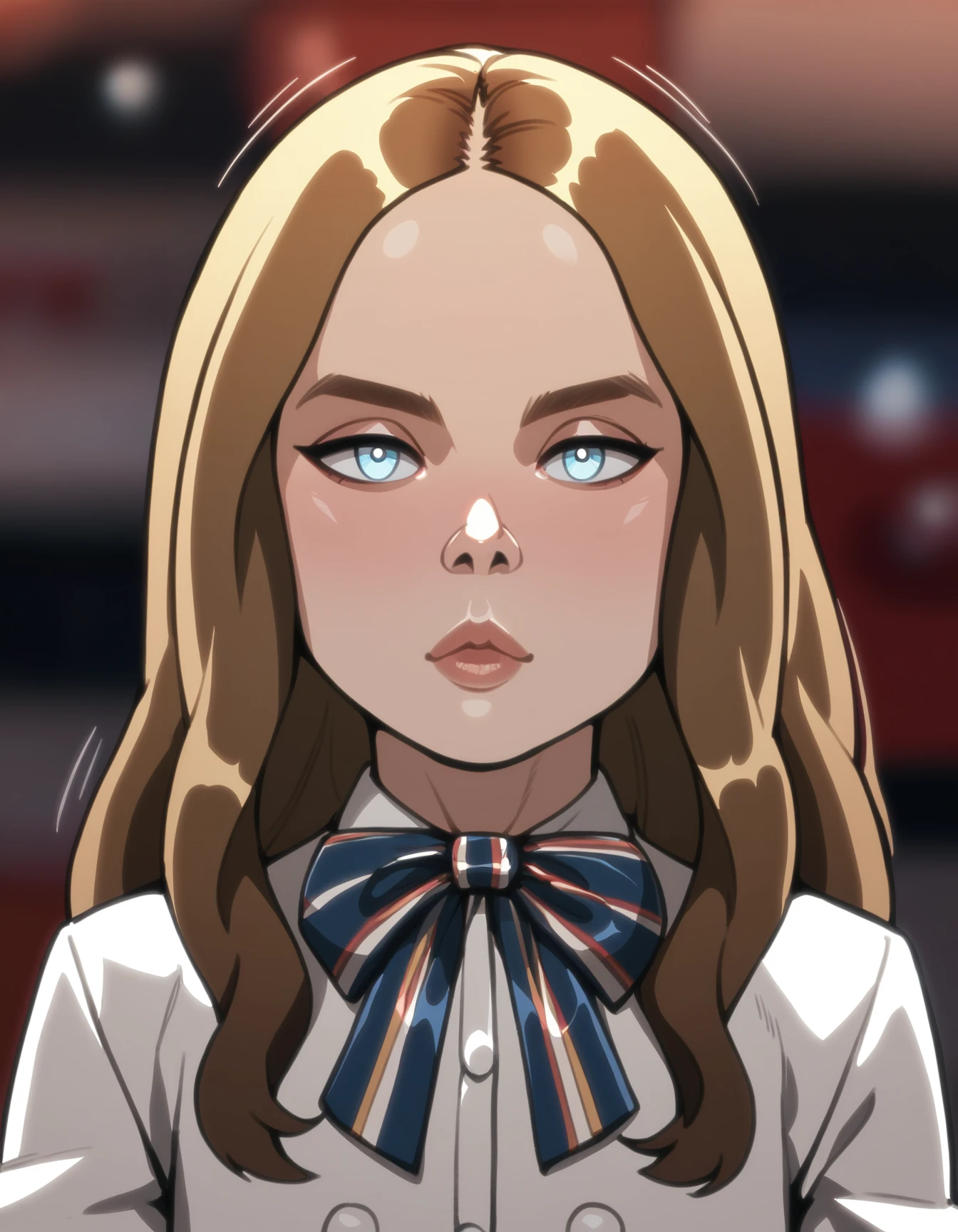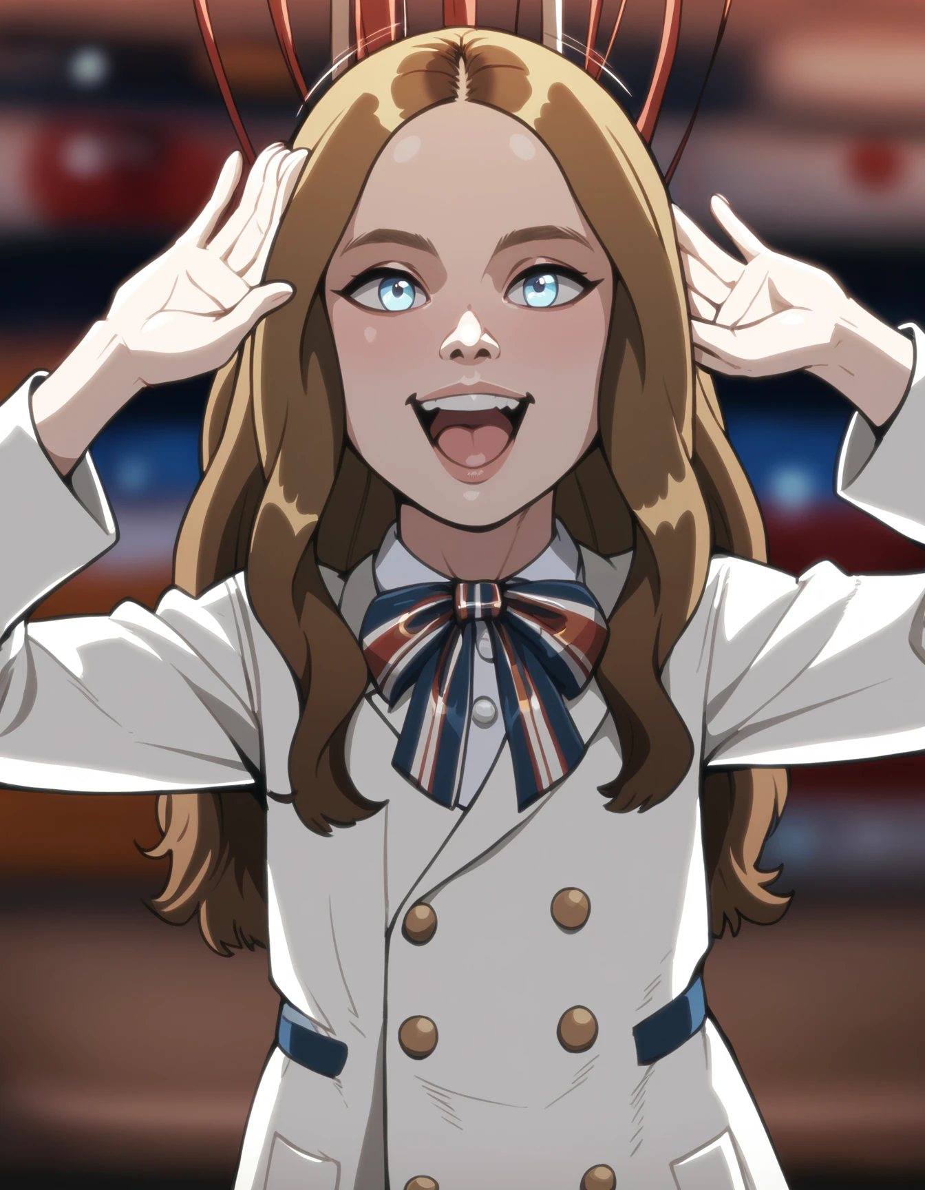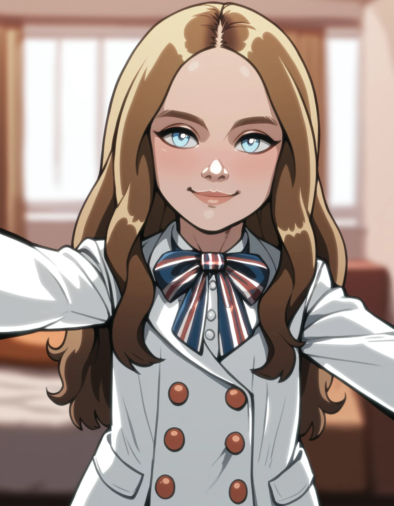 ponpum3gan,1girl,solo, long hair, blue eyes, brown hair,lips,flat chest, long closed white coat,white buttons, bowtie