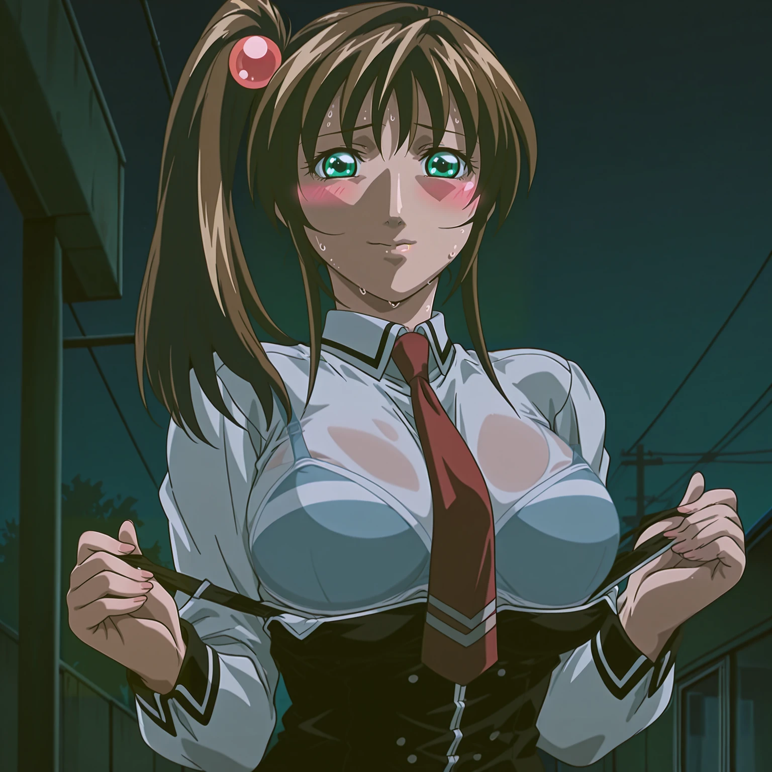 1girl, 1mari, brown hair, side ponytail, red hair ornament, green eyes, large breasts