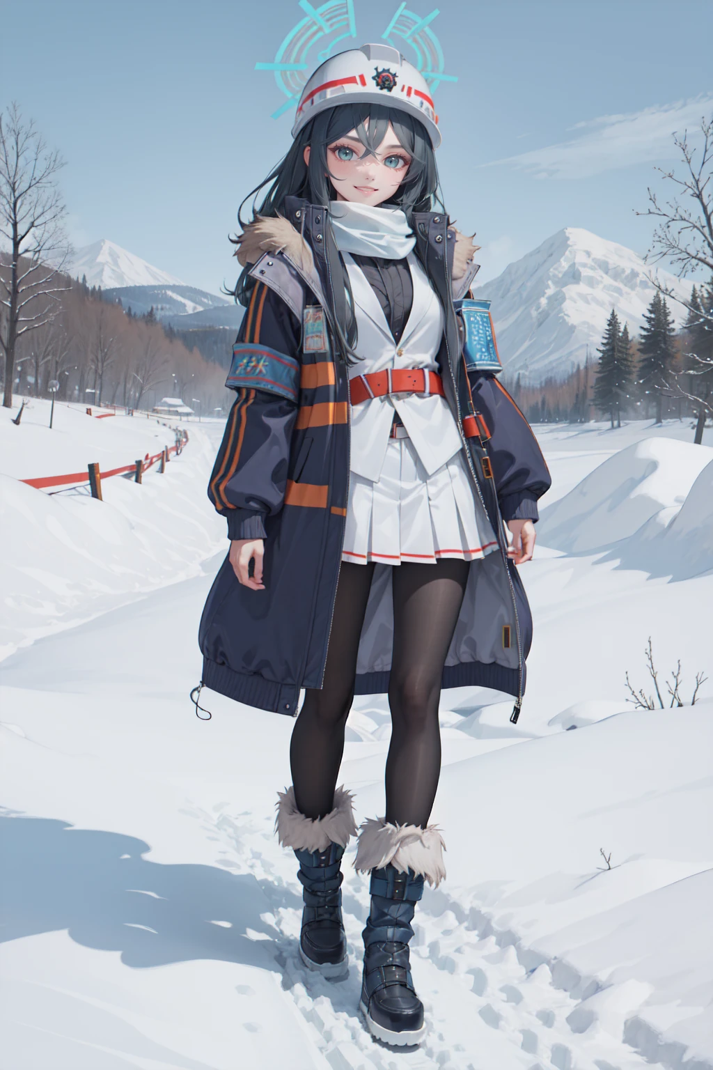outfit : jacket, helmet, fur trim, shirt, armband, pantyhose, white skirt, neck scarf, belt