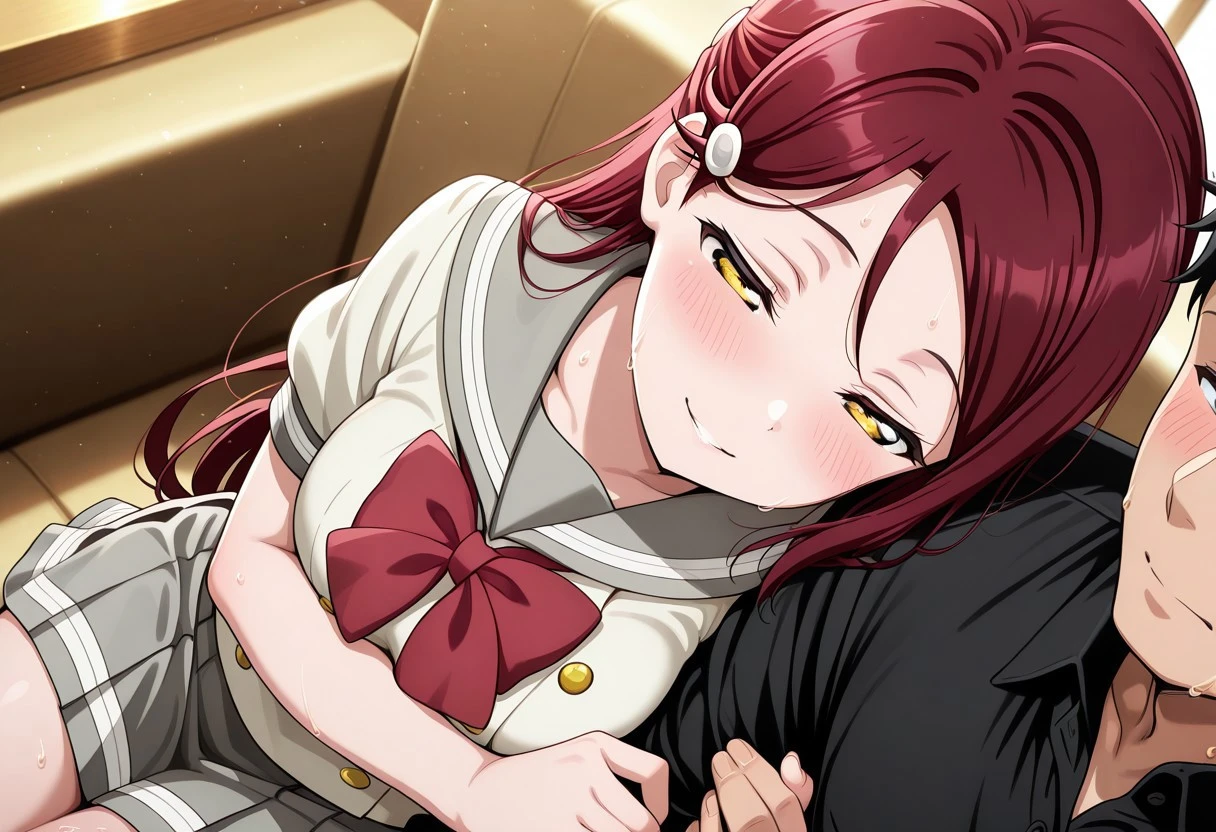 long hair, hair ornament, yellow eyes, red hair, hairclip, mature female, medium breasts,