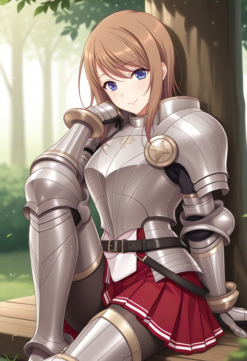 armor,gauntlets, pauldrons,breastplate,,greaves,armored boots, shoulder armor, black pantyhose, pleated skirt,red skirt, black belt