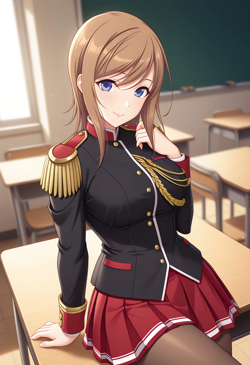 school uniform,pleated skirt,epaulettes,red skirt,long sleeves,black uniform,aiguillette, brown pantyhose,