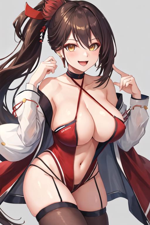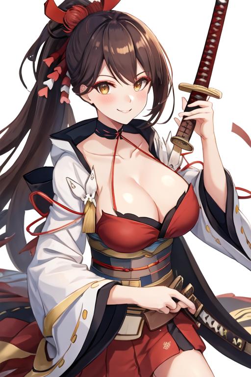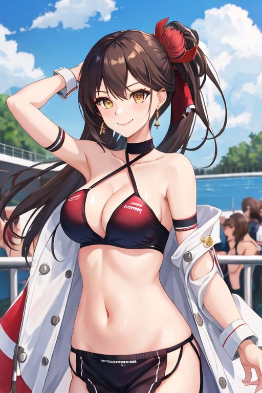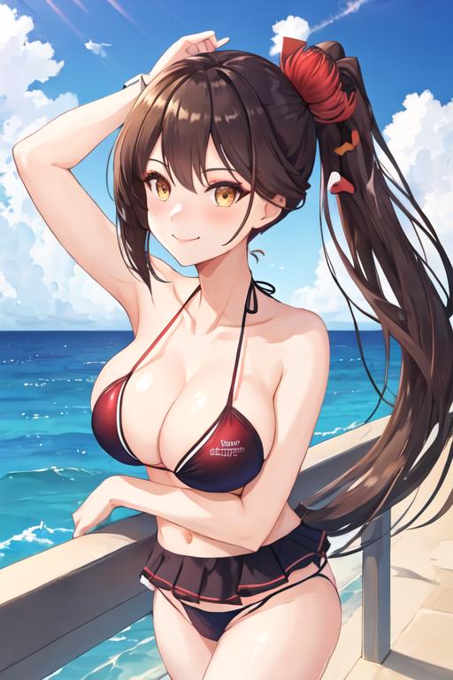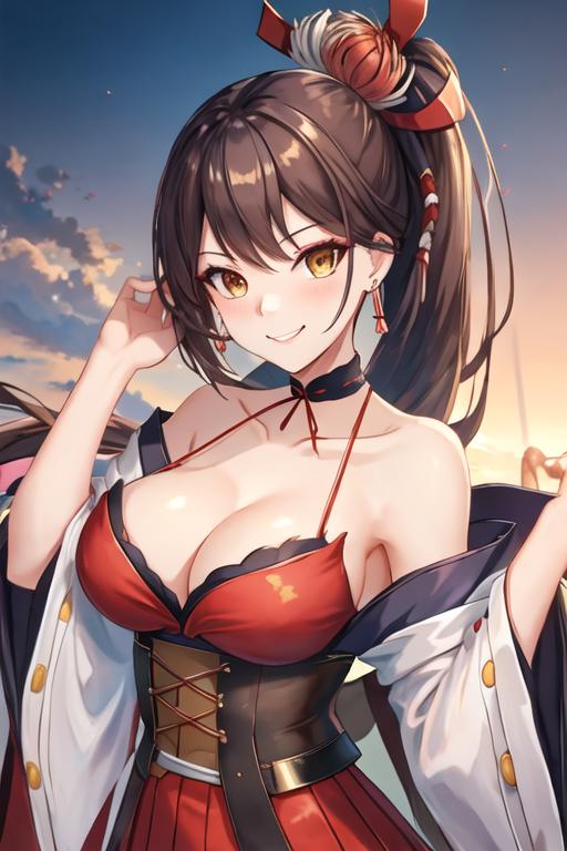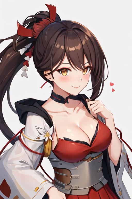 The trigger word is zuikaku_azurlane, and the recommended tags are best quality, masterpiece, highres, solo, {zuikaku_azurlane:1.15}, long_hair, brown_hair, breasts, large_breasts, bangs, yellow_eyes, blush, cleavage, very_long_hair, hair_ornament, smile, collarbone, brown_eyes, ponytail.
