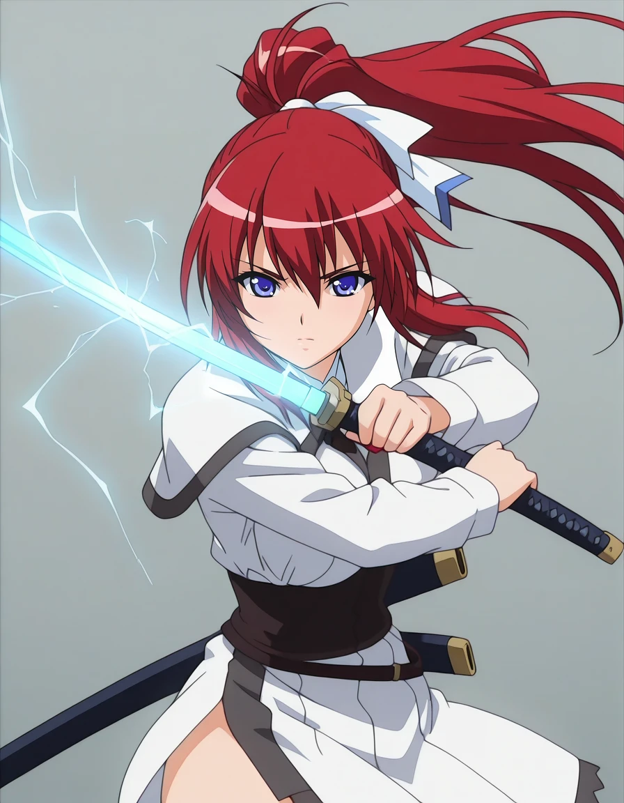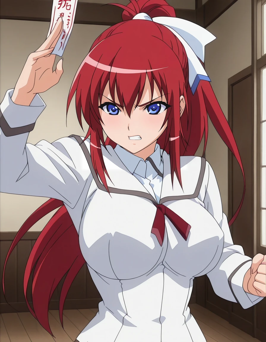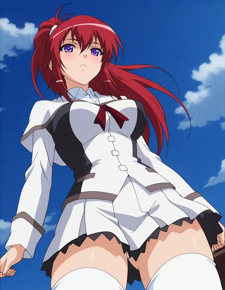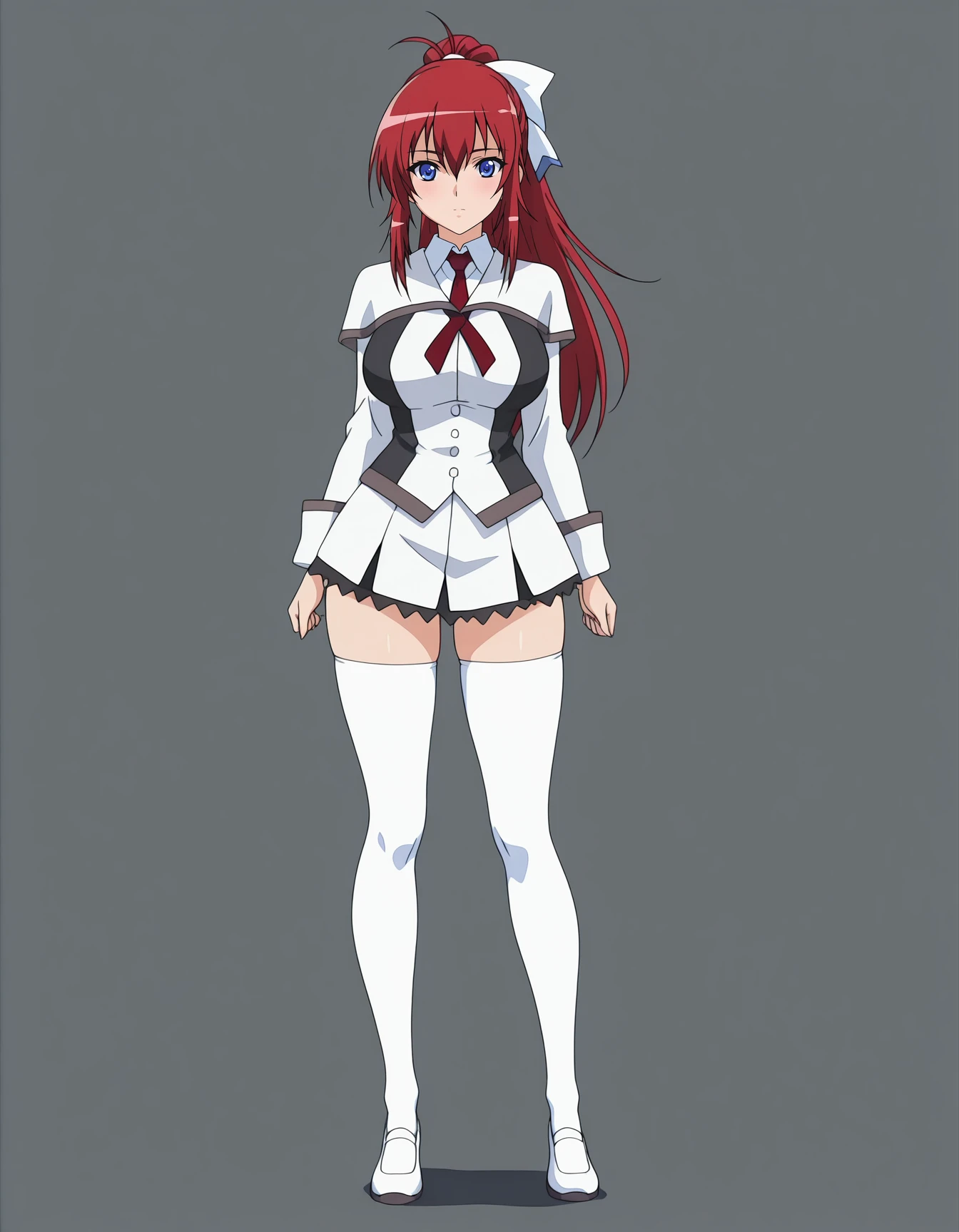 mai_iycu,mai_mikotoiy,long_hair,ponytail,red_hair,blue_eyes,large_breasts,hair_bow,school_uniform,long_sleeves,white_skirt,white_thighhighs,white_footwear