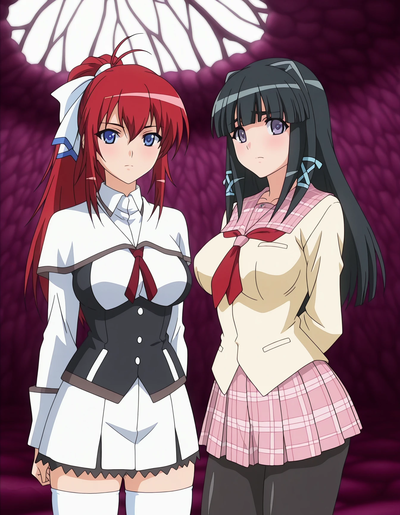 mai_iycu,mai_suiiy,long_hair,black_hair,purple_eyes,large_breasts,hair_ribbon,school_uniform,serafuku,pink_sailor_collar,long_sleeves,plaid_skirt,pantyhose,loafers