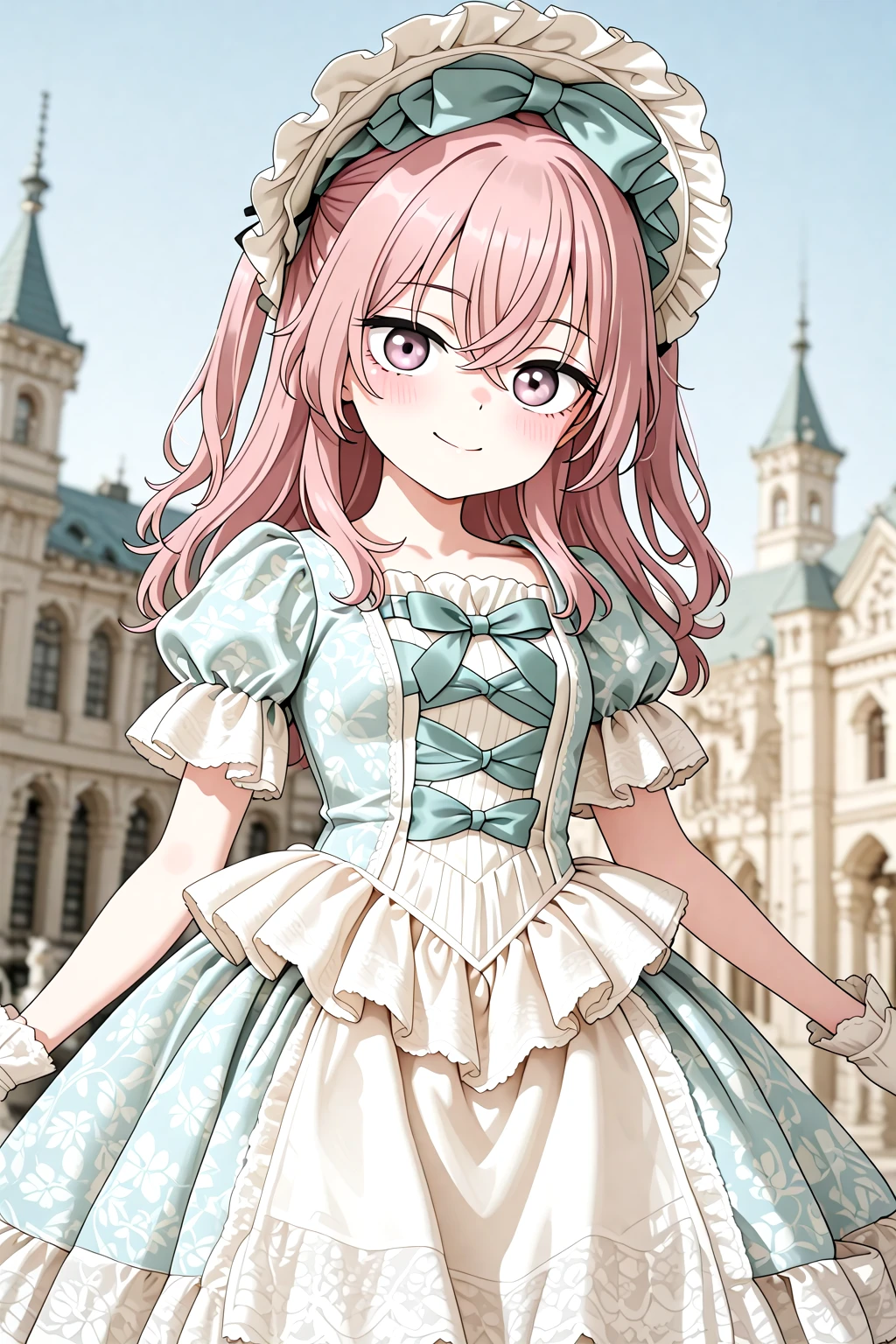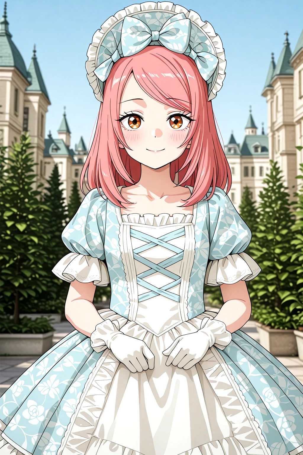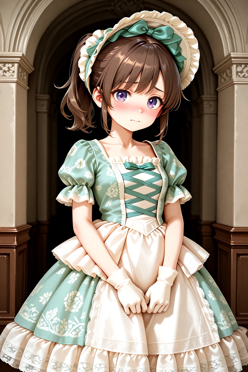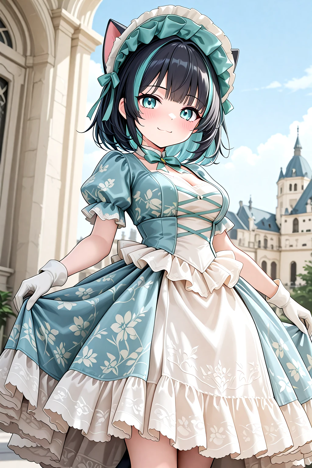 Victorian_Rococo_Dress, gown, frilled dress, long dress, puffy short sleeves, layered dress, lace-trimmed dress, white dress, blue dress, lace, lace trim, frills, floral print, bonnet, gloves, jewelry, bowshoesrecommended weight: 1.0