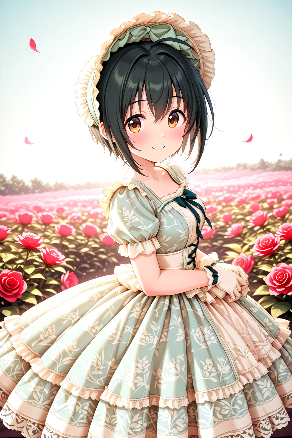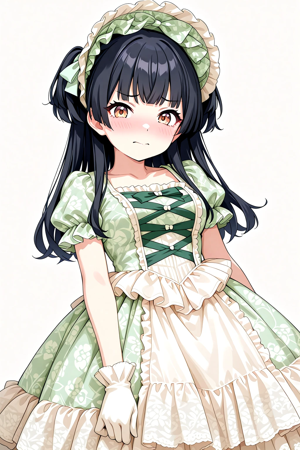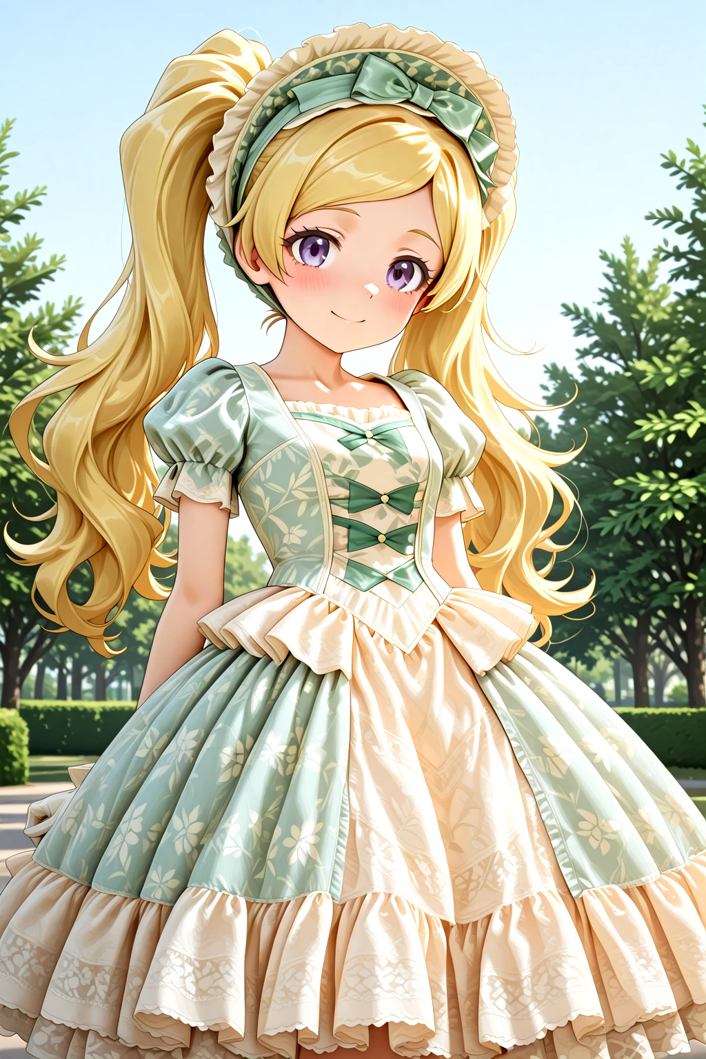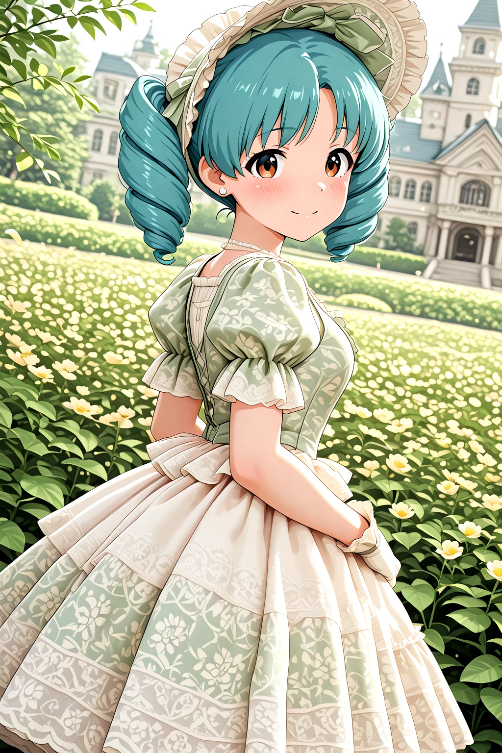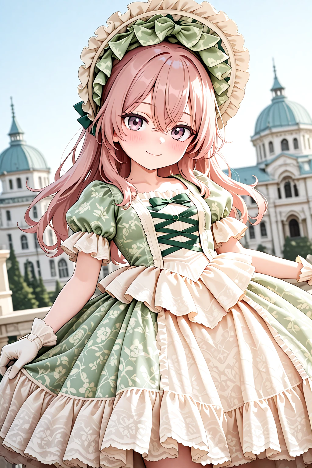 Victorian_Rococo_Dress, gown, frilled dress, long dress, puffy short sleeves, layered dress, lace-trimmed dress, white dress, blue dress, lace, lace trim, frills, floral print, bonnet, gloves, jewelry, bowshoesrecommended weight: 1.0