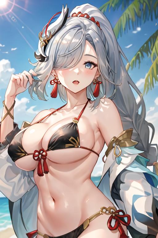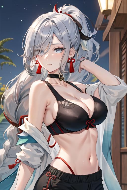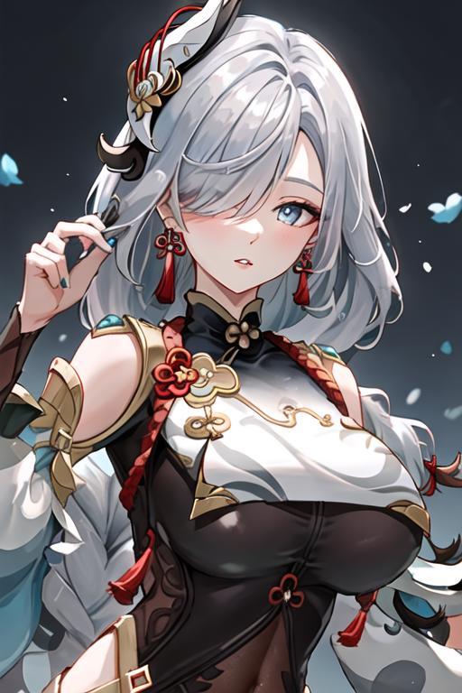 The trigger word is shenhe_genshin, and the recommended tags are best quality, masterpiece, highres, solo, {shenhe_genshin:1.15}, long_hair, blue_eyes, bangs, hair_over_one_eye, breasts, hair_ornament, large_breasts, jewelry, grey_hair, white_hair, tassel, earrings, very_long_hair, braid, breast_curtain.
