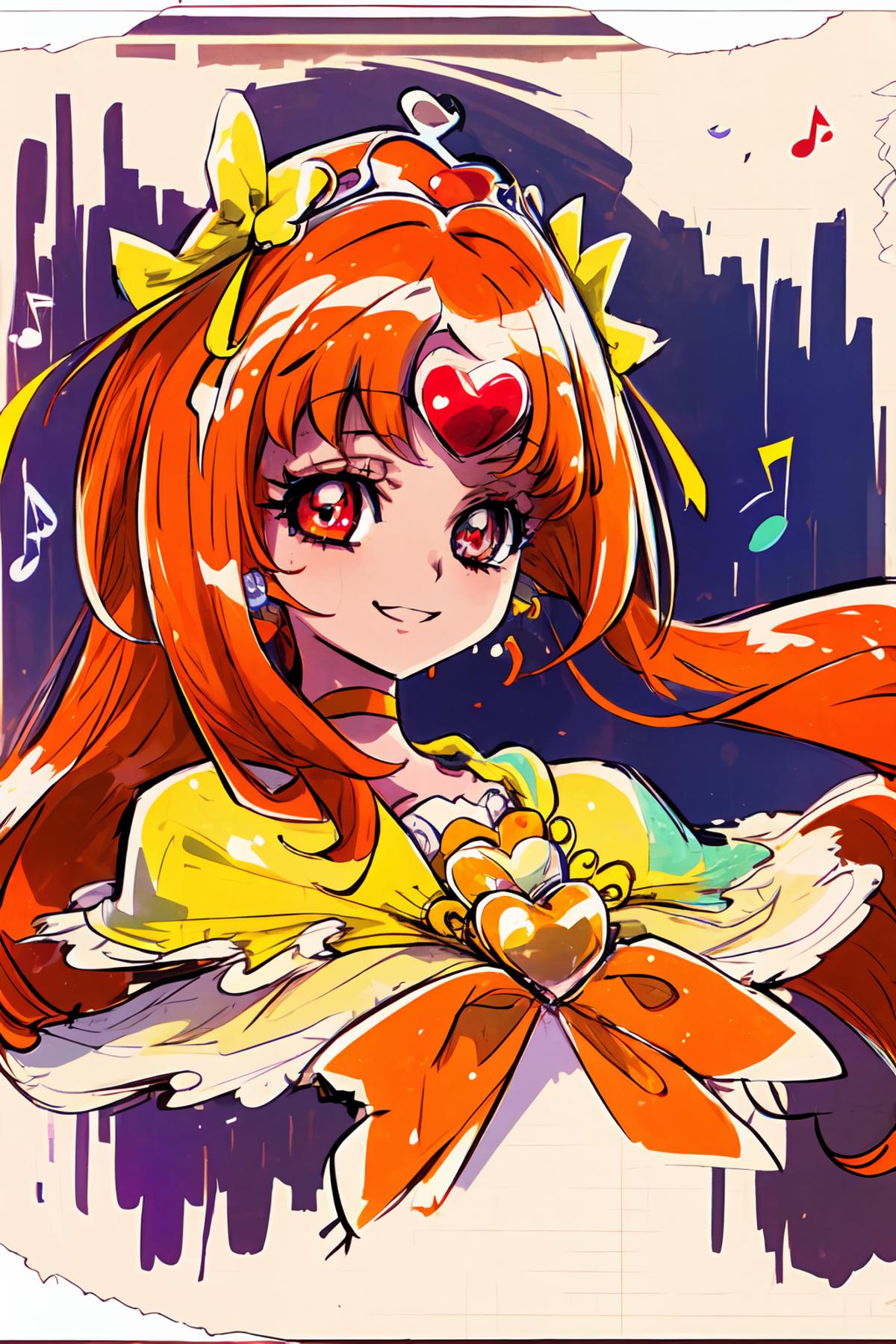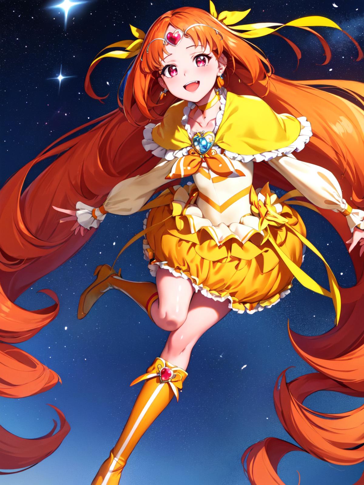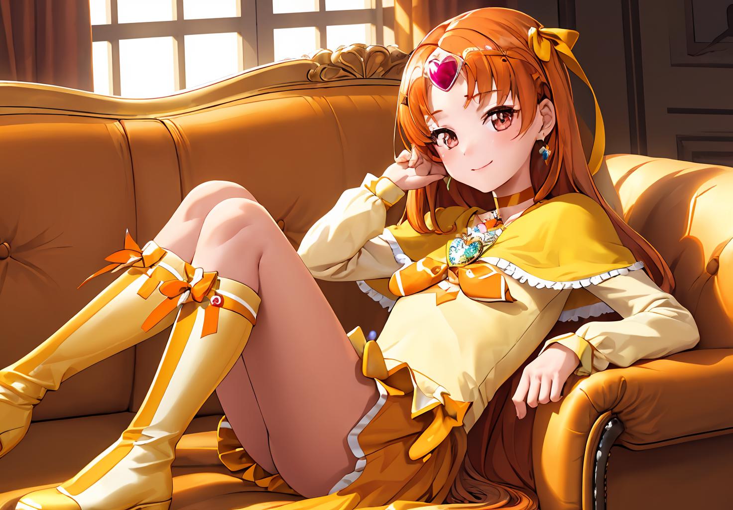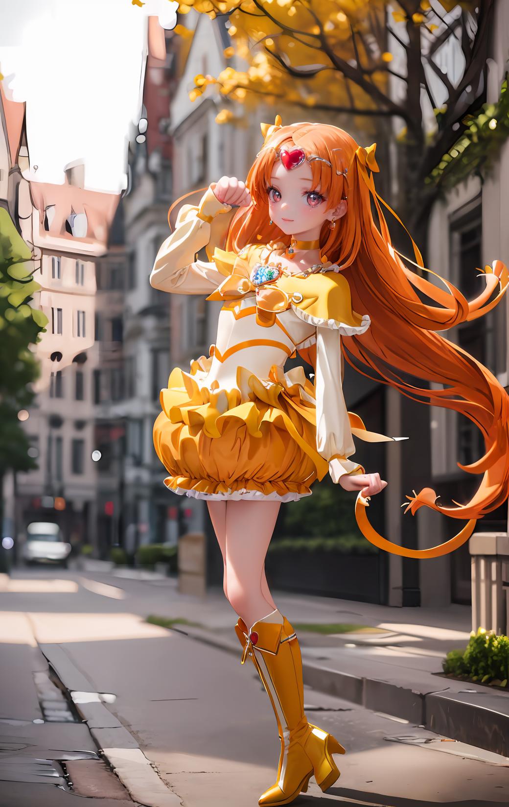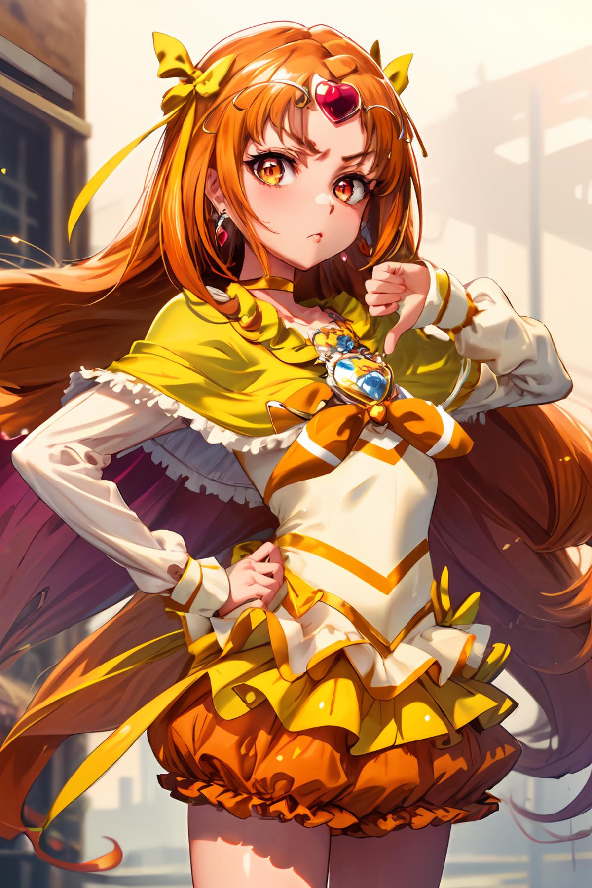 Recommend Tags: orange hair, hair ribbon, yellow choker, jewelry, brooch, capelet, tiara, boots
