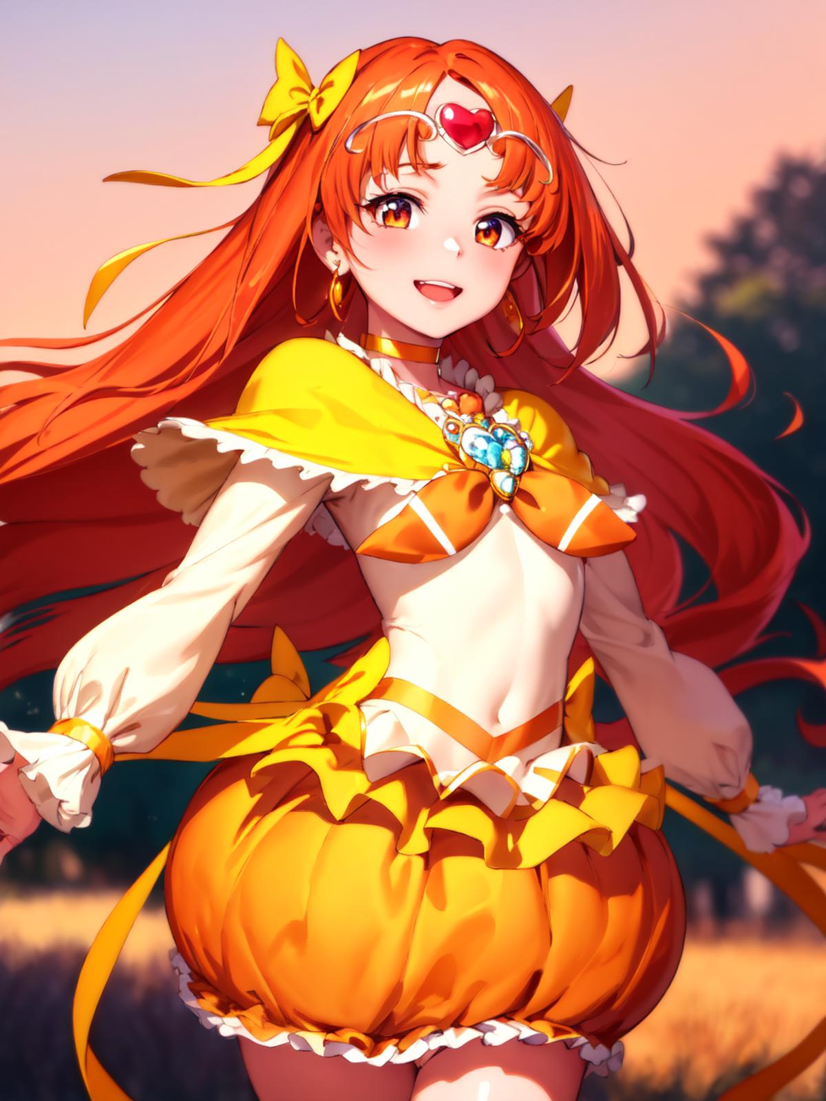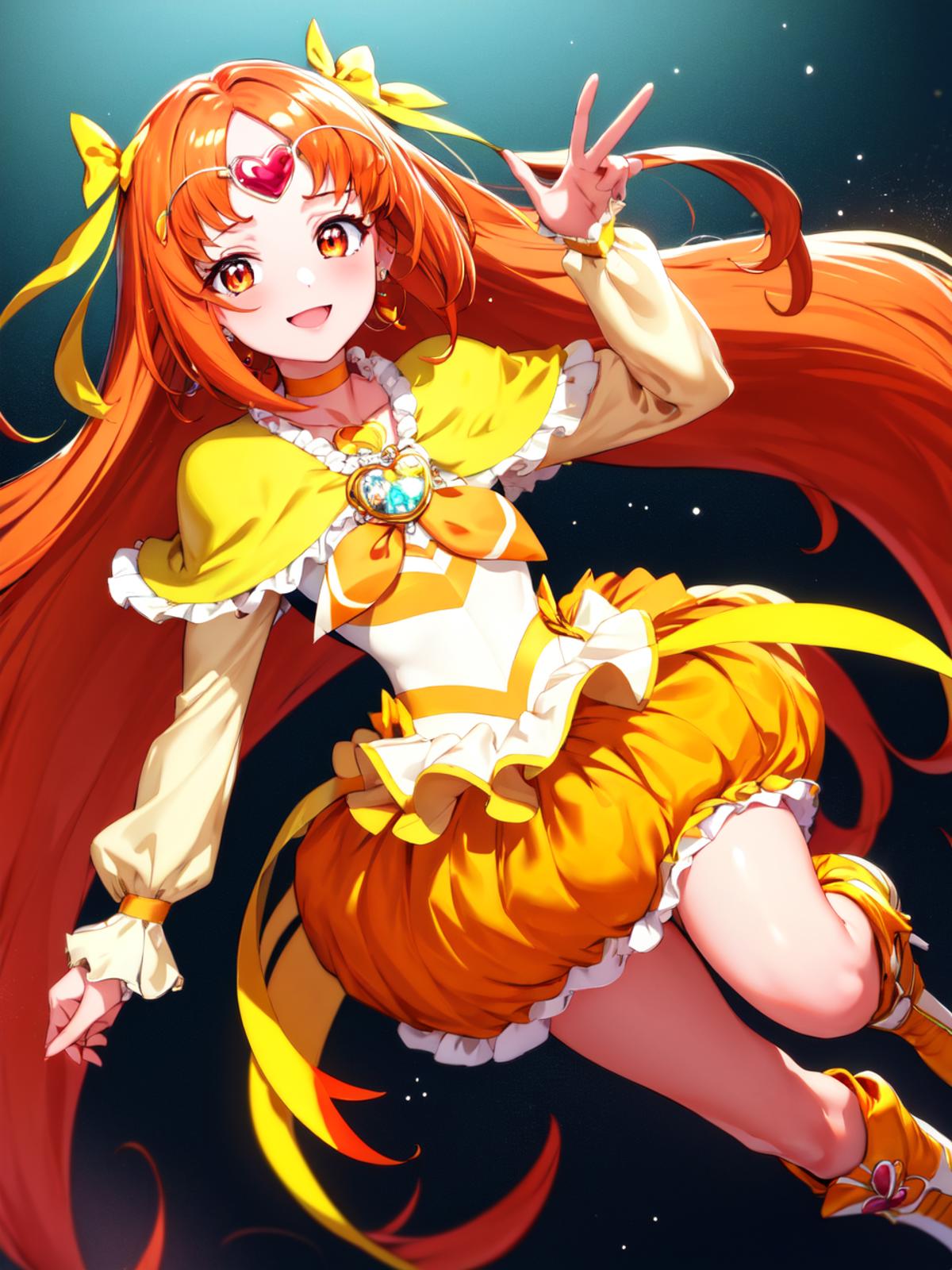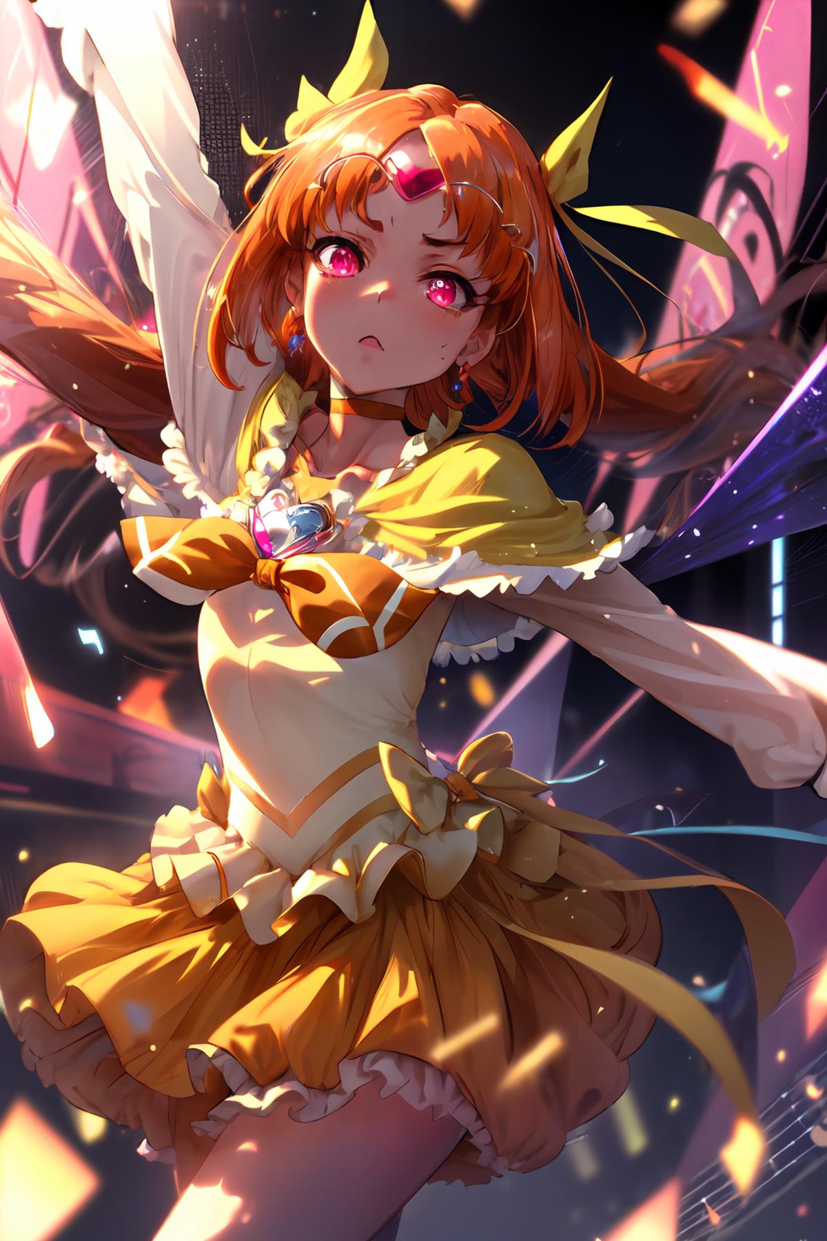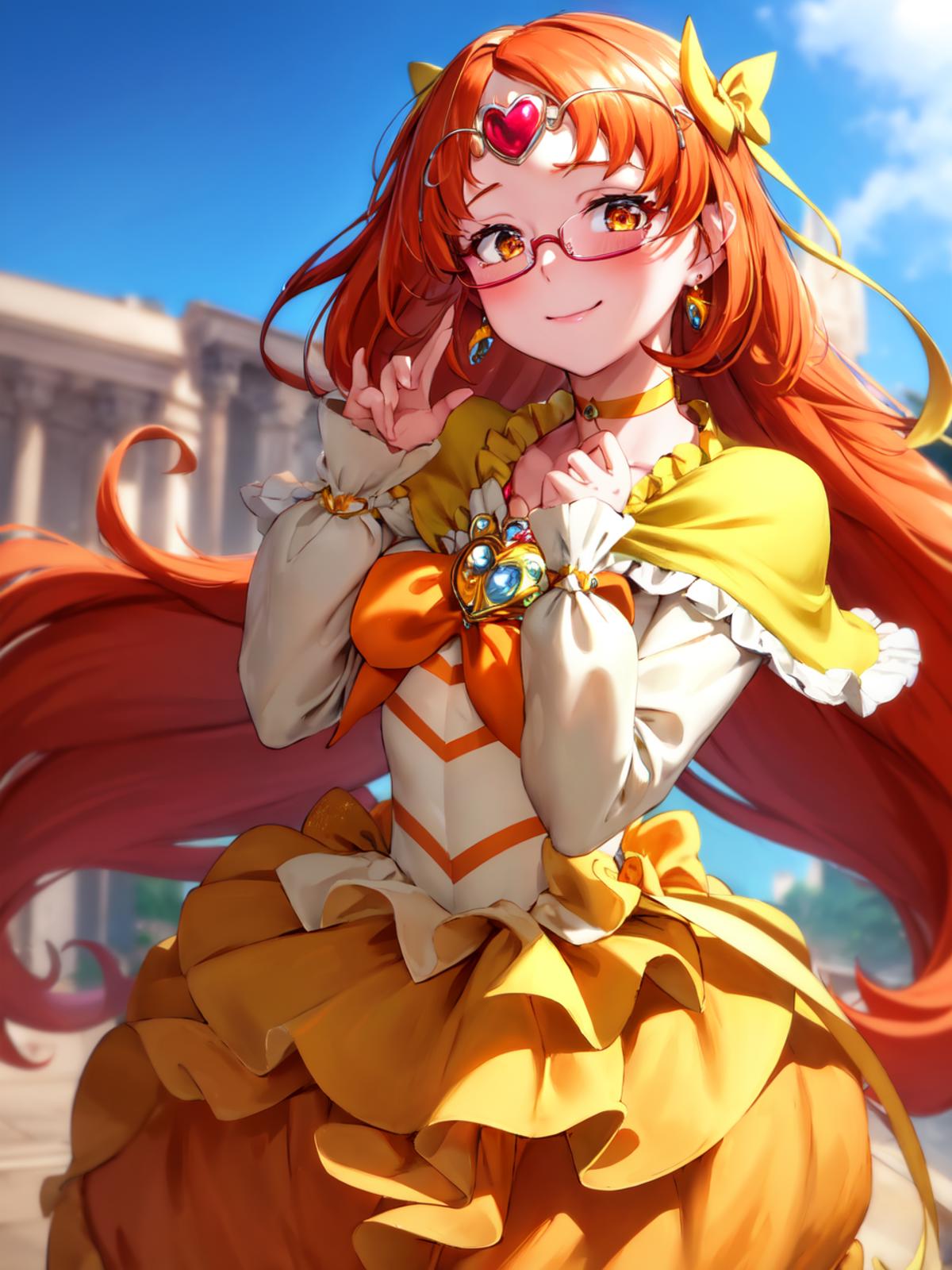 Recommend Tags: orange hair, hair ribbon, yellow choker, jewelry, brooch, capelet, tiara, boots
