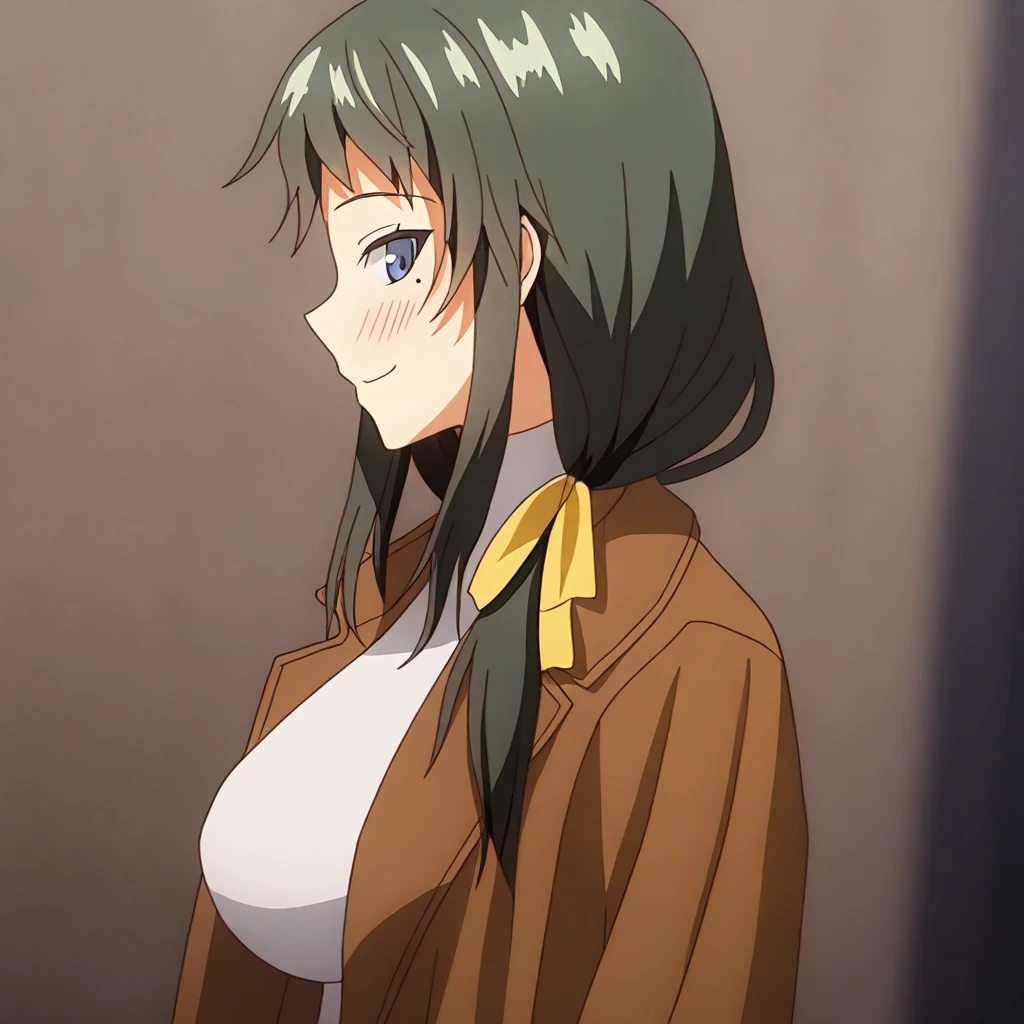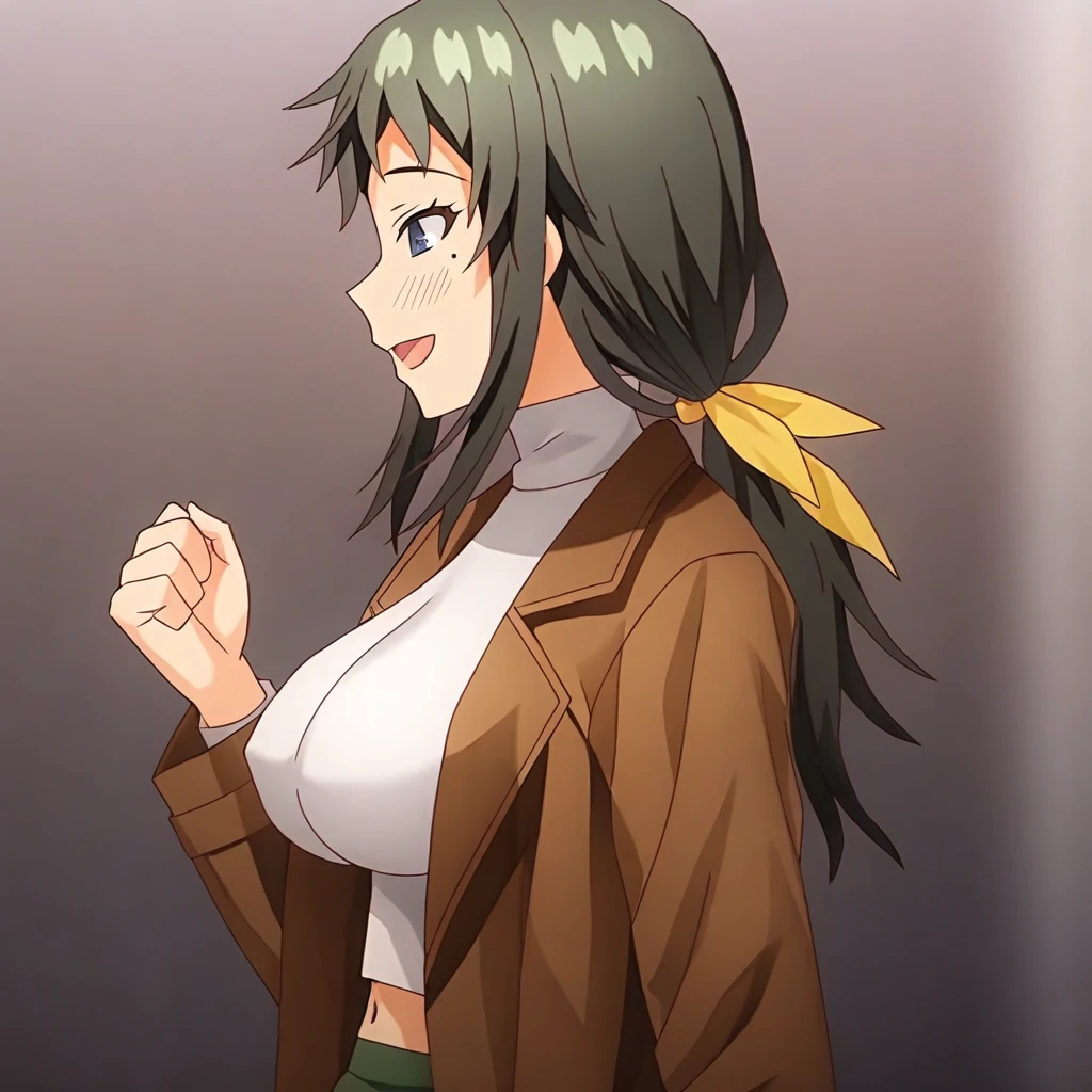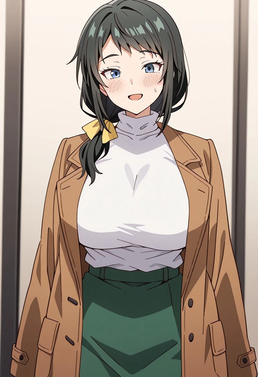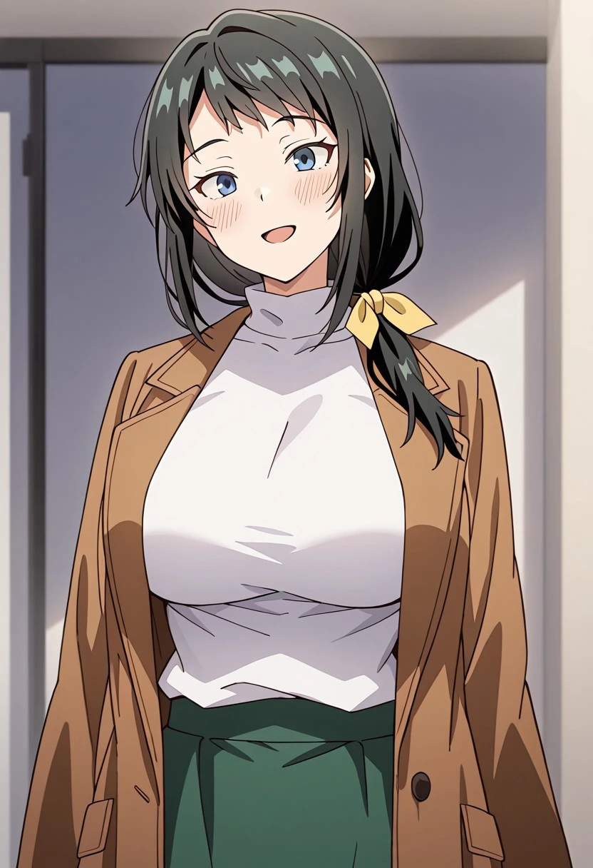 Nakamura Shiori, Nakamura Shiori, black hair, blue eyes, hair over shoulder, low ponytail, brown jacket, white shirt, green skirt, yellow ribbon,
