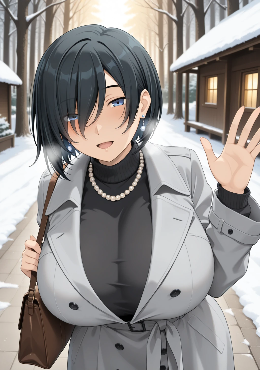 huge breasts,short hair,hair between eyes, bangs,hair over one eye,black hair,blue eyes