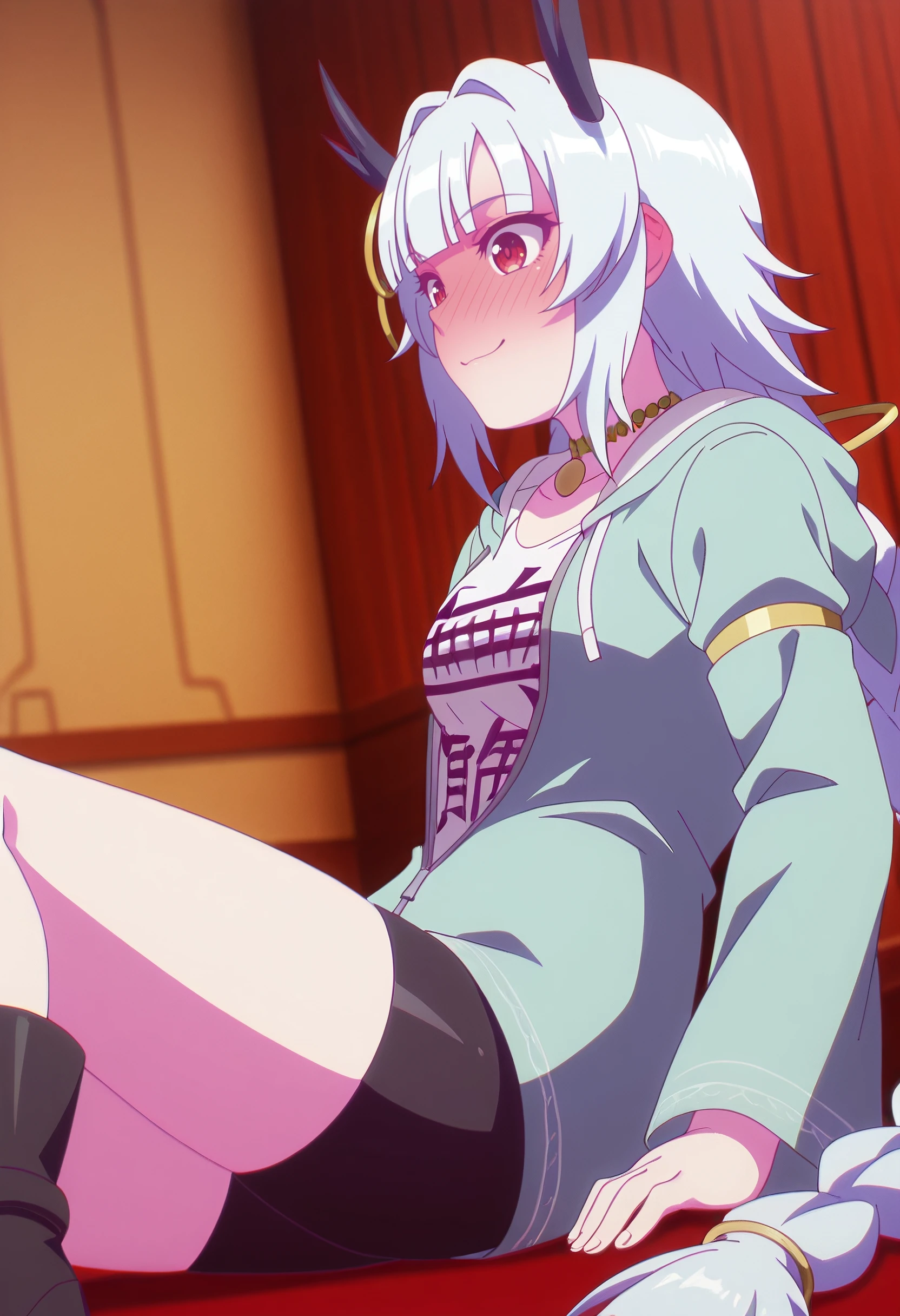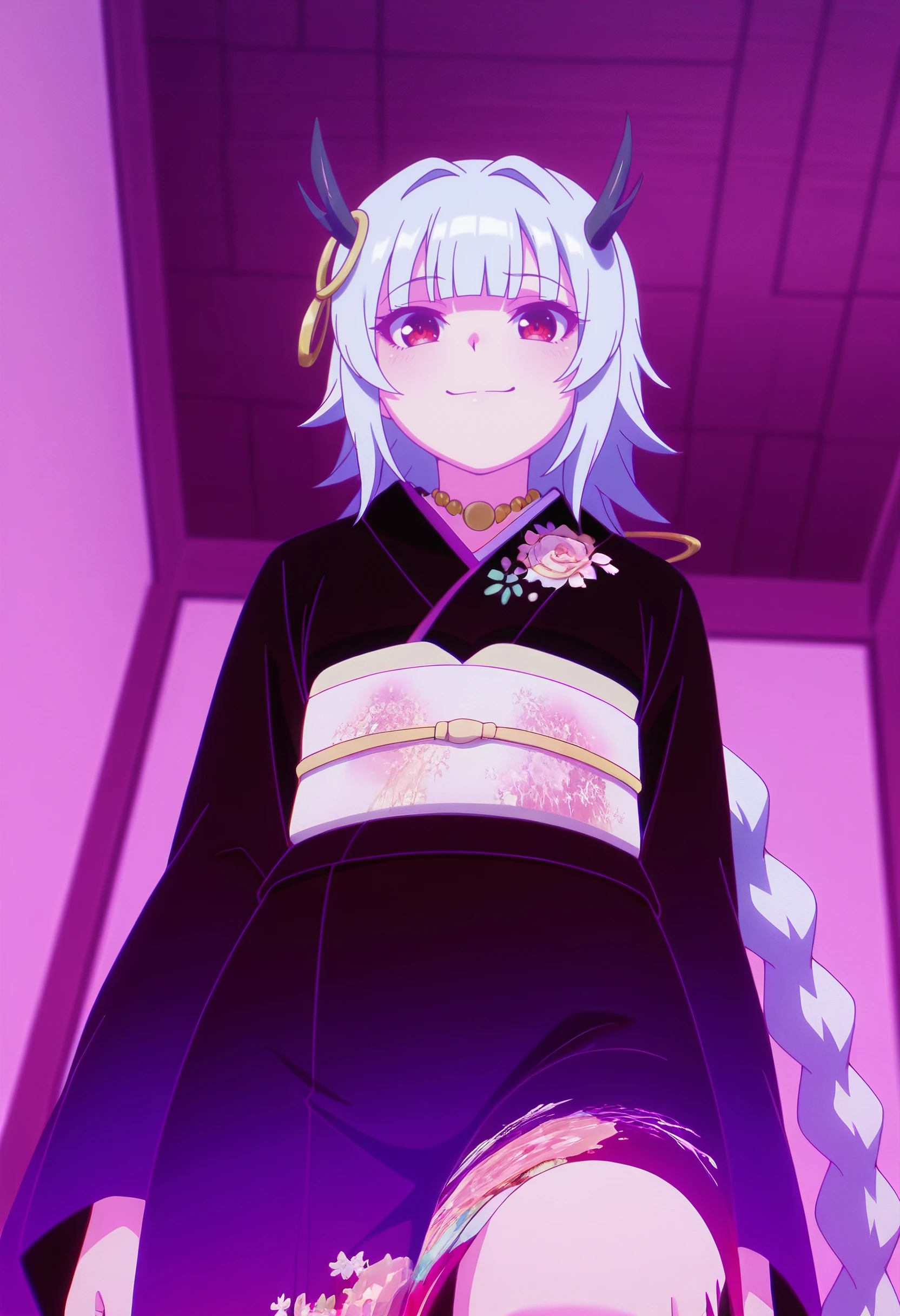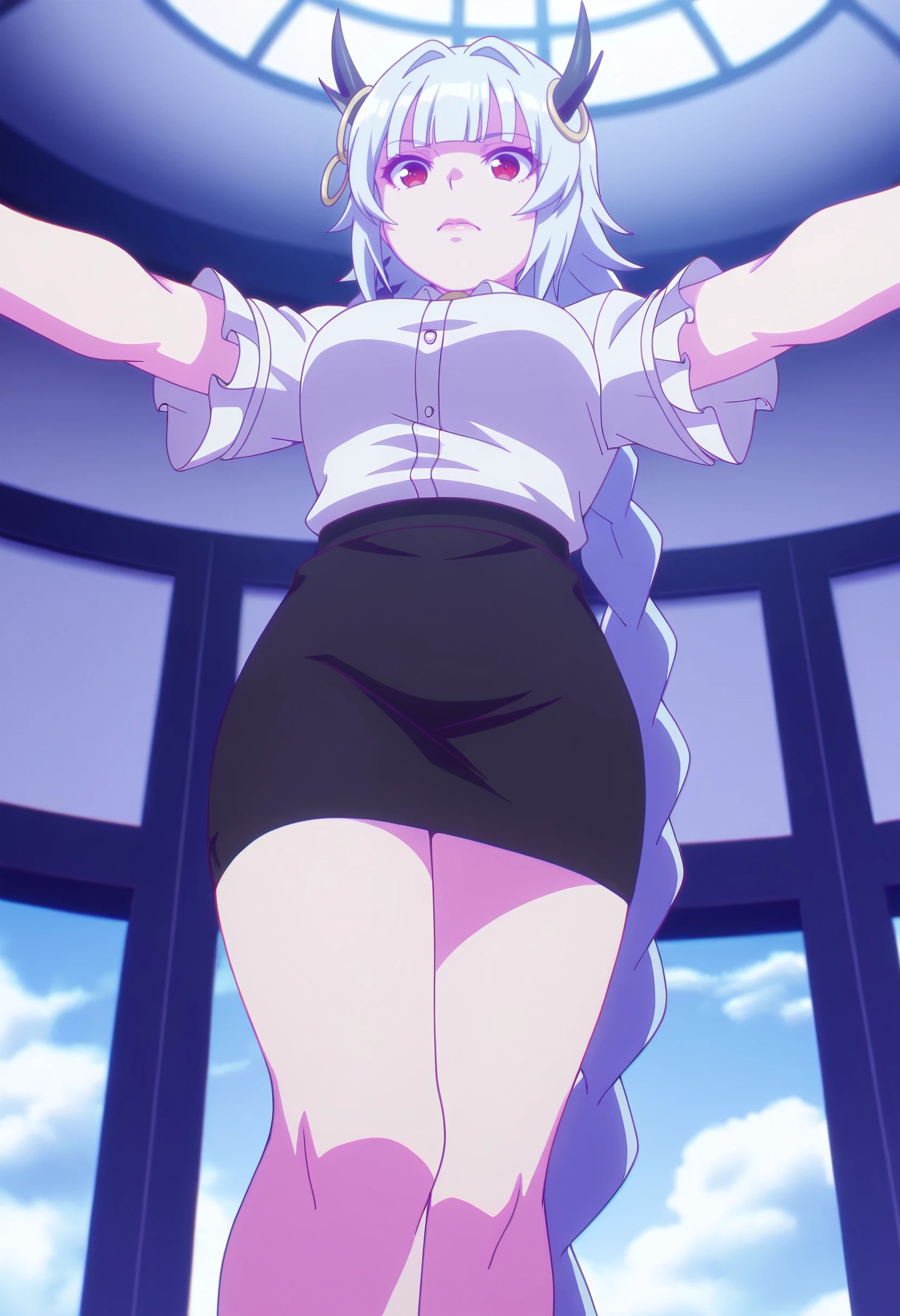 KWGUroboros, blue hair, long hair, hair ornament, braid, red eyes, blunt bangs, white hair, multicolored hair, single braid, braided ponytail, hair intakes, dragon girl, horns, dragon horns, black horns,